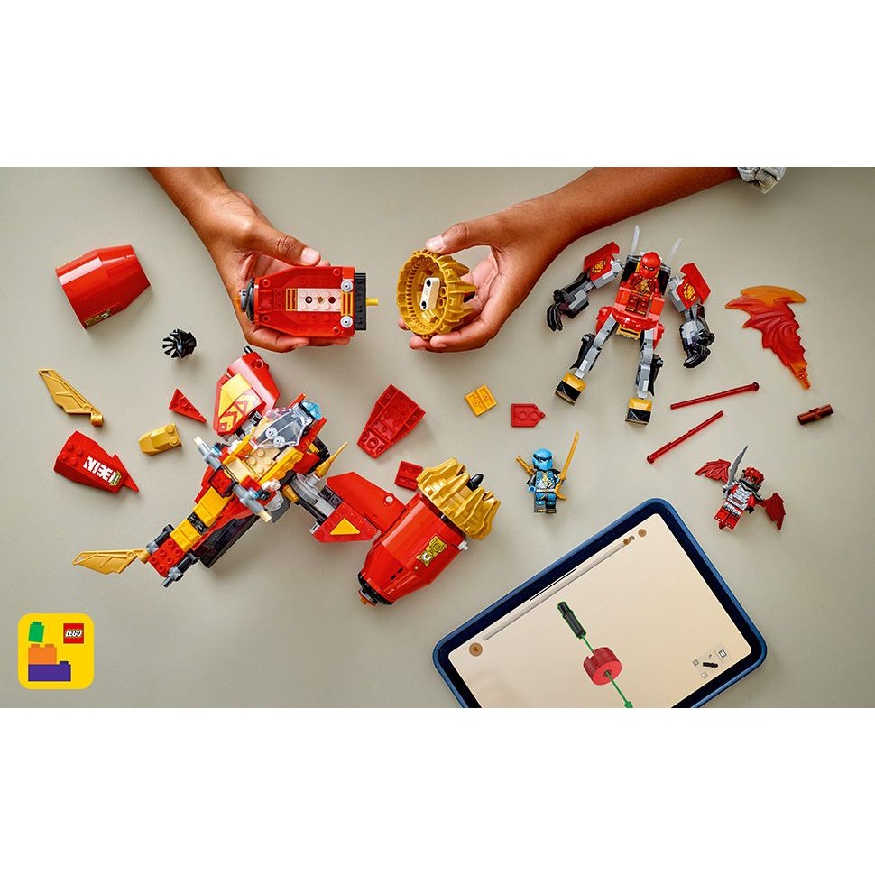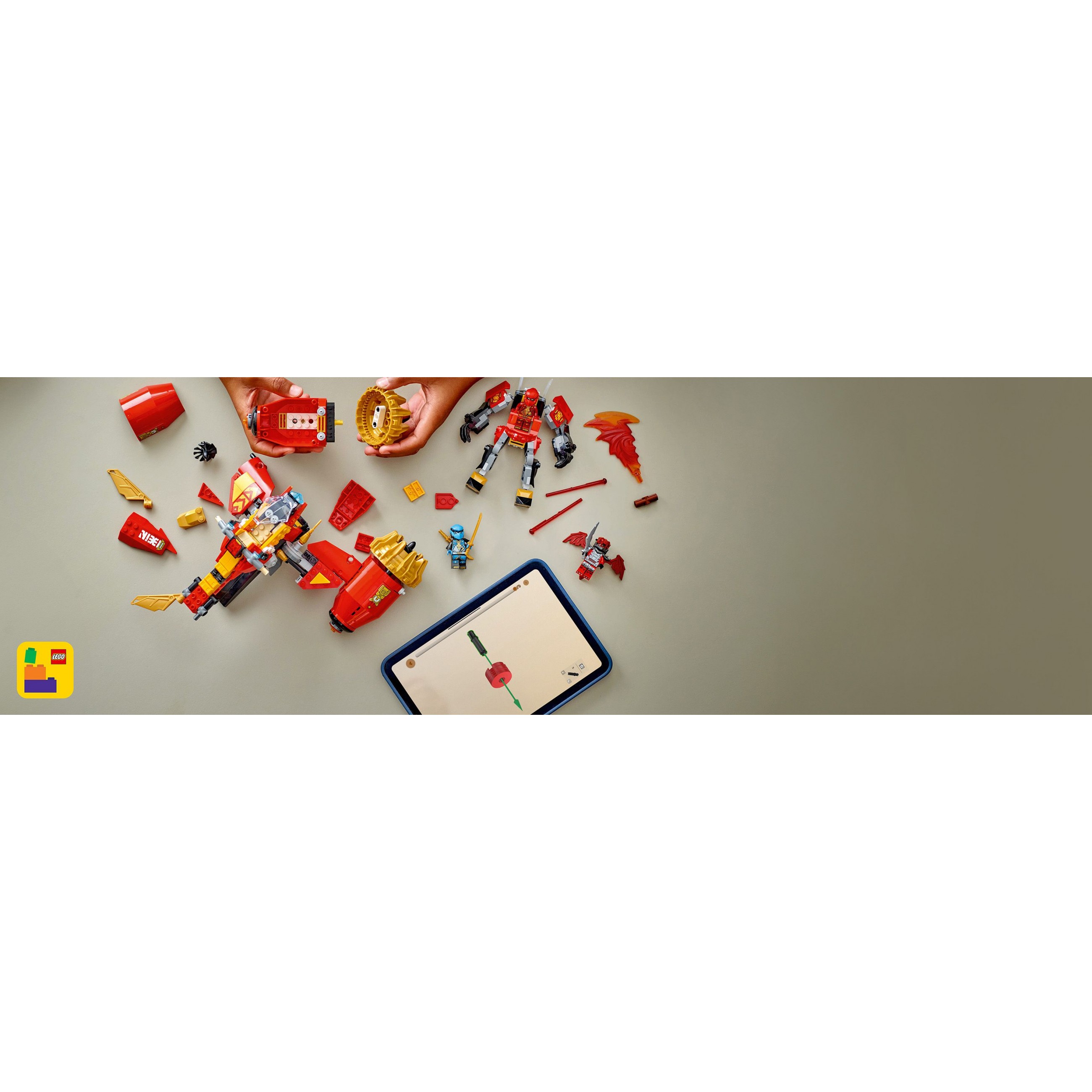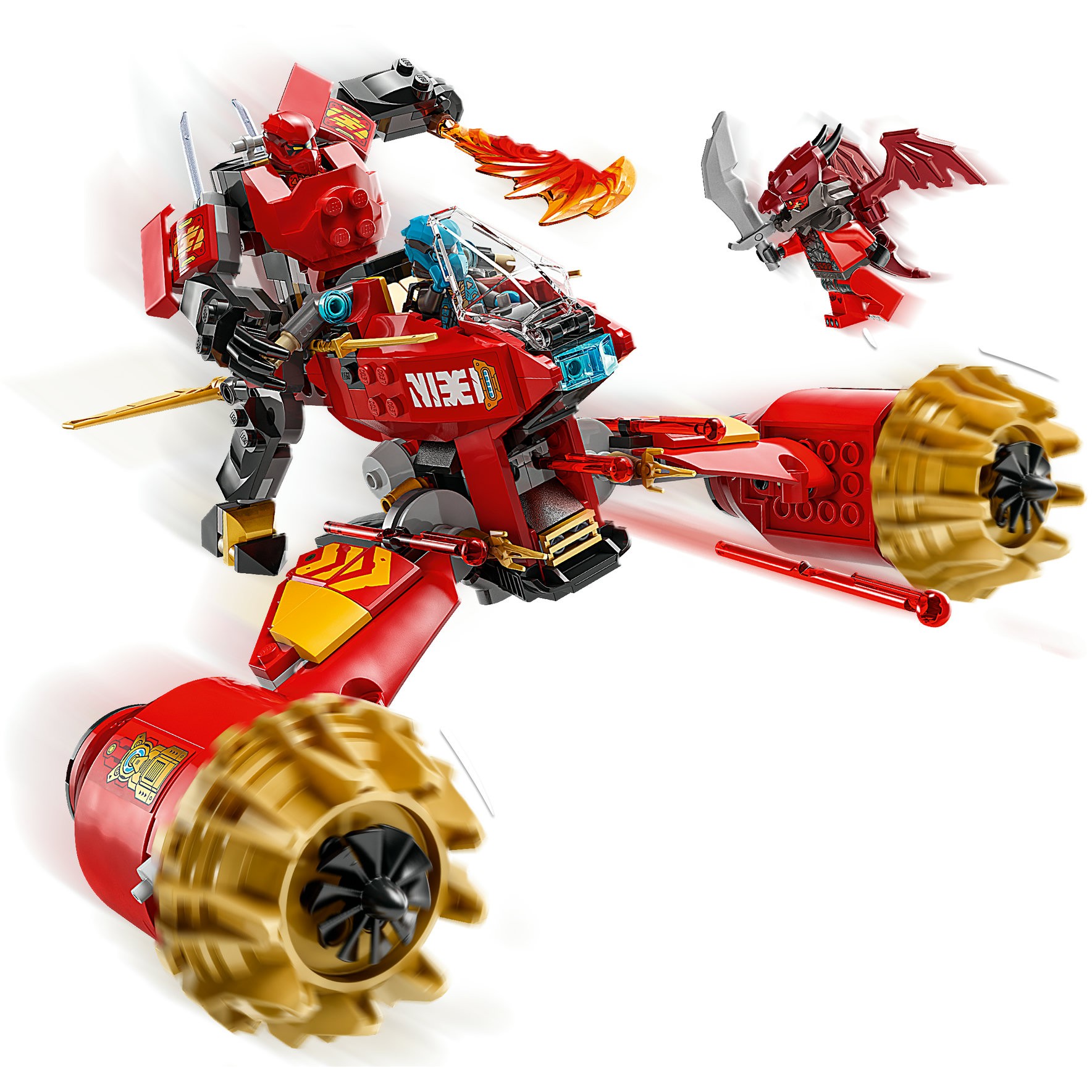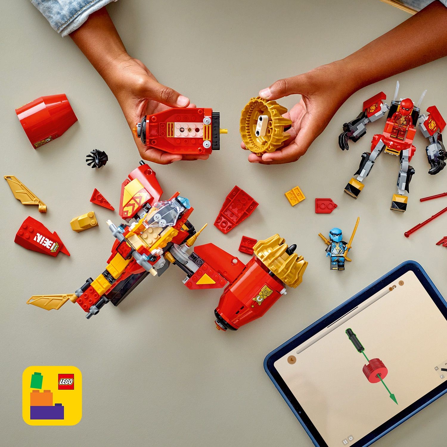 Ninja-Kombi-Mech: Dieses große NINJAGO® Actionspielzeug lässt sich in 2 kleinere Modelle zerteilen. Kais Mech und Nyas fliegendes Motorrad bieten Kinder noch viele weitere spannende Ninja-Abenteuer und Rollenspiele