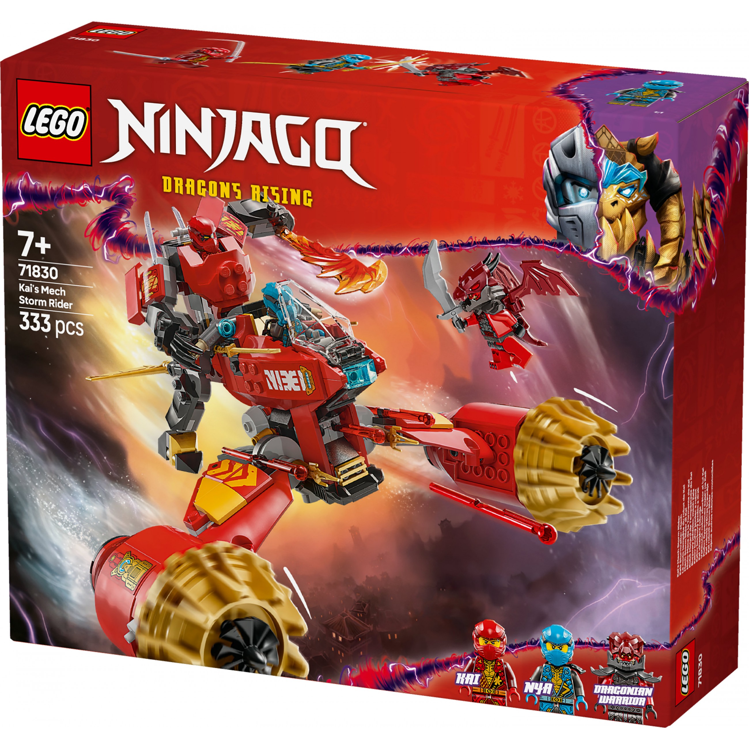 Kais Sturmreiter-Mech (71830) lässt Jungen und Mädchen ab 7 Jahren atemberaubende Szenen aus der TV-Serie NINJAGO® Aufstieg der Drachen nachstellen. Kinder können mit der großen Actionfigur spielen und den Mech dann in zwei kleinere Modelle zerteilen. Kais Mech hat ein Cockpit sowie ein große Sturmklinge und kann Kopf, Arme und Beine bewegen. Nyas fliegendes Motorrad hat neben einem Cockpit auch noch bewegliche Flügel und 2 Shooter mit Federmechanismus.