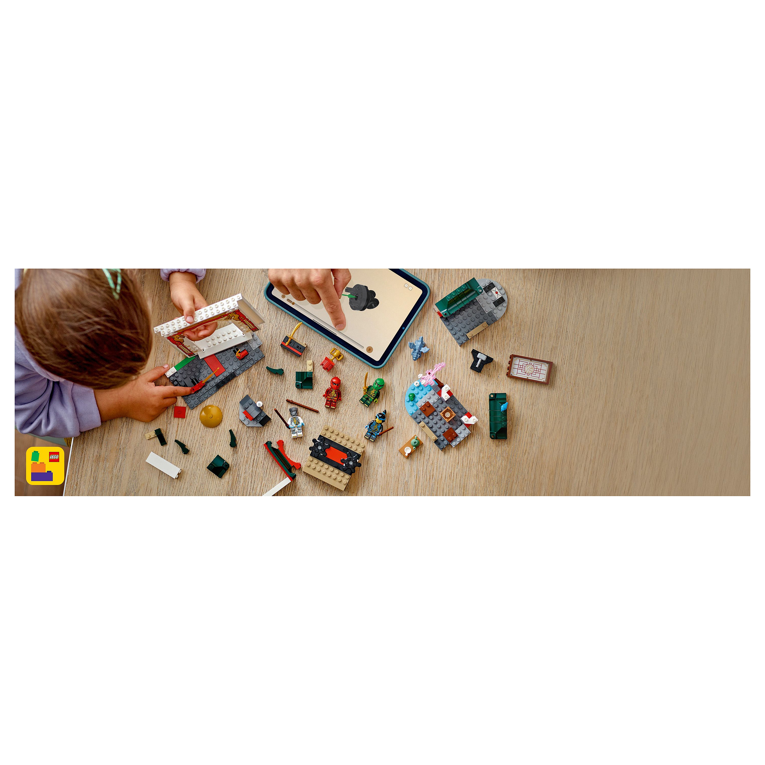 Dieses LEGO Set beinhaltet 4 NINJAGO Minifiguren: Zane, Nya, Kai und Lloyd sowie der Spielzeugdrache Baby Riyu laden zu vielen Actionrollenspielen ein. Für spannende Duelle kann man die Minifiguren auf 2 Drehteller stellen. Und auch die umfangreiche Ninja-Ausrüstung (unter anderem 2 Schwerter und 3 Stäbe) sowie ein Hammer, ein Vogel, ein Frosch, ein Siegerpokal, ein Keks und ein Brief bieten unzählige Spielmöglichkeiten.