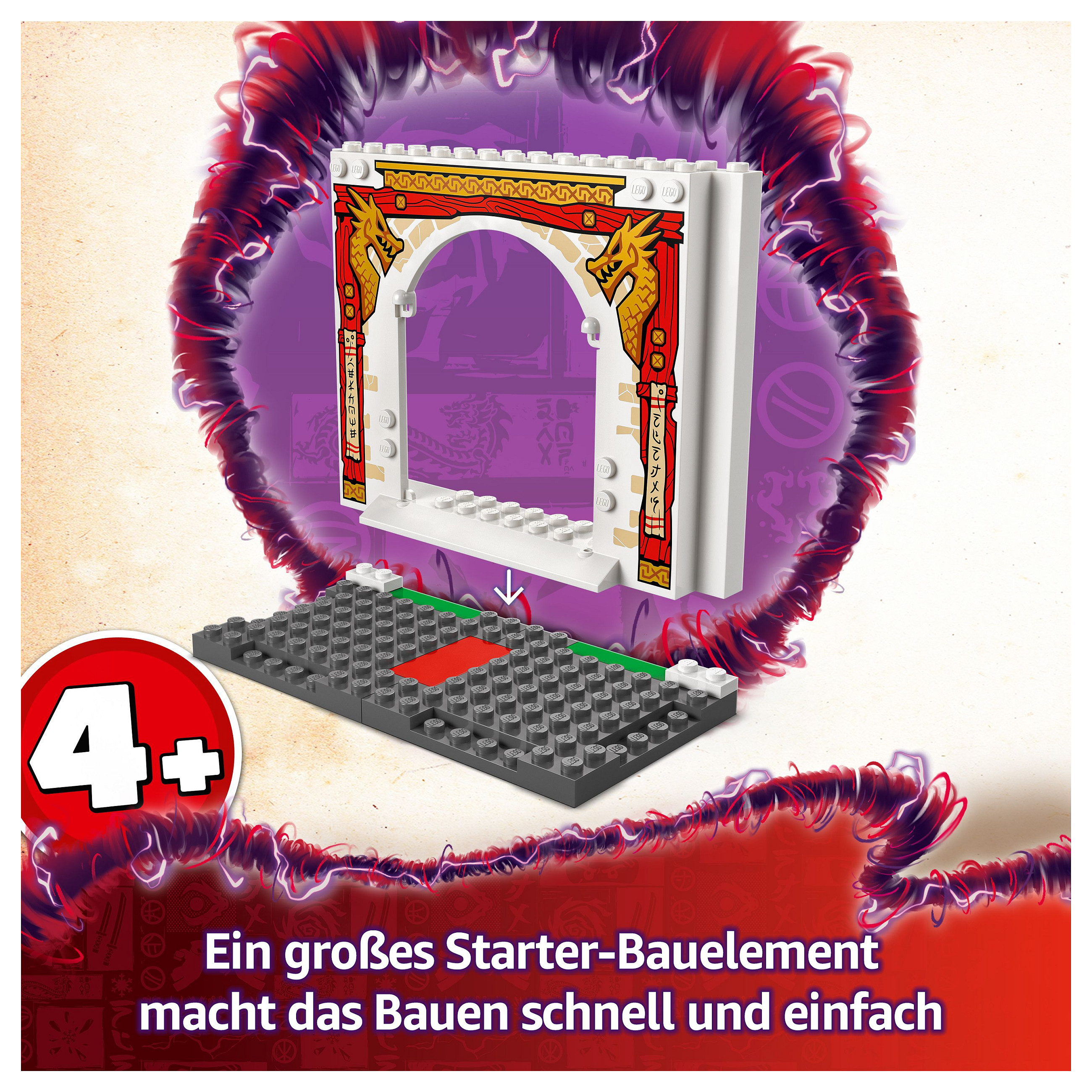 Dieses Ninja-Spielzeug soll Kindern ab 4 Jahren die Freude am Bauen mit LEGO Steinen entdecken lassen und ihnen ein tolles Spielerlebnis bieten. Dem Abenteuerspielzeug liegt auch ein Starter-Bauelement bei. Dabei handelt es sich um ein bereits teilweise zusammengesetztes Bauteil, das Kinder rasch und selbstbewusst bauen lässt.