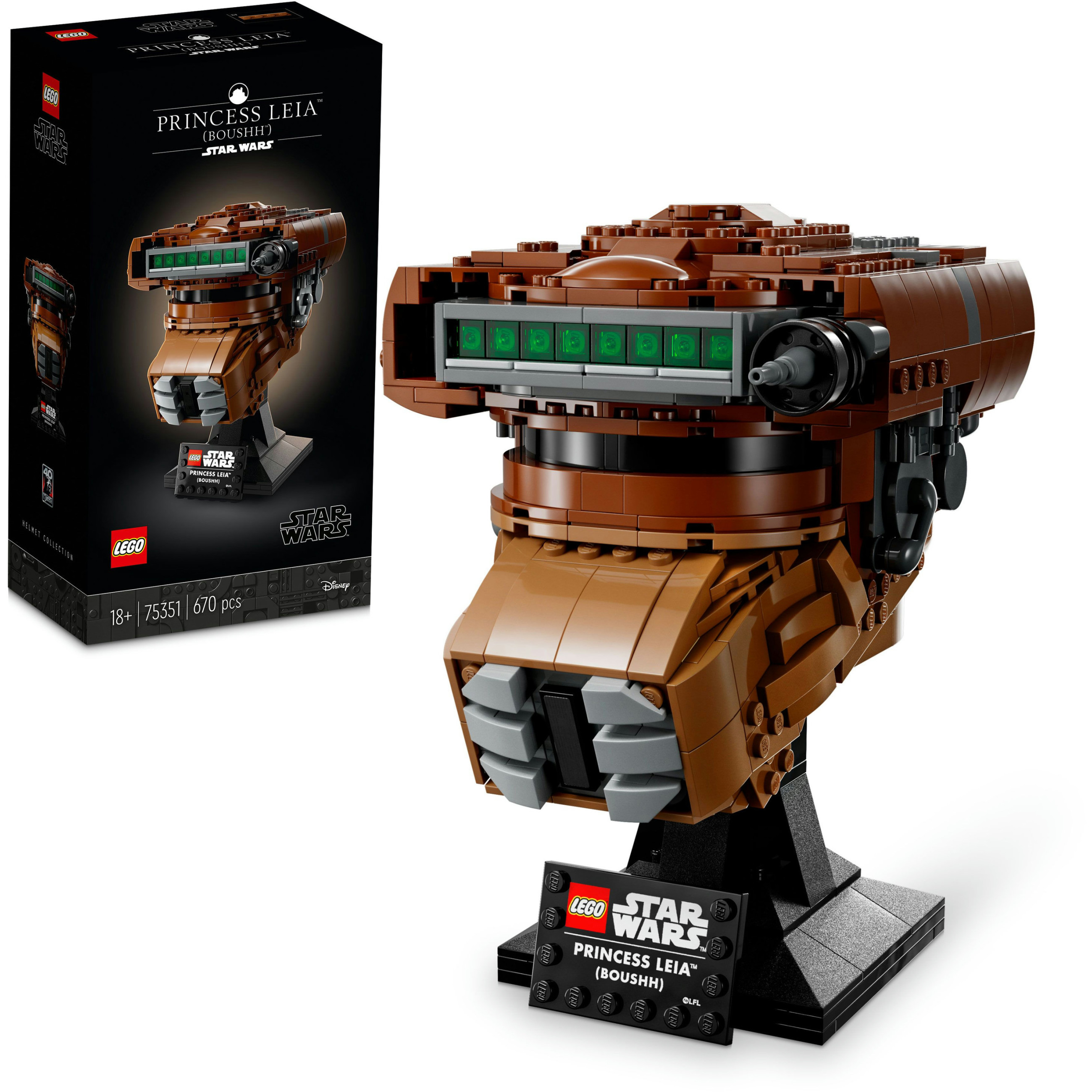 LEGO® Star Wars™ Princess Leia (Boushh) Helm (75351) ist ein Modell zum Bauen und Ausstellen für Erwachsene und eine tolle Hommage an einen legendären Charakter. Benutze all deine kreative Macht, um den Helm des Kopfgeldjägers nachzubilden, mit dem sich Prinzessin Leia verkleidet hat, um in Star Wars: Die Rückkehr der Jedi-Ritter unerkannt in den Palast von Jabba dem Hutten einzudringen. Ein baubarer Ständer mit Namensschild vollendet den eindrucksvollen Blickfang.