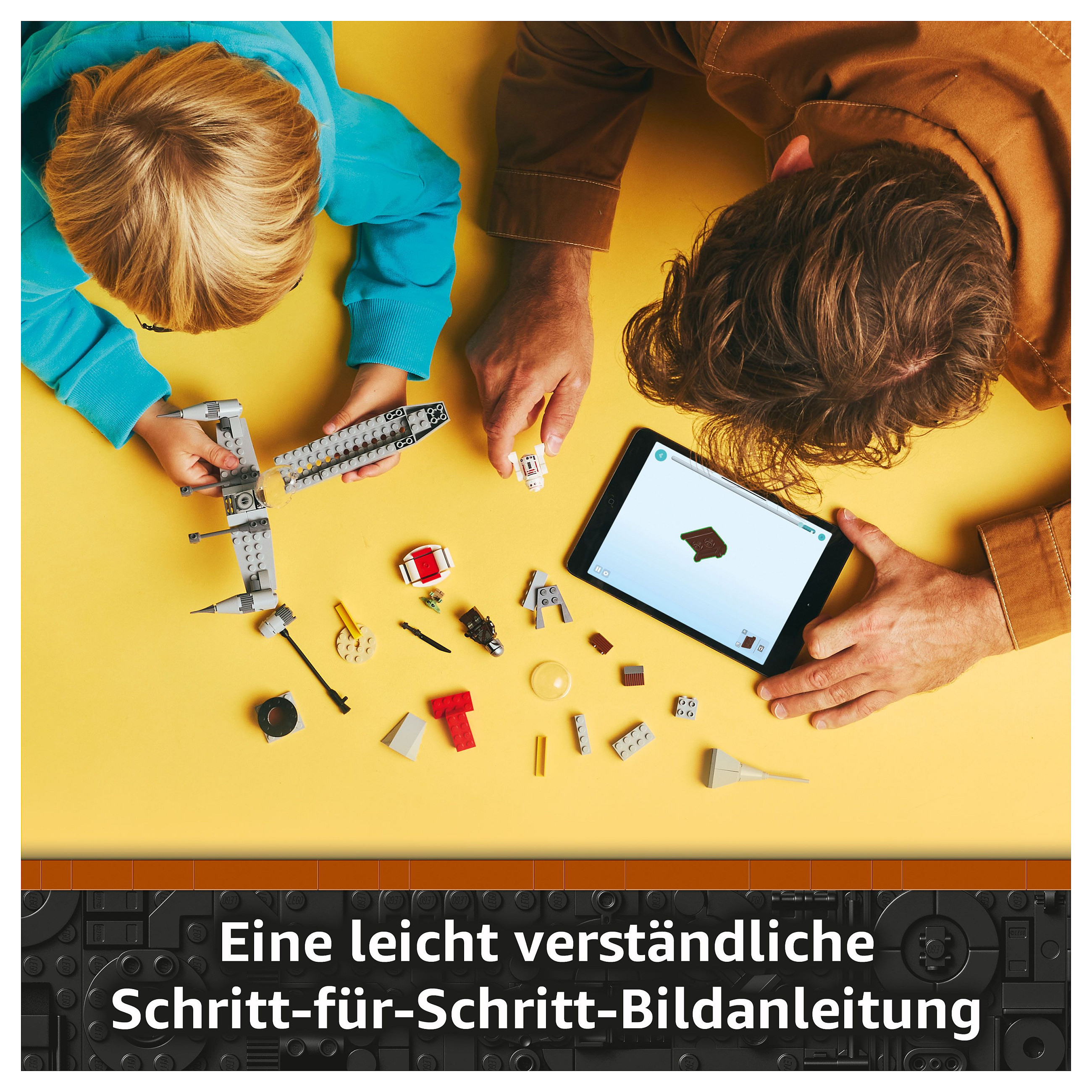 Bauset mit einem einfachen Modell eines Sternenjägers für junge Kinder: Der Star Wars™ Starfighter hat ein aufklappbares Cockpit für den Mandalorianer und einen Passagiersitz für Grogu. Und ein Starter-Bauelement erleichtert das Bauen