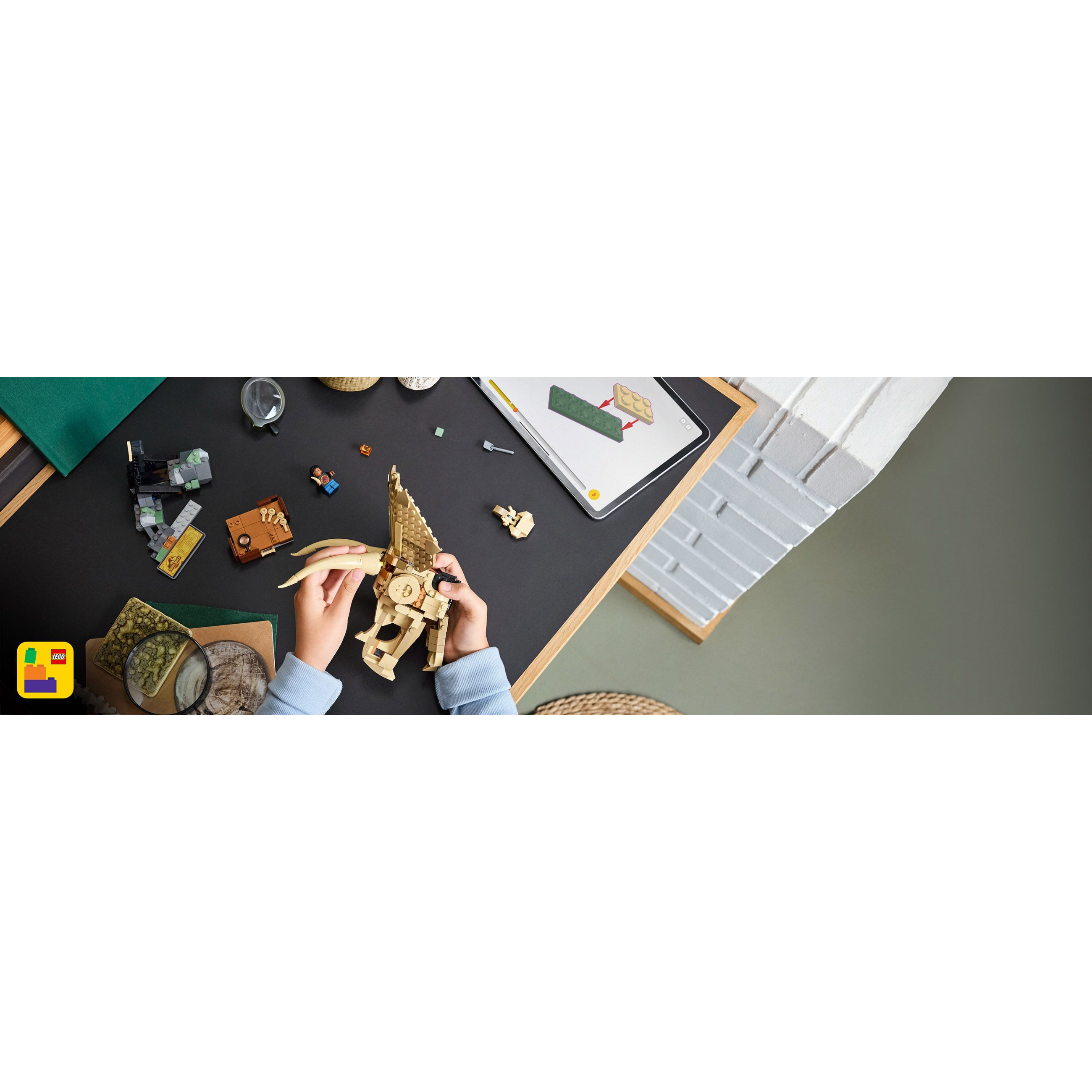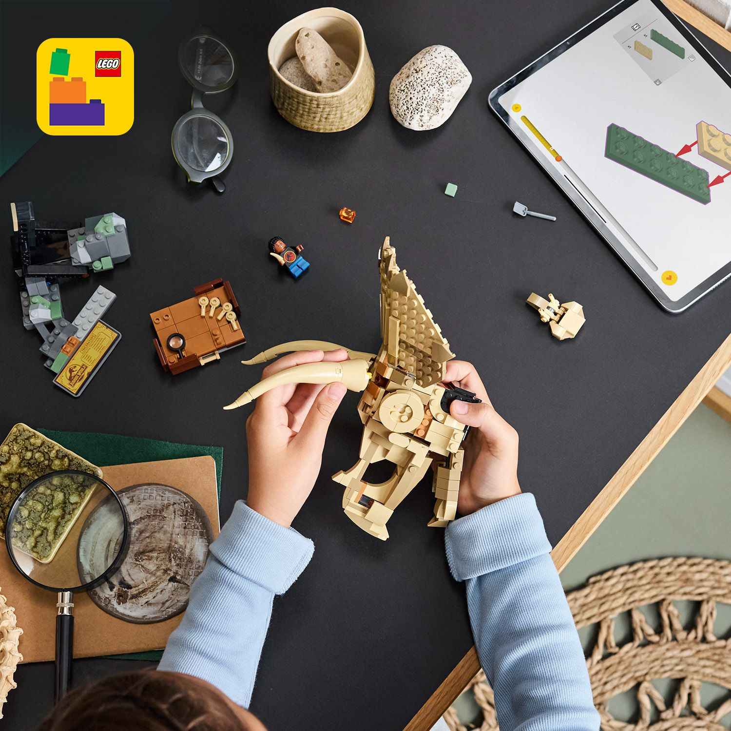 Dinosaurier-Bauset: Das Set beinhaltet einen Triceratops-Schädel mit Ständer, eine Infotafel, eine Ausgrabungsstätte mit Ausgrabungswerkzeugen, ein Stück „Bernstein“ und eine LEGO® Minifigur – eine Nachwuchspaläontologin