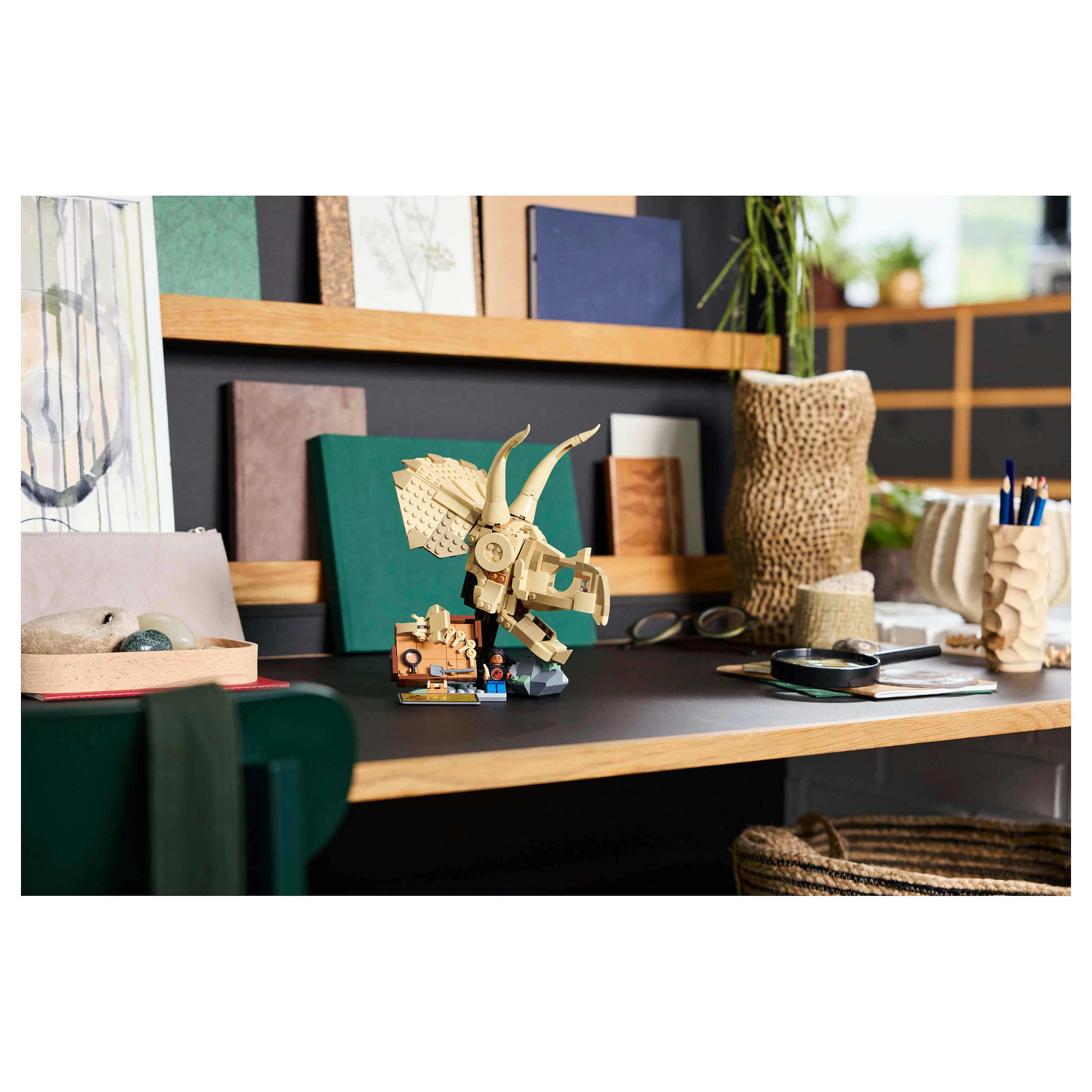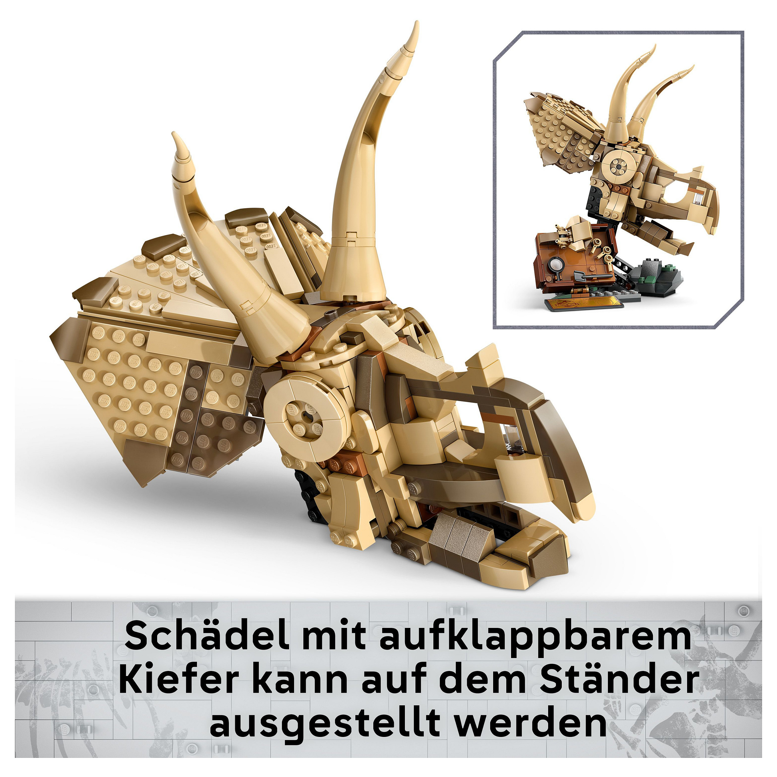 Triceratops-Schädel mit aufklappbarem Kiefer: Dieser Spielzeug-Schädel kann mit offenem oder geschlossenem Kiefer auf dem Ständer oder neben der Minifigur, der Ausgrabungsstätte, den Mini-Fossilien und den Ausgrabungswerkzeugen ausgestellt werden