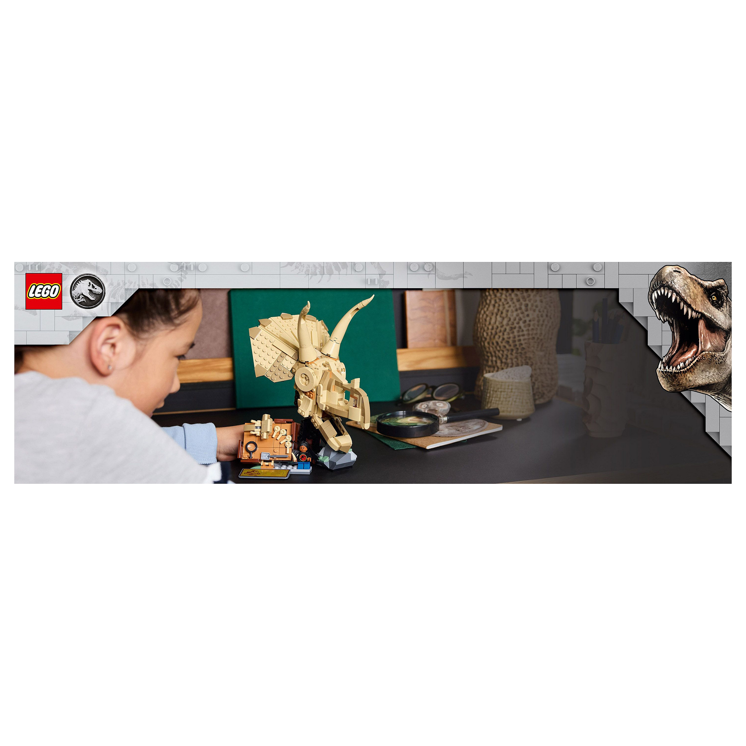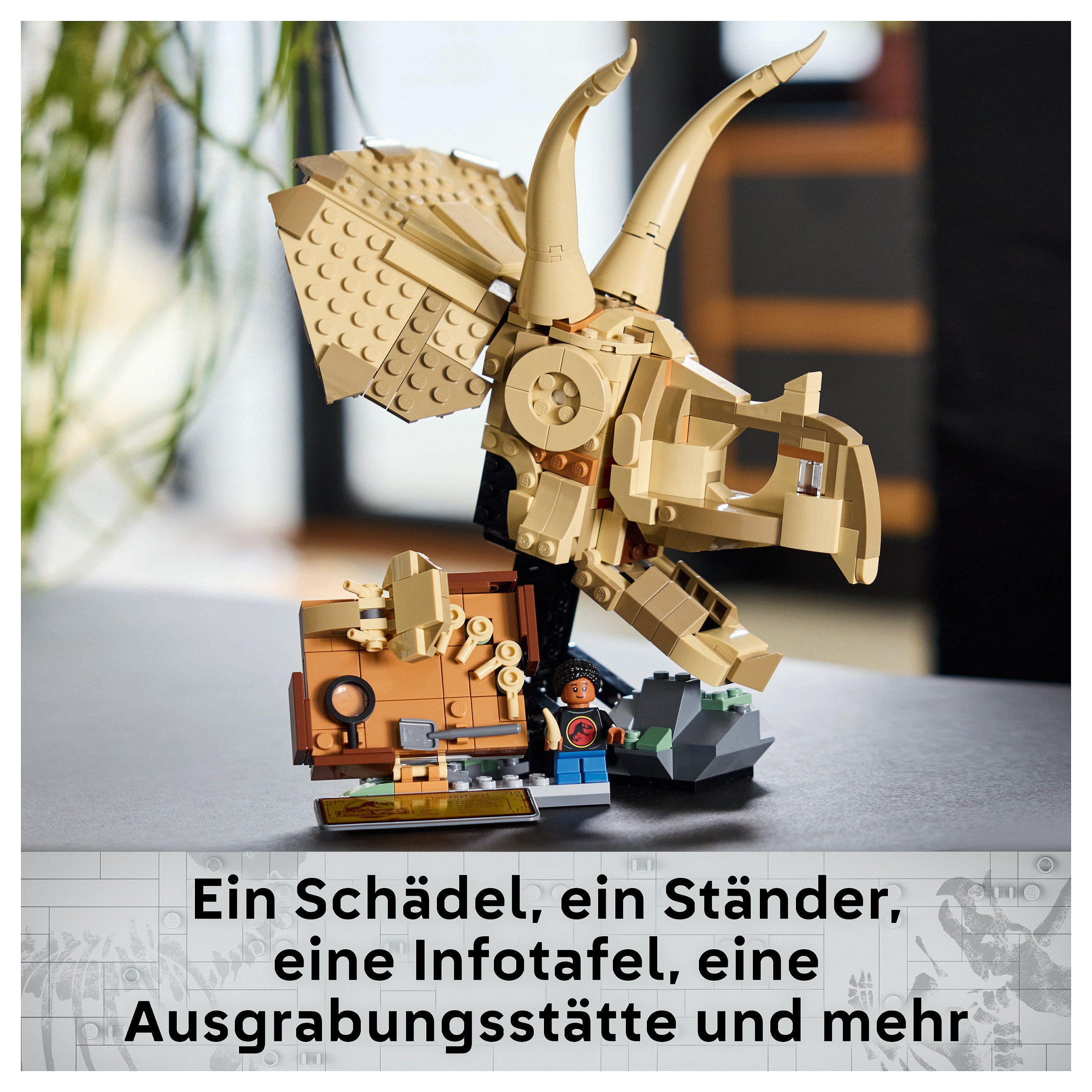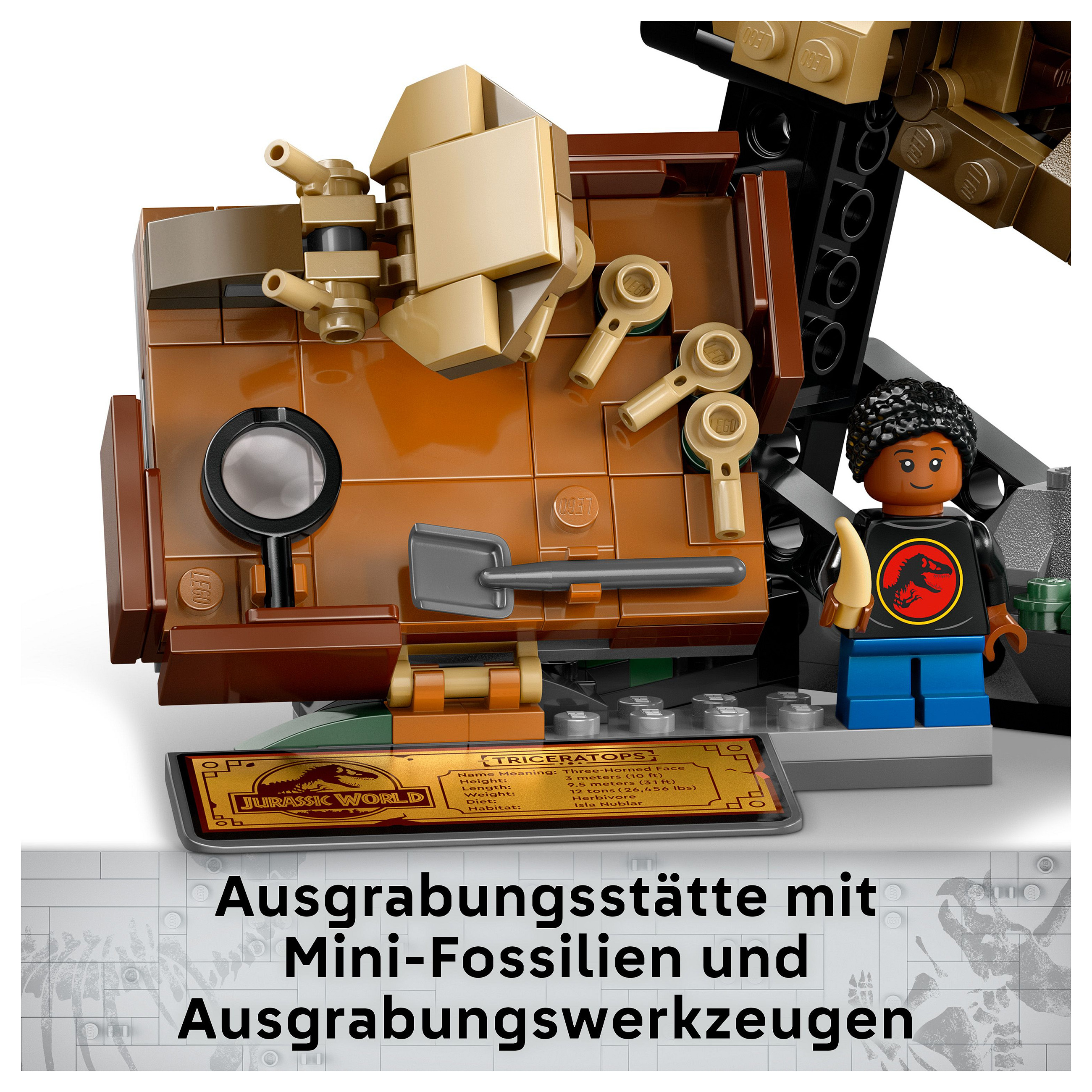 Dinosaurier-Fossilien: Triceratops-Schädel (76969) ist ein LEGO® Jurassic World Bauset, das jungen Paläontologen ein fantasievolles Jurassic World Spielerlebnis bietet und das Kinder Dinosaurier-Fossilien sammeln lässt. Dieses Spielset aus der Reihe der Dinosaurier-Fossilien beinhaltet neben dem Triceratops-Schädel mit aufklappbarem Kiefer auch einen Ständer auf einem Felssockel, eine Ausgrabungsstätte mit Mini-Fossilien und Ausgrabungswerkzeugen, eine LEGO Minifigur, eine Infotafel und ein Stück „Bernstein“, in das eine Mücke eingebettet ist.