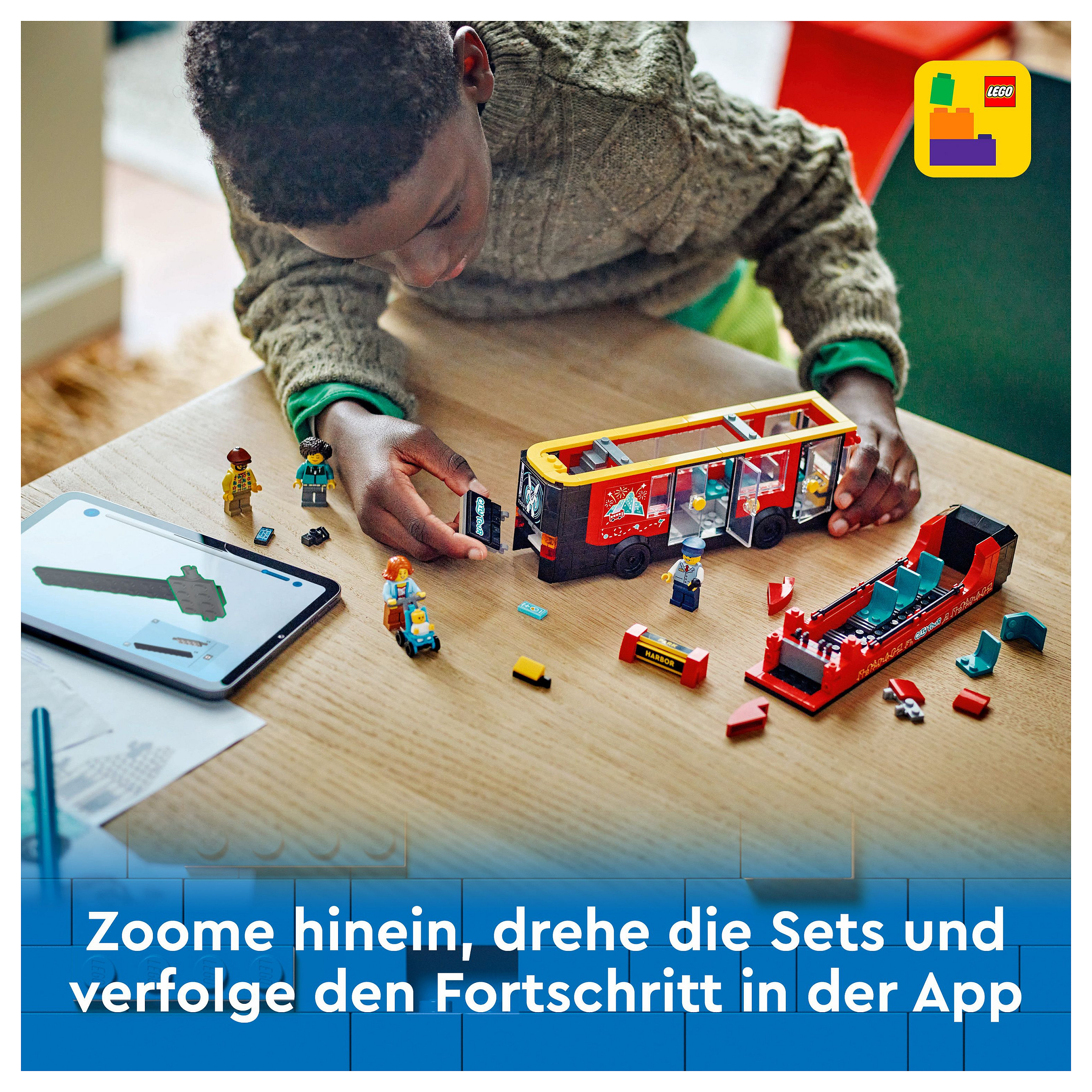 Zu diesem LEGO City Spielzeugbus ist neben einer gedruckten Schritt-für-Schritt-Anleitung auch eine 3D-Bauanleitung in der LEGO Builder App verfügbar. Intuitiv nutzbare Vergrößerungs- und Drehfunktionen lassen Kinder beim Bauen digitale Modellansichten aus jedem Winkel betrachten.