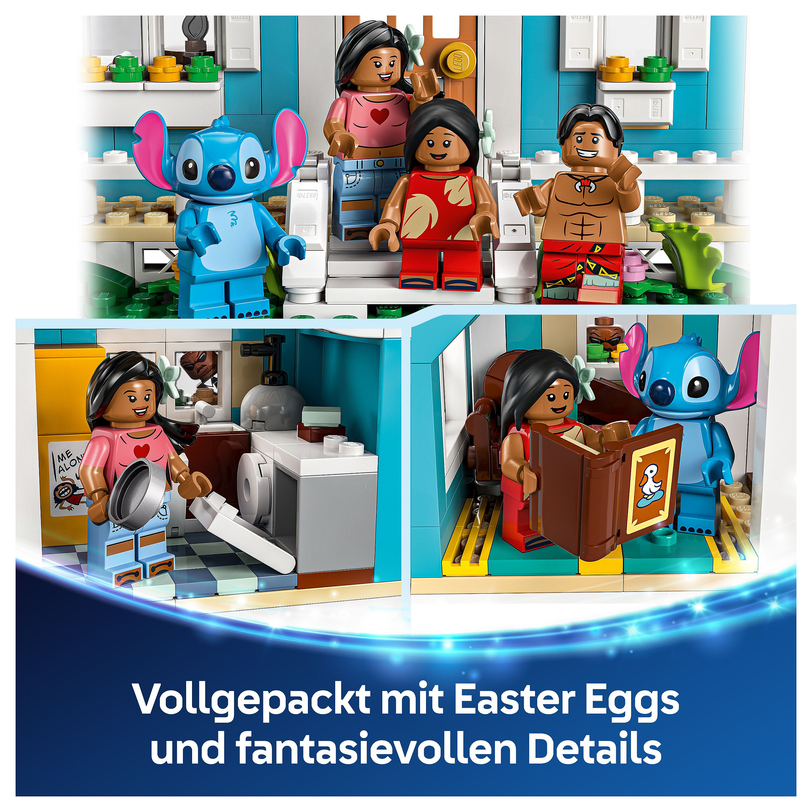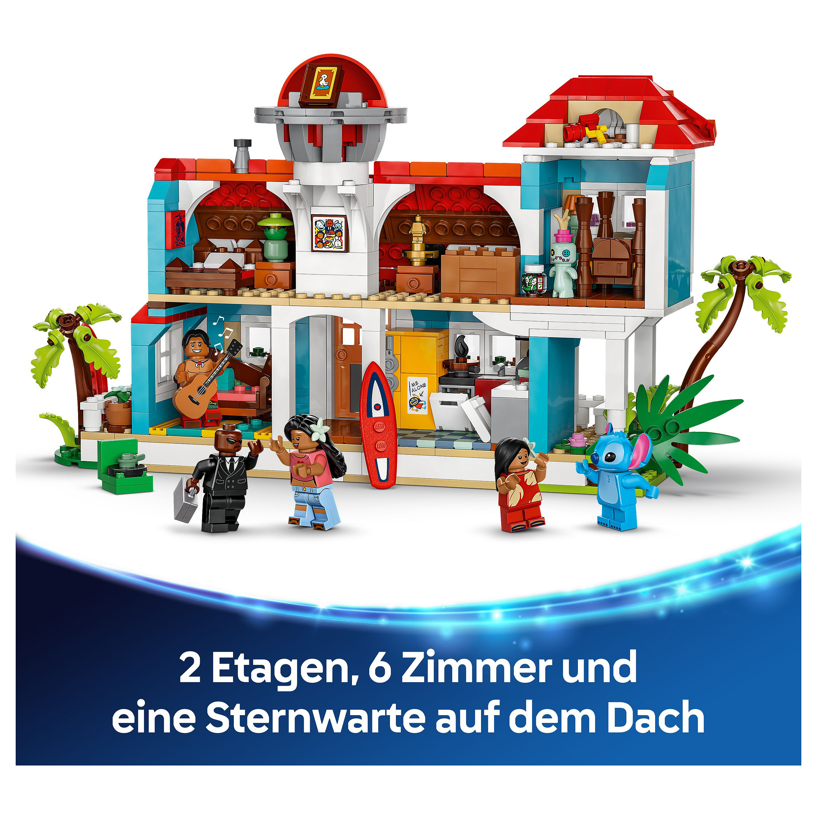 Bau- und Spielset: Neben dem baubaren Haus mit 6 Zimmern und Sternwarte für das Raumschiff auf dem Dach beinhaltet das Set auch die LEGO® ǀ Disney Minifiguren Lilo, Stitch, Nani, David und Herr Bobo