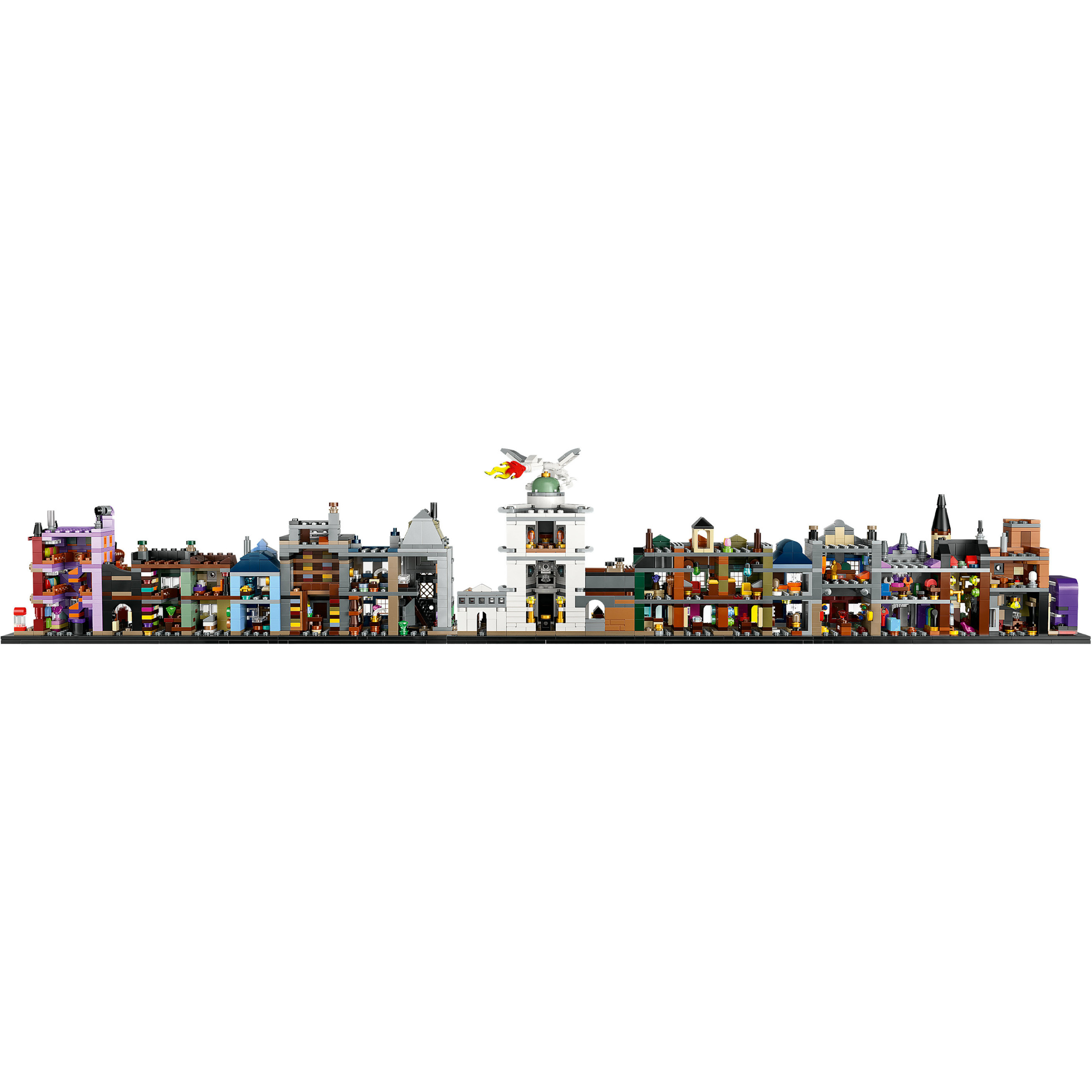 Dieses magische Modell zum Ausstellen ist ein imposanter Hingucker. Du kannst die Winkelgasse entweder mit beiden Straßenseiten oder als eine einzige lange Häuserzeile ausstellen. Oder du zerteilst die Gasse in 5 Segmente, um die Läden näher zu betrachten. Die 12 einzigartigen LEGO Harry Potter Mikrofiguren und der Fahrende Ritter™ werden dir viele klassische Filmszenen in Erinnerung rufen.