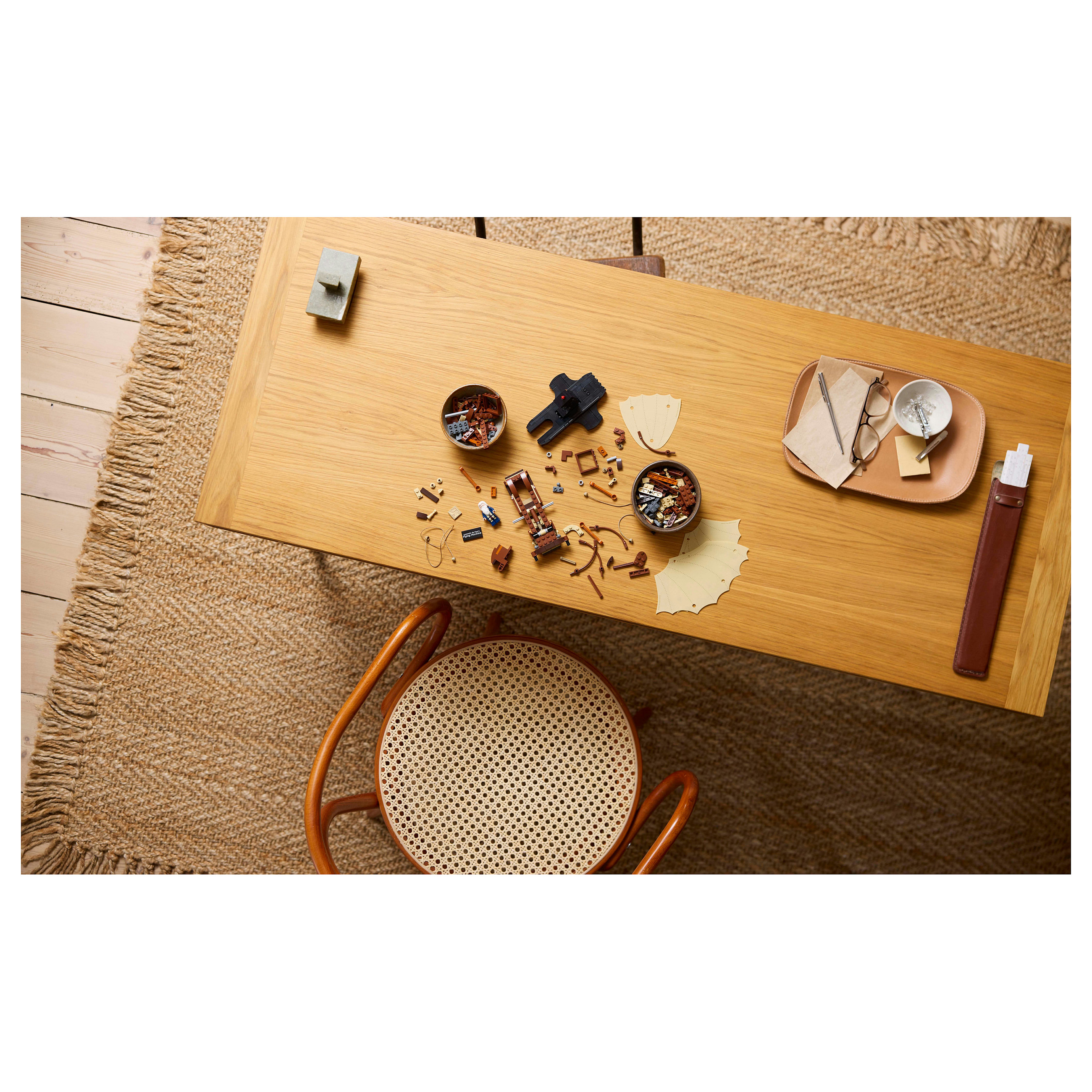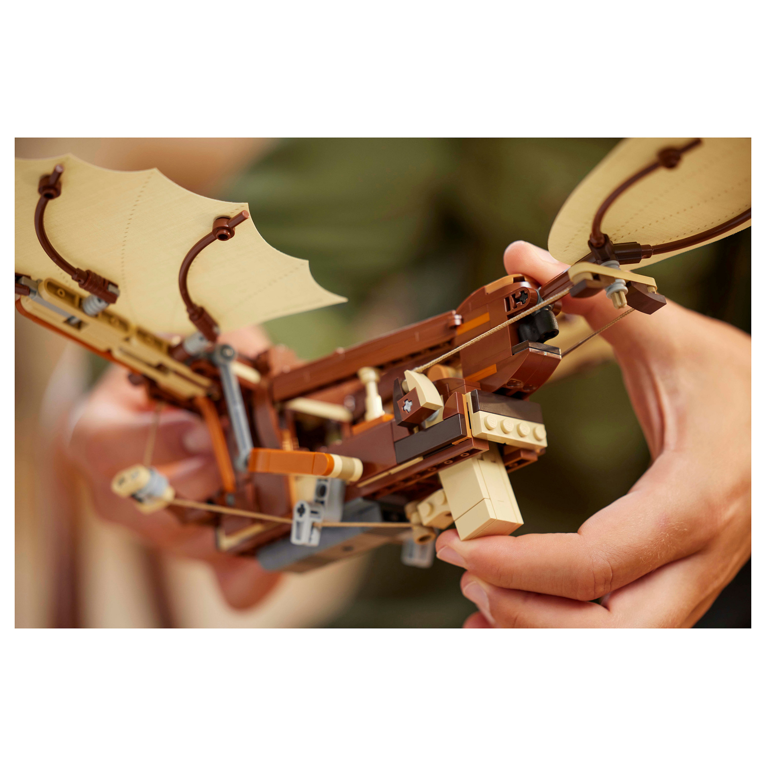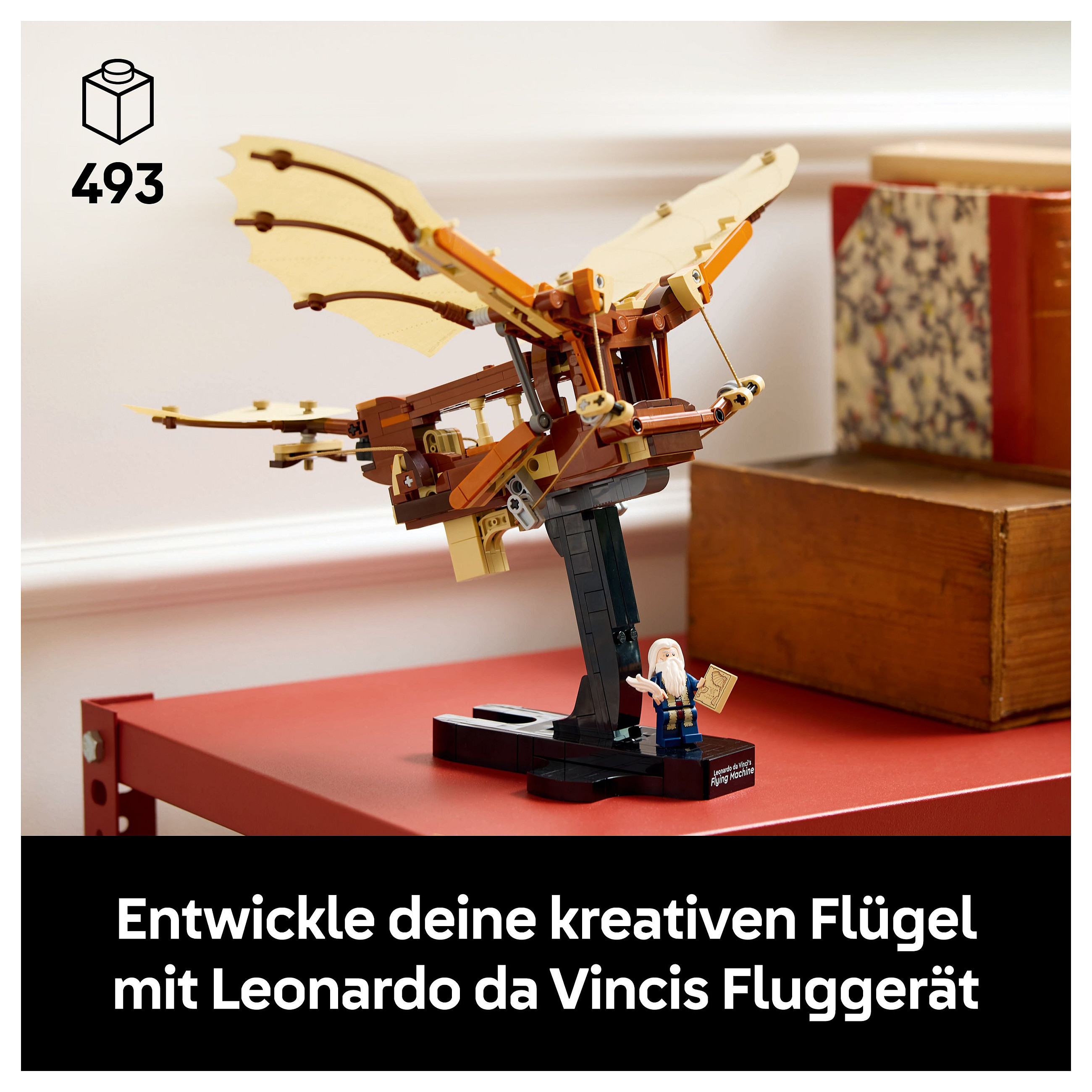 Inhalt der Box: Alles, was du brauchst, um eine detailgetreue LEGO® Interpretation von da Vincis visionärem Schwingenflügler zu bauen, sowie ein Ständer und die Minifigur Leonardo da Vinci mit Feder und Skizze