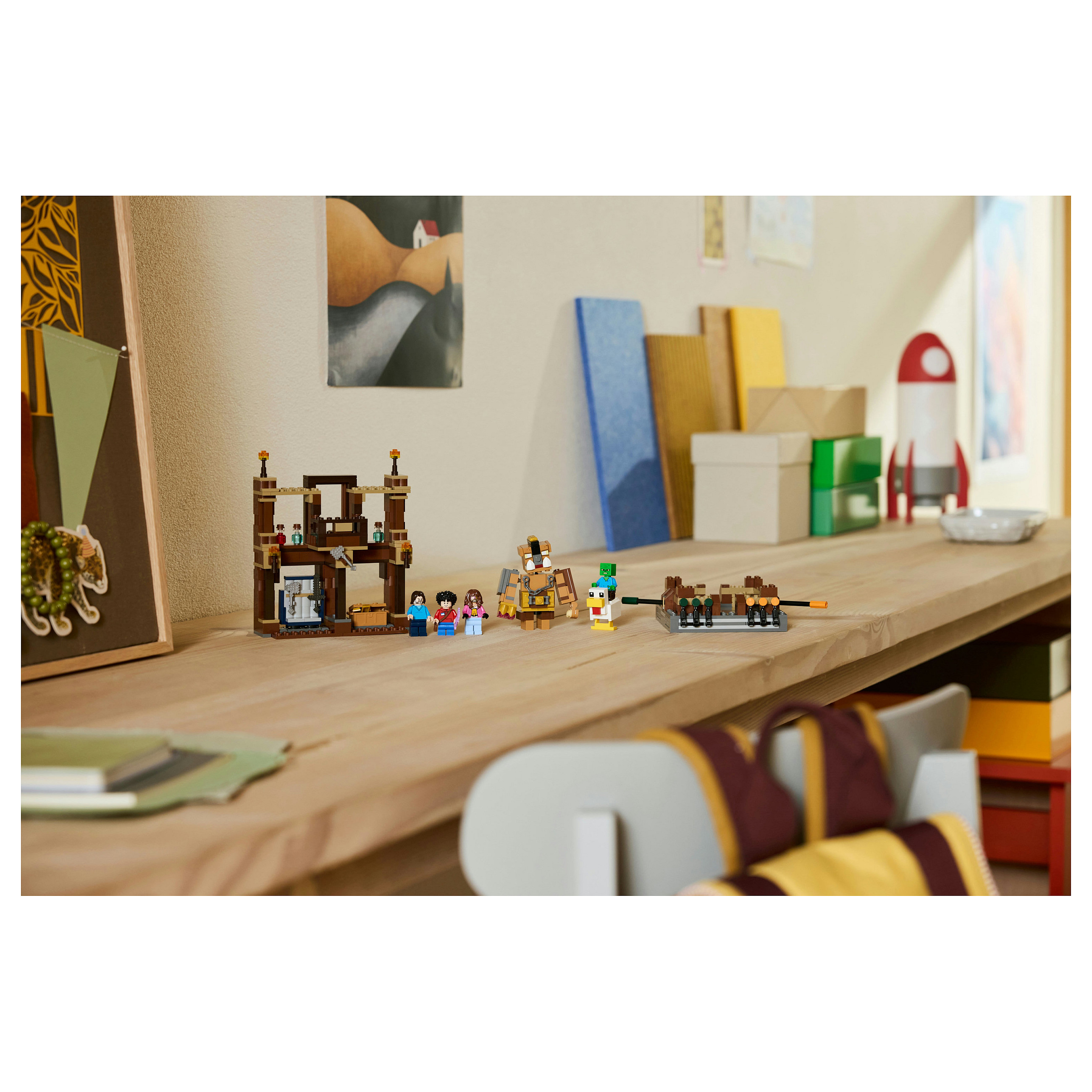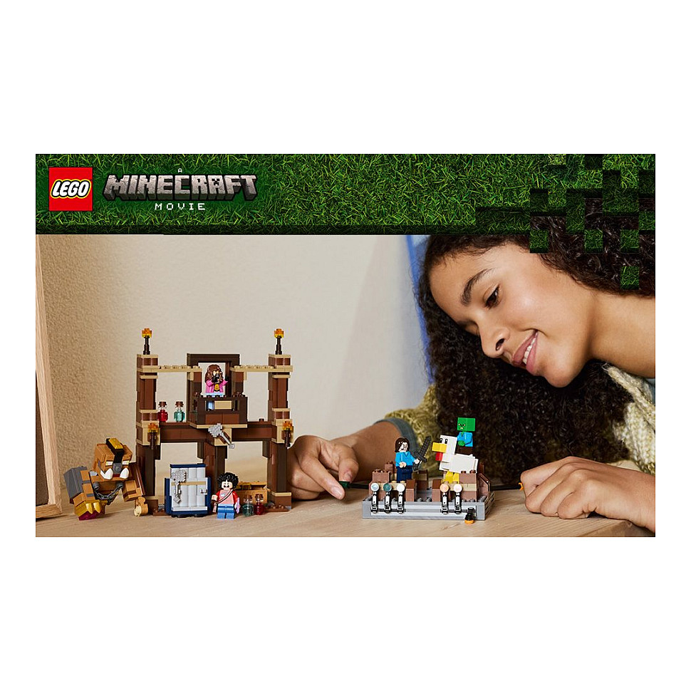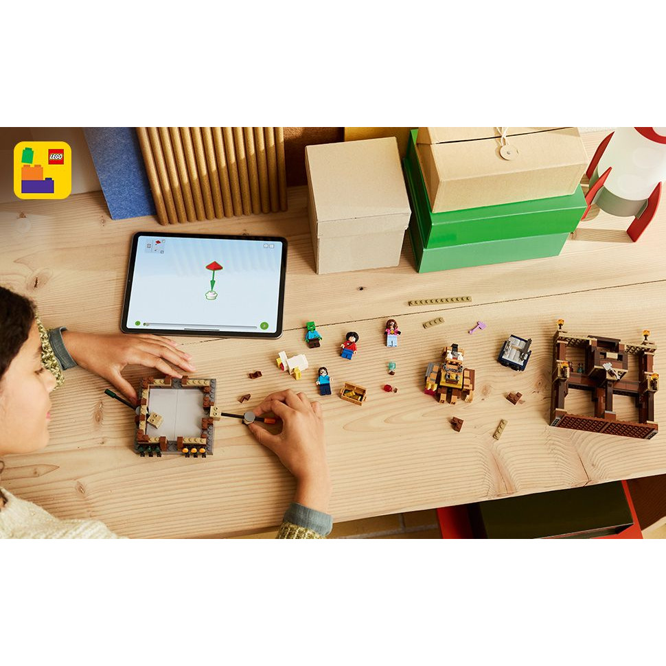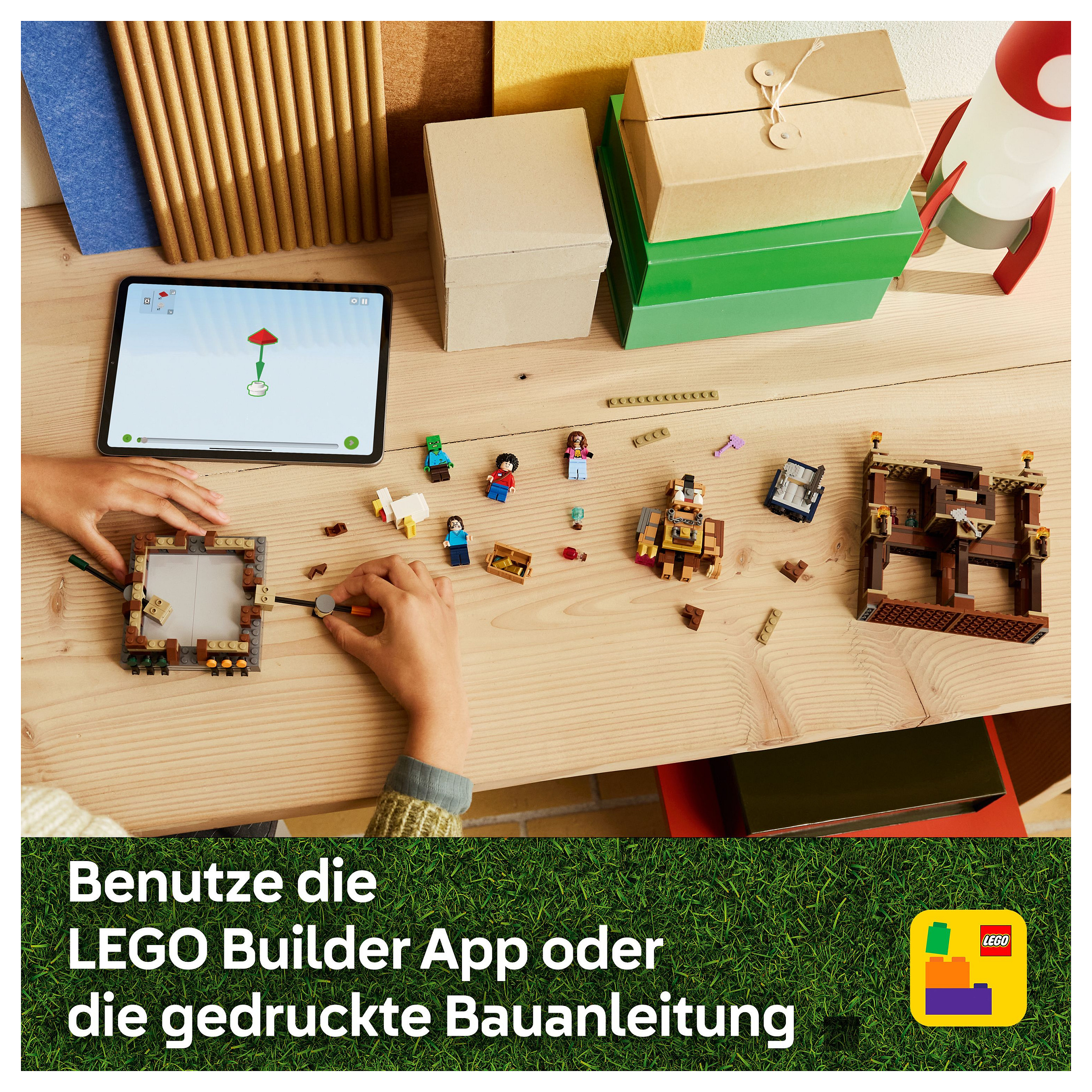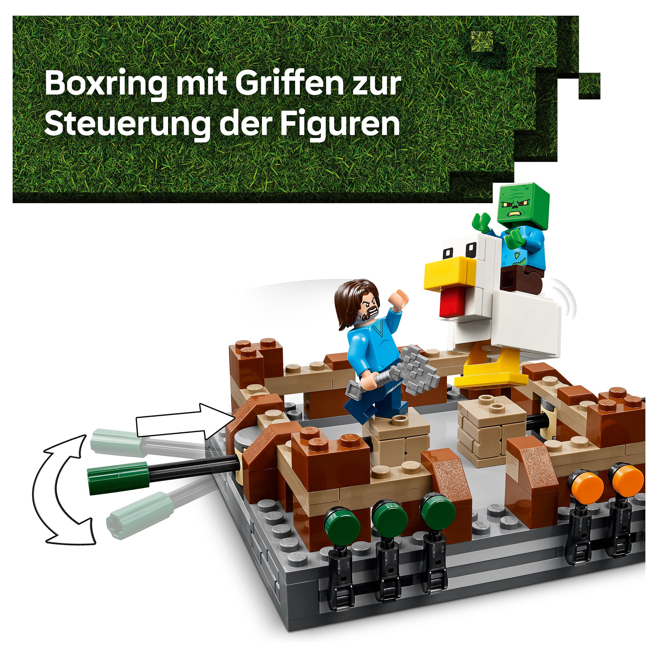 Das LEGO® Minecraft Bauset beinhaltet Spielzeugfiguren aus dem Film – Steve, Garrett, Henry, ein Zombiebaby, einen Hühnerjockey und einen beweglichen Oberborst – sowie jede Menge Ausrüstung und Tränke, um Actionszenen und eigene Abenteuer darzustellen. Zu dem Set gehört auch ein funktionierender Boxring mit Punktetafeln und Griffen, die Kinder an den Boxern befestigen können. Eine Außenmauer des Anwesens, eine herausnehmbare Truhe und ein Ausrüstungsständer vervollständigen das Modell. Digitalen Bauspaß bietet die LEGO Builder App, die Kinder 3D-Modellansichten vergrößern und drehen und ihren Baufortschritt verfolgen lässt.