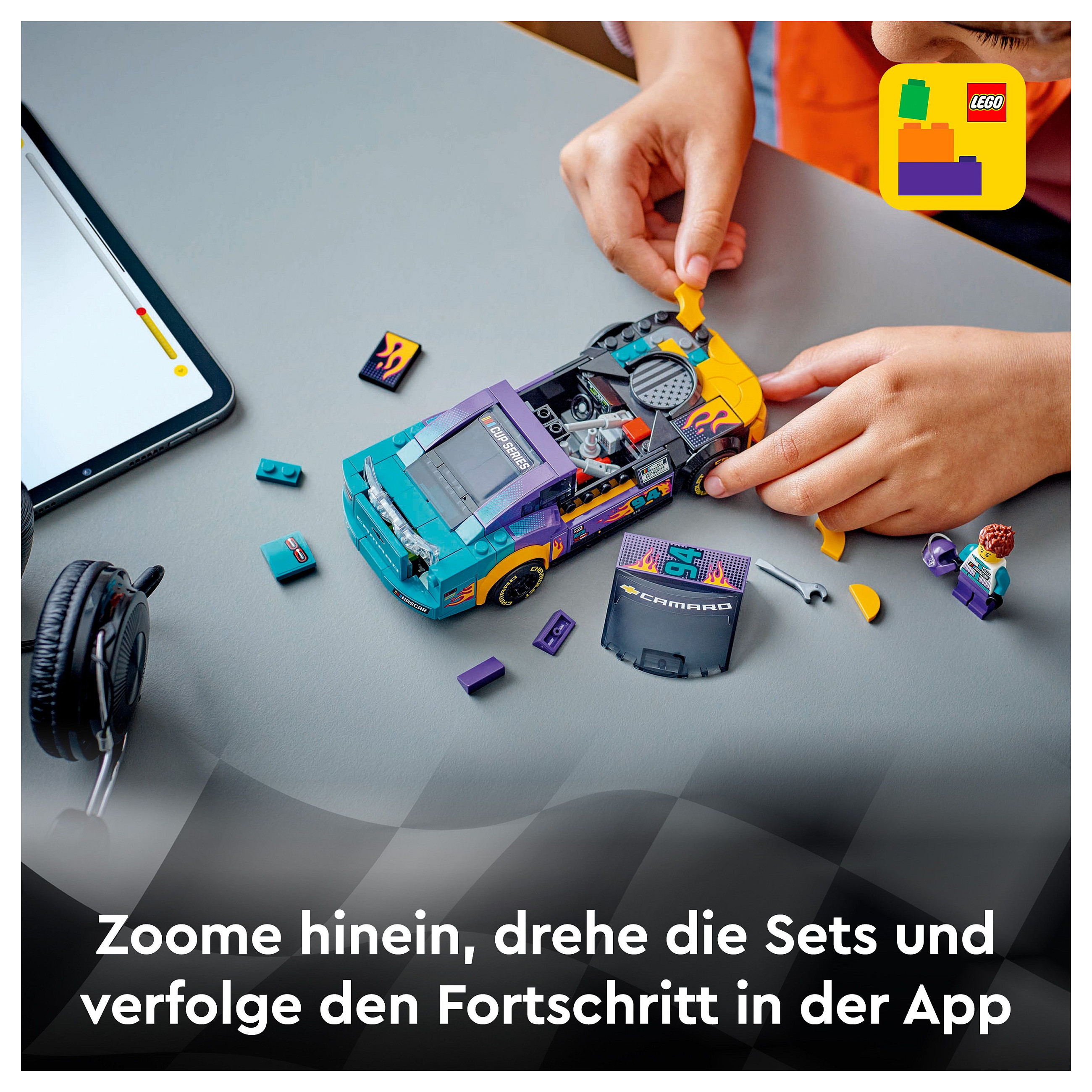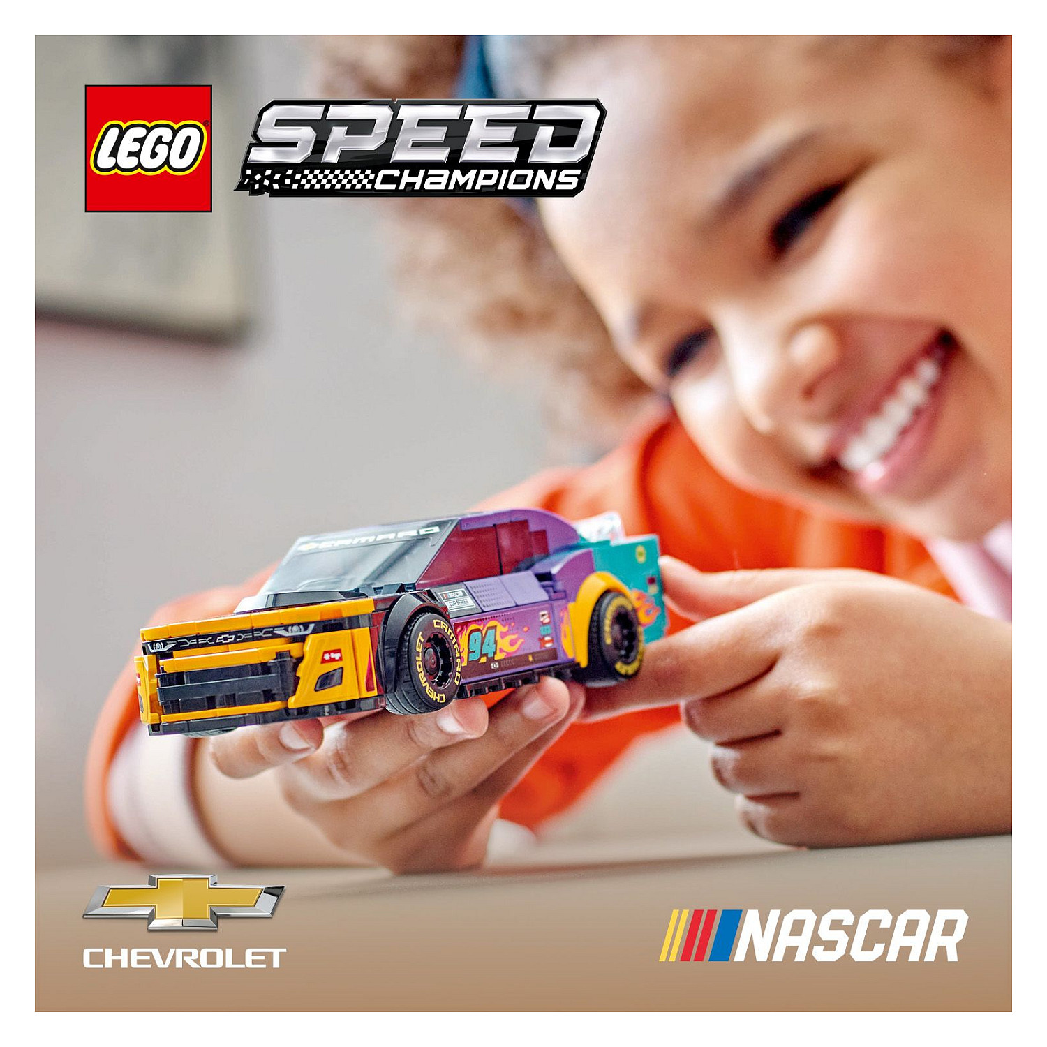 Jungen und Mädchen ab 9 Jahren sowie NASCAR® Fans können sich auf den LEGO® Speed Champions NASCAR Next Gen Chevrolet Camaro ZL1 (76935) freuen. Das Spielzeugauto zum Sammeln, Bauen, Spielen und Ausstellen kann in kräftigen Farben nachgebildet und mit Flammen verziert werden. Der rasante Flitzer ist den Originalrennautos nachempfunden, die in der NASCAR Cup Series um den Titel fahren.