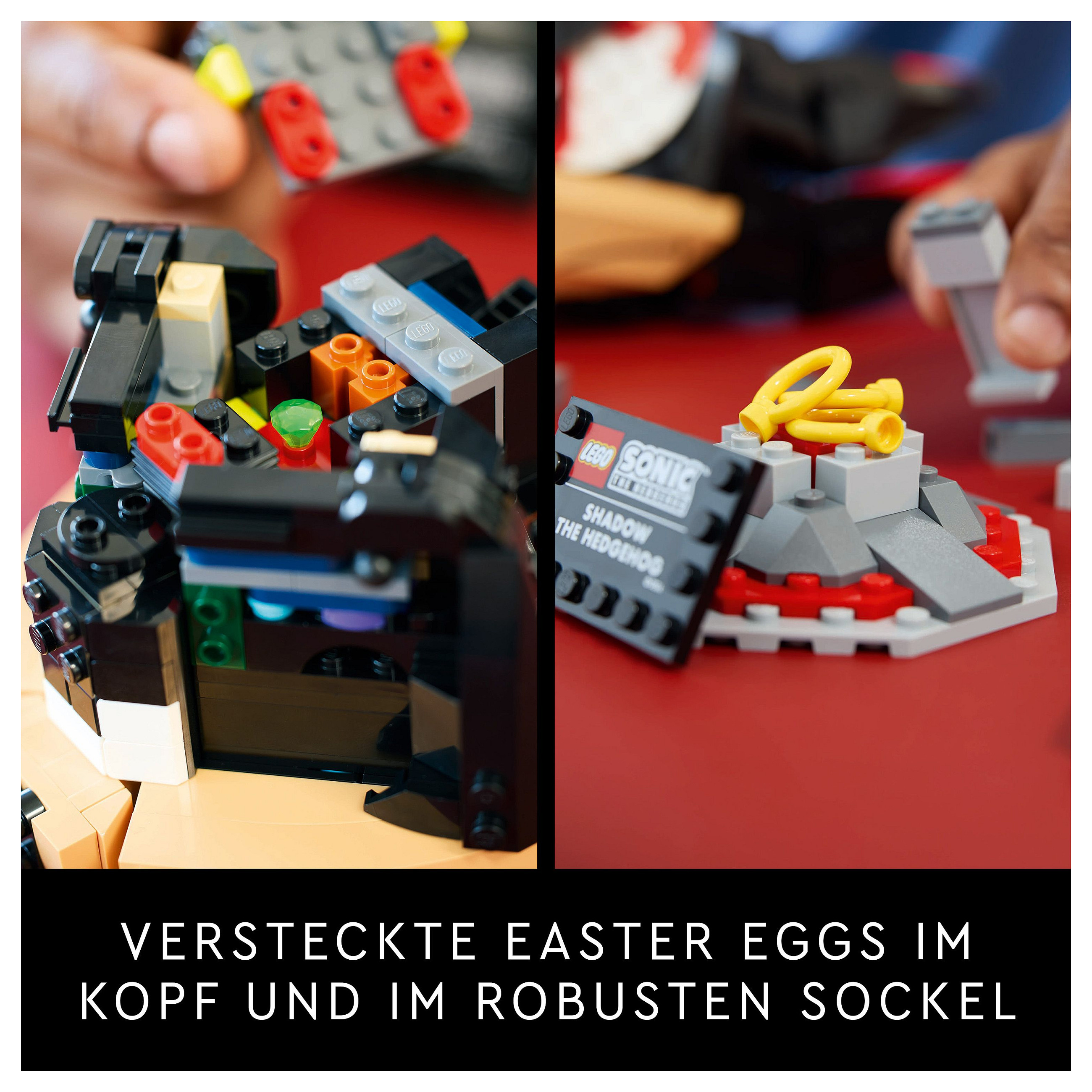 Erwachsene Gamingfans können ihre Begeisterung für die Ultimate Lifeform mit Shadow the Hedgehog (77000) teilen. Dieses LEGO® Modell zum Sammeln, Bauen und Verschenken ist detailgetreu nachgebildet und spiegelt die kräftigen Farben und den wilden Gesichtsausdruck von Shadow wider. Diese Figur ist ein legendärer Charakter aus den Sonic the Hedgehog™ Videospielen. Das Set zum Bauen und Ausstellen besteht aus Shadows Kopf, einem Namensschild sowie Easter Eggs, die sich sowohl im Kopf als auch im robusten Sockel verbergen.