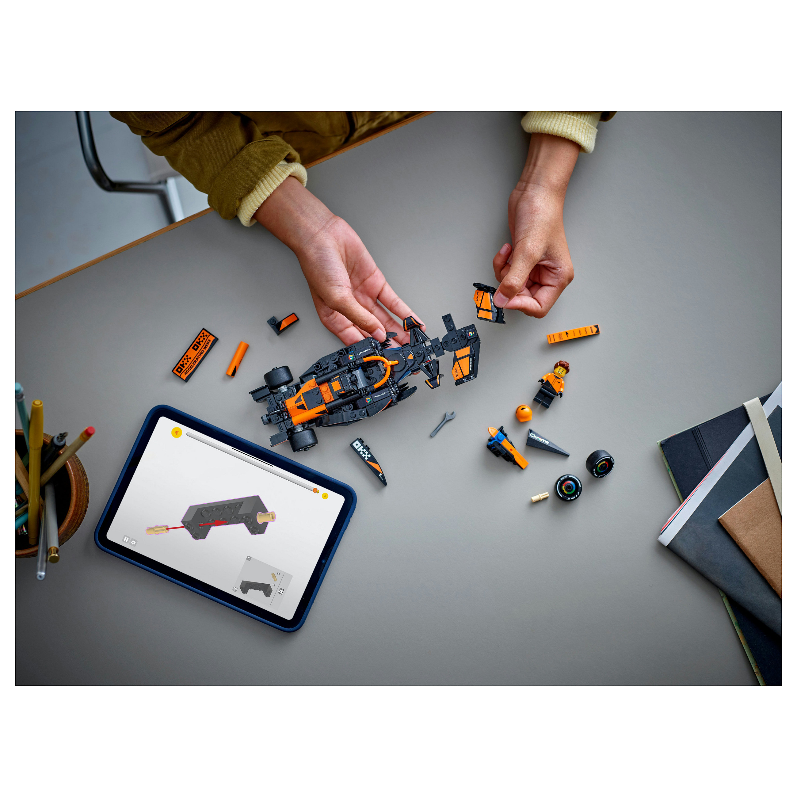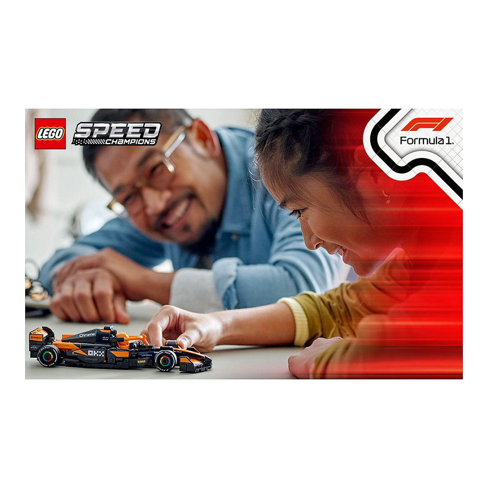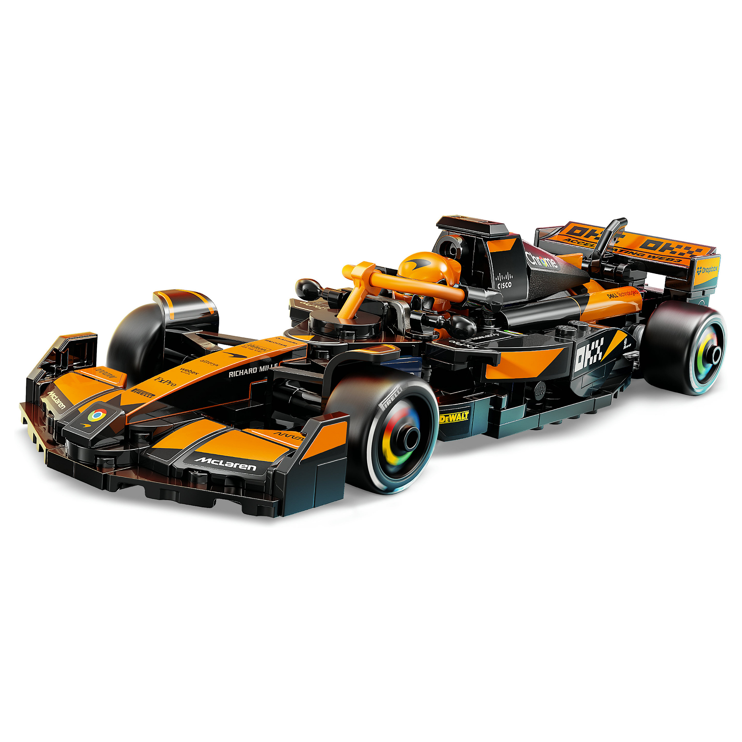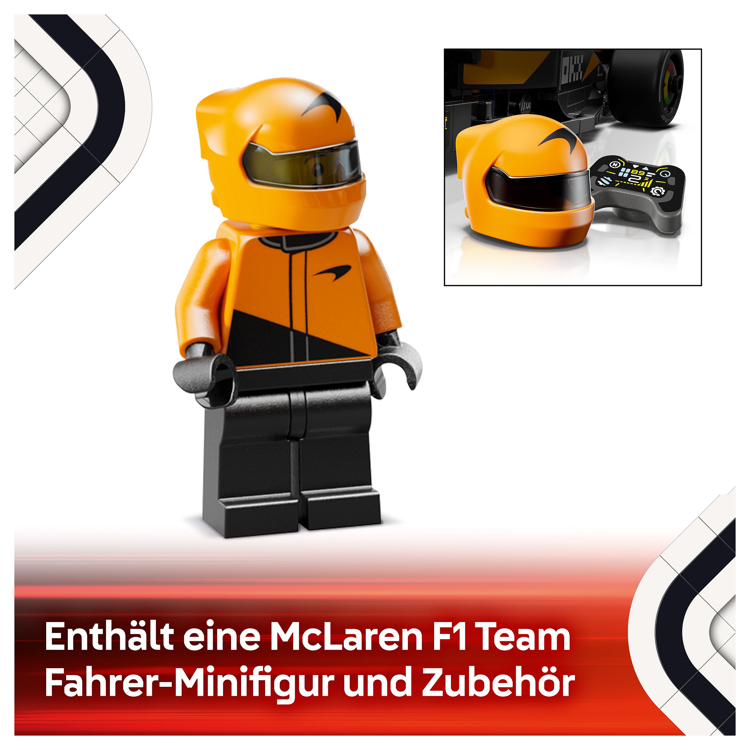 Das Modell des F1-Rennautos hat ein Cockpit, das sich öffnen lässt, indem man den Halo-Bügel hochklappt, einen Heckflügel, einen Querlenker, Sponsorenaufkleber und breitere Hinterreifen mit dem Aufdruck „Pirelli“. Zu dem baubaren Rennauto gehört auch eine Rennfahrer-Minifigur mit Helm und im McLaren-Rennoverall, die man ins Cockpit setzen kann.