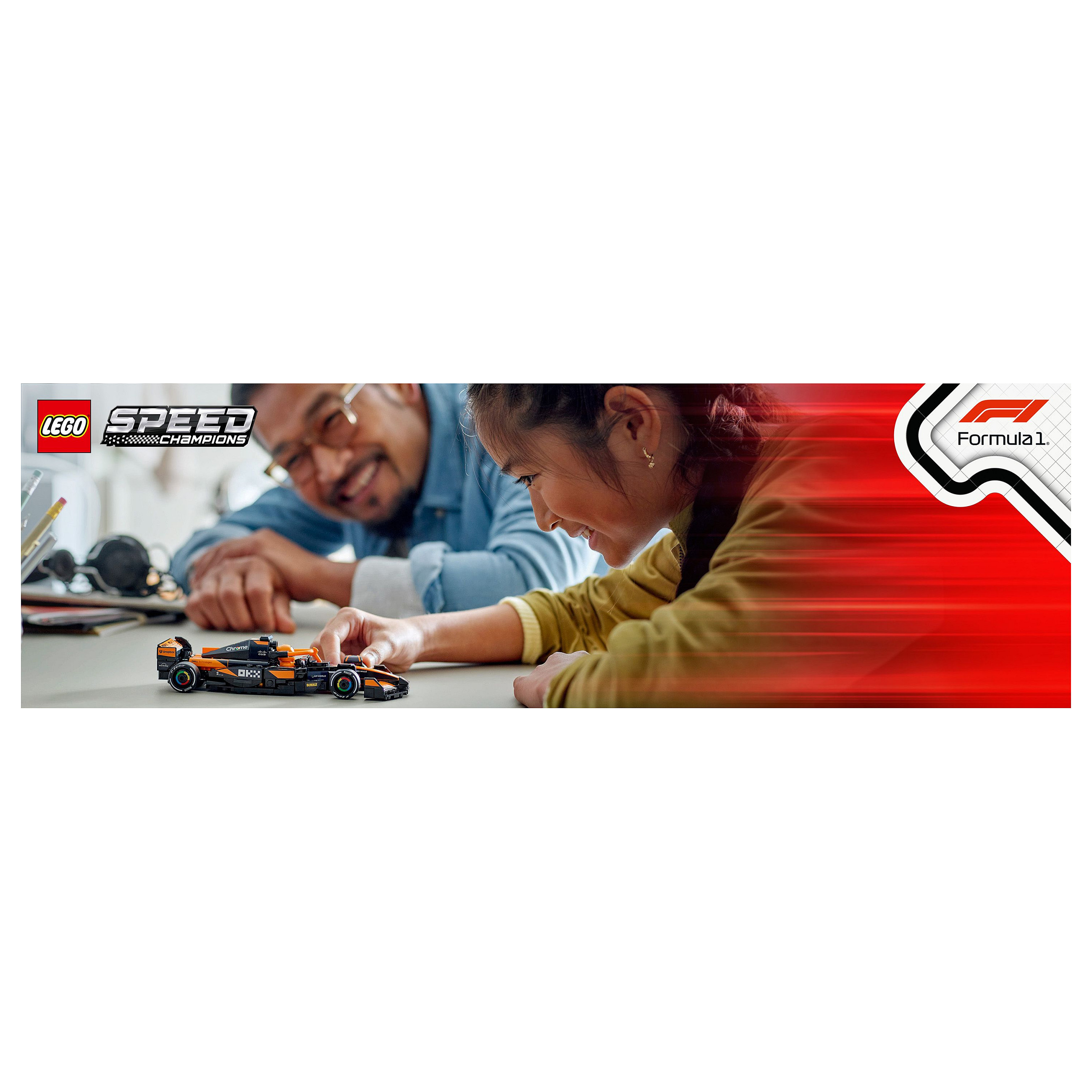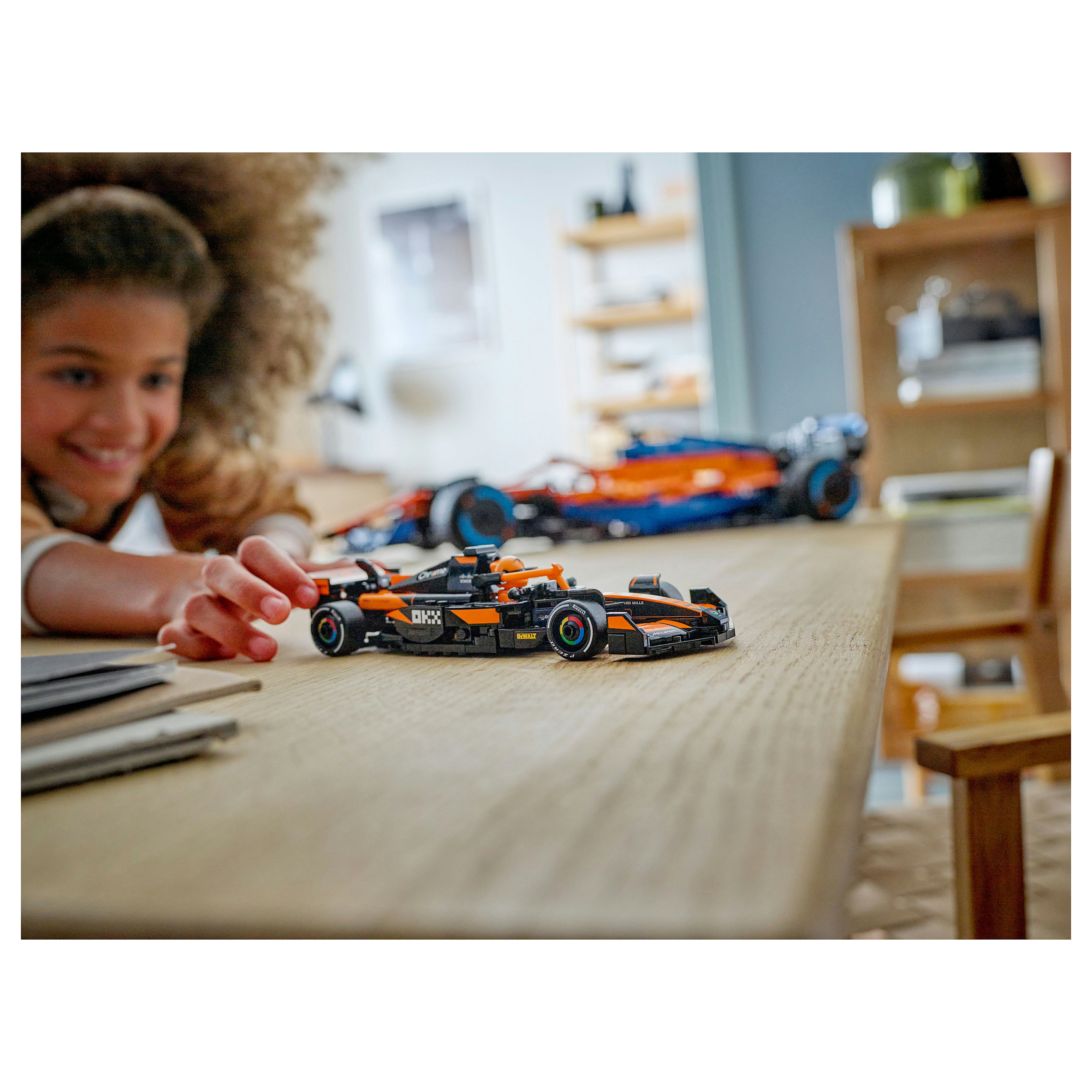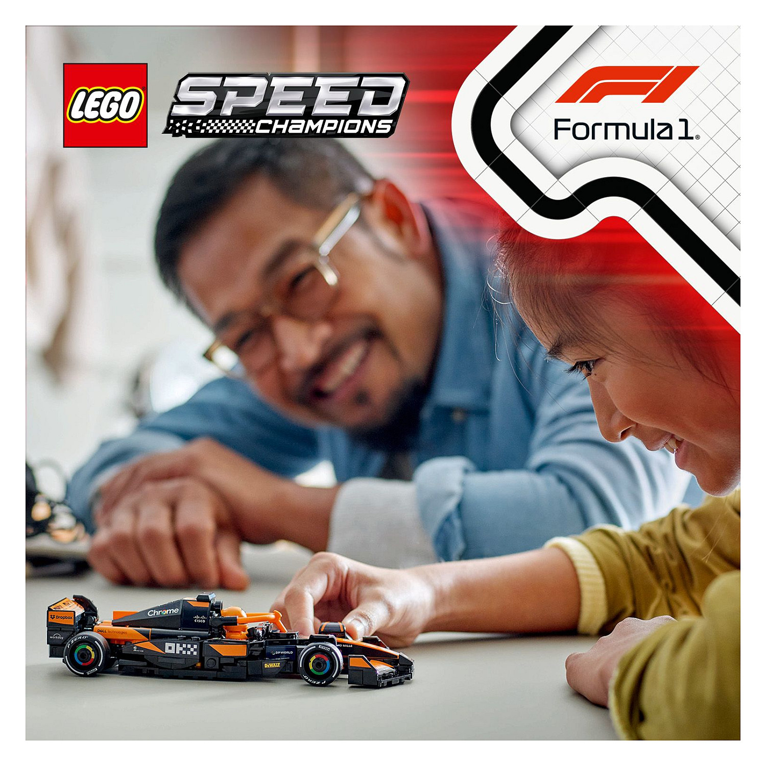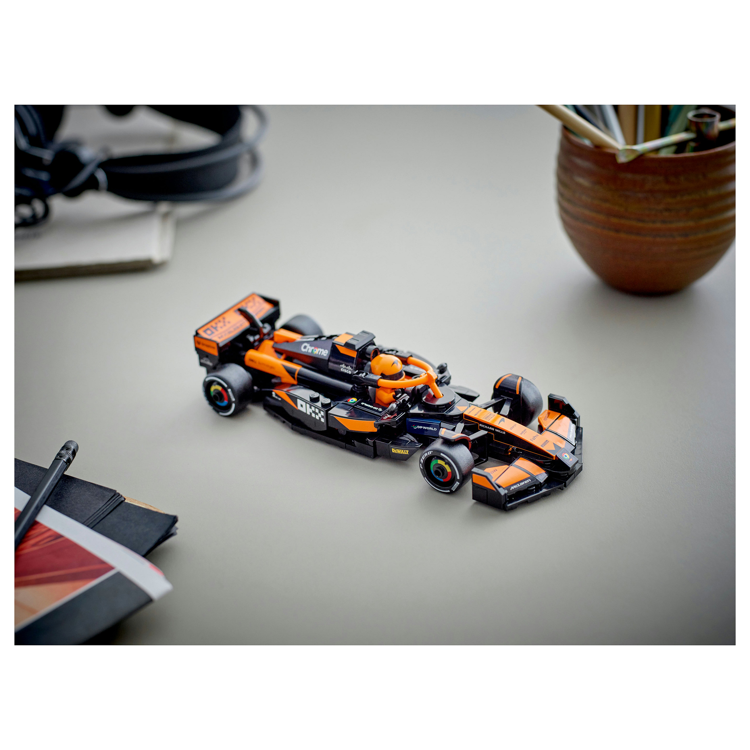 Das Modell des F1-Rennautos hat ein Cockpit, das sich öffnen lässt, indem man den Halo-Bügel hochklappt, einen Heckflügel, einen Querlenker, Sponsorenaufkleber und breitere Hinterreifen mit dem Aufdruck „Pirelli“. Zu dem baubaren Rennauto gehört auch eine Rennfahrer-Minifigur mit Helm und im McLaren-Rennoverall, die man ins Cockpit setzen kann.