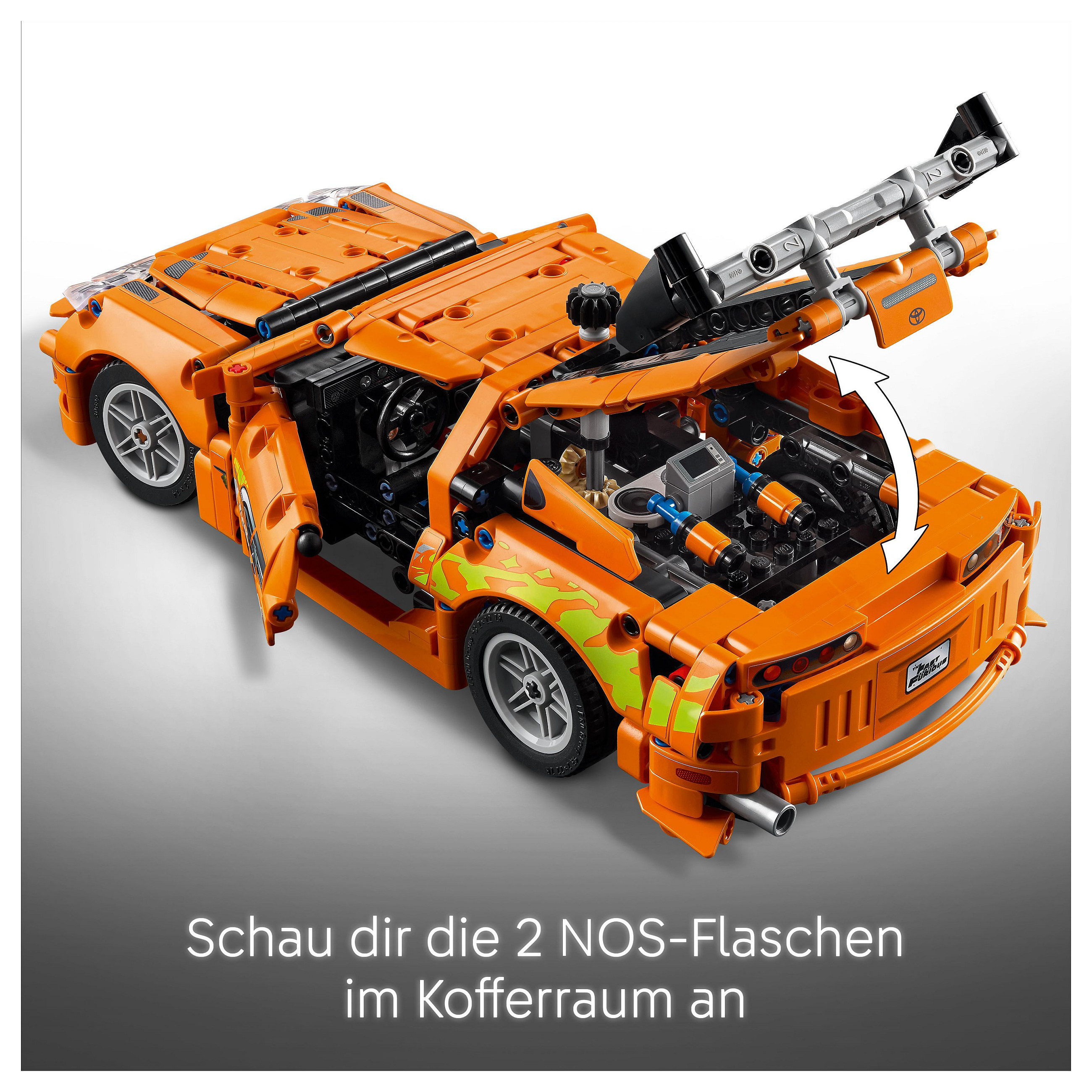 Baubares Modell des Toyota Supra: Dieser Spielzeugsportwagen strotzt nur so vor Details und Anspielungen, die Fans der Filmreihe Fast and Furious begeistern werden. Hierzu zählen auch die beiden NOS-Lachgasflaschen im Kofferraum