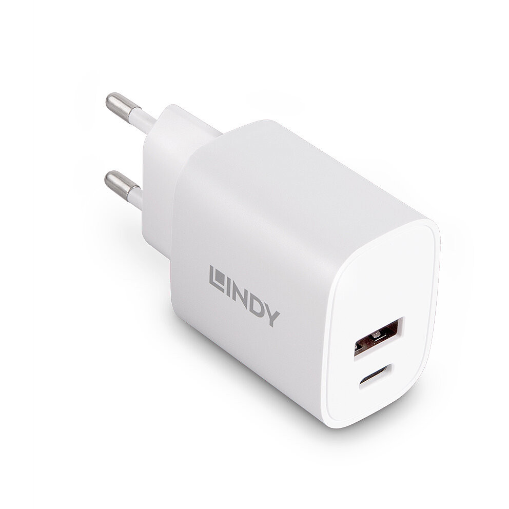 Der Lindy 20W USB Typ A & C Charger kann zwei Geräte gleichzeitig aufladen. Hierbei liefert der USB Typ C Port 20W Power Delivery und über den USB Typ A Port ist Fast Charging mit bis zu 18W möglich. Wenn beide Anschlüsse gleichzeitig verwendet werden, beträgt die maximale Ausgangsleistung 15W.