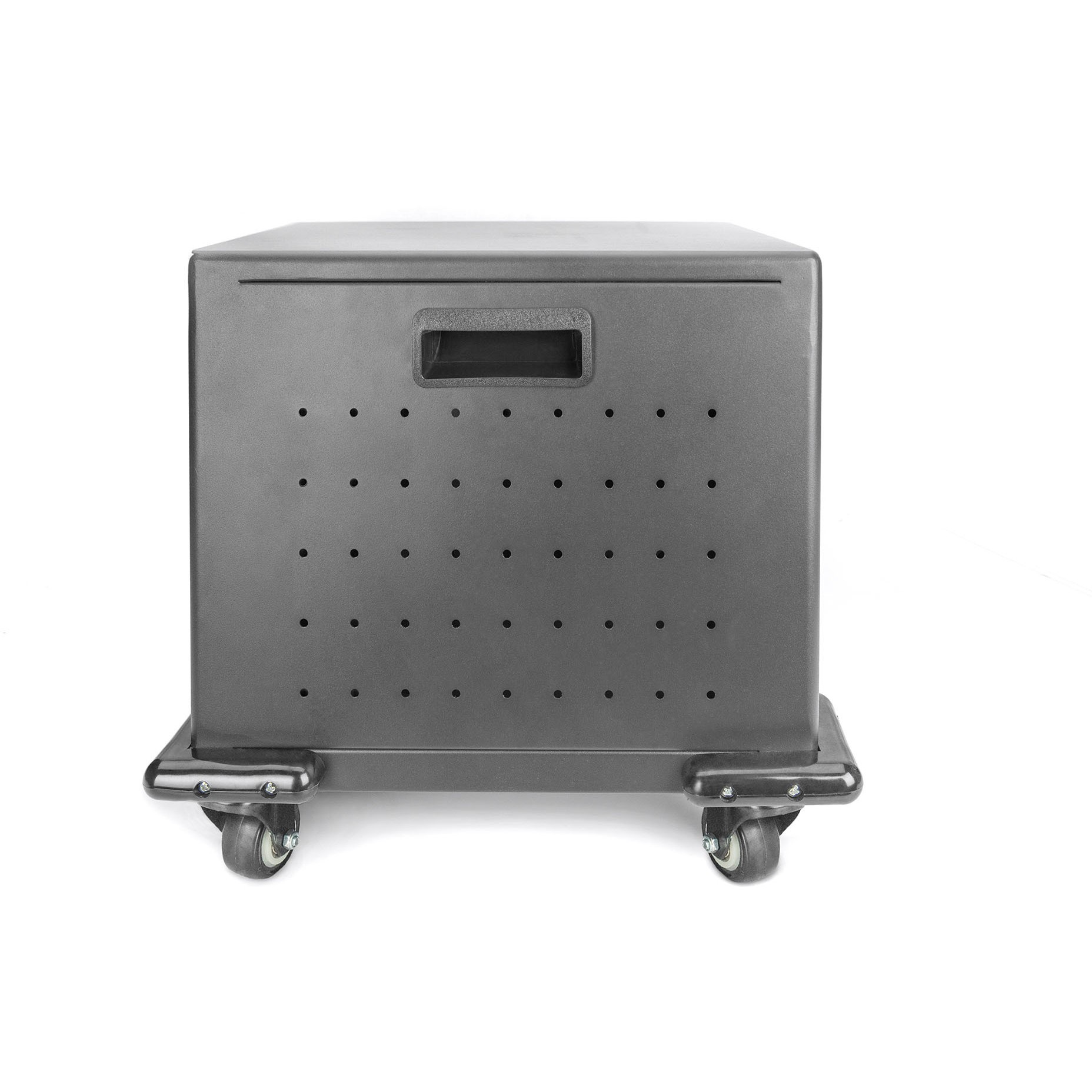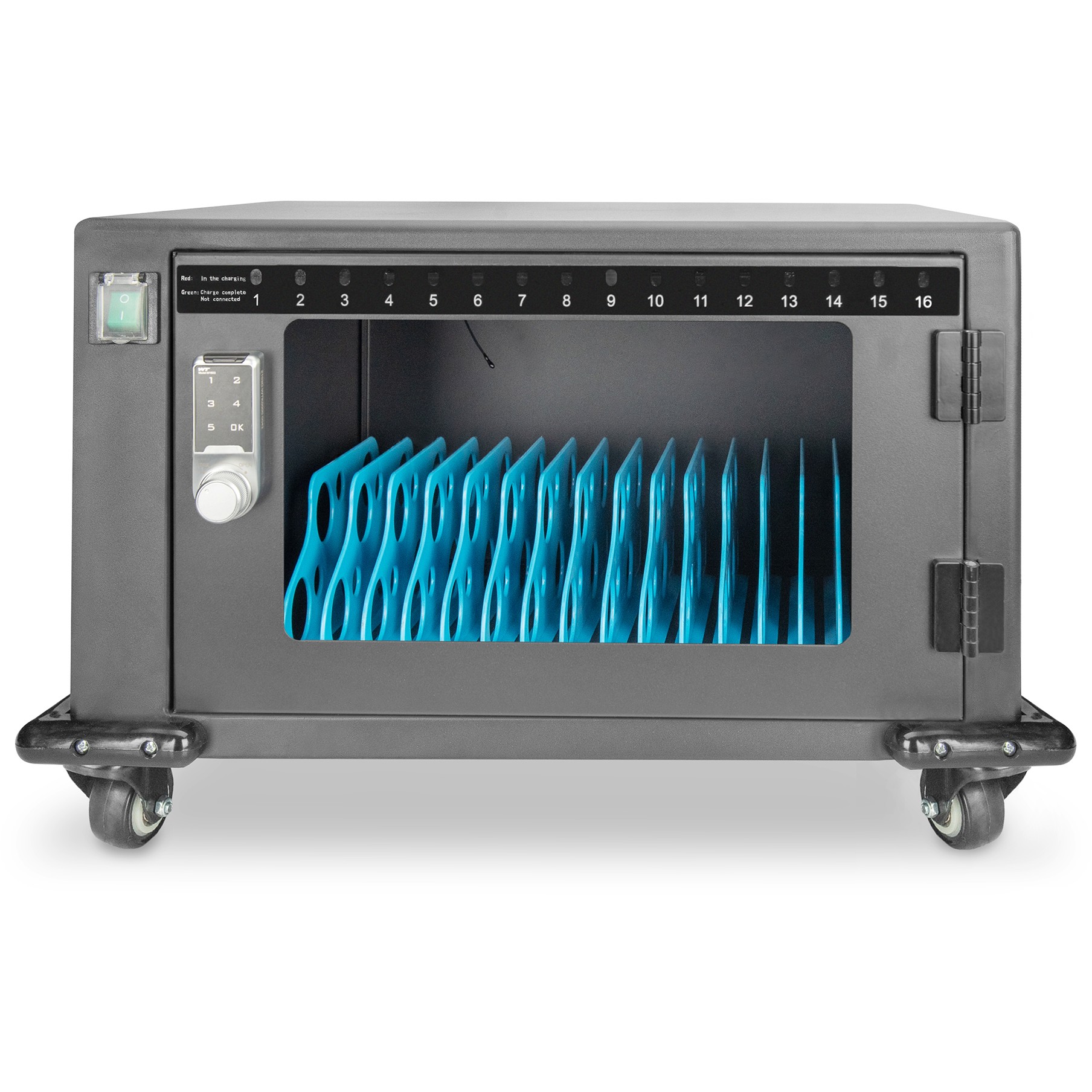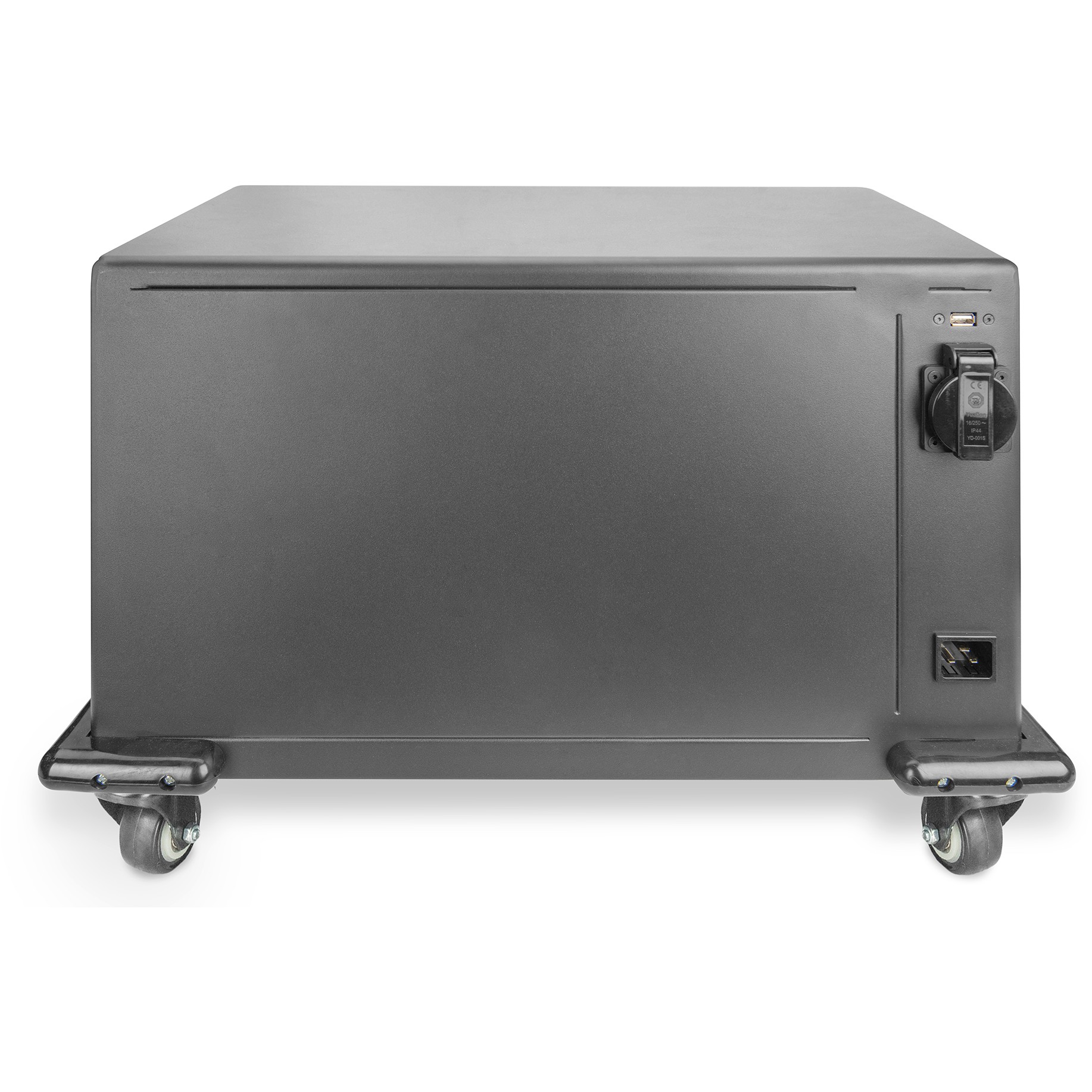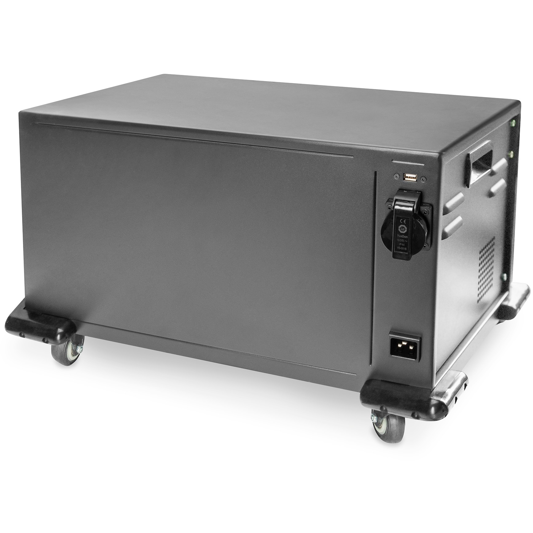 Der mobile Ladeschrank von DIGITUS® ist die ideale und kompakte Lösung zur Aufbewahrung und zum Aufladen Ihrer portablen Geräte, wie z. B. Notebooks und Tablets. Häufig werden mobile Ladeschränke in öffentlichen Einrichtungen wie z. B. Schulen genutzt, um die Geräte an einem zentralen Ort gesichert aufzubewahren und gleichzeitig laden zu können. Der Schrank beinhaltet 16 Ladeplätze, von dem jeder über einen eigenen USB-Anschluss an der Vorderseite verfügt. Ein verbauter Lüfter (24 V) in Verbindung mit Lüftungsschlitzen sorgt für eine aktive Entwärmung des Schrankes.Mobiler Ladeschrank, 14", USB-A, elektr. PIN Schl. 16 Ladestationen, Lüfter, 384 x 550 x 375 mm