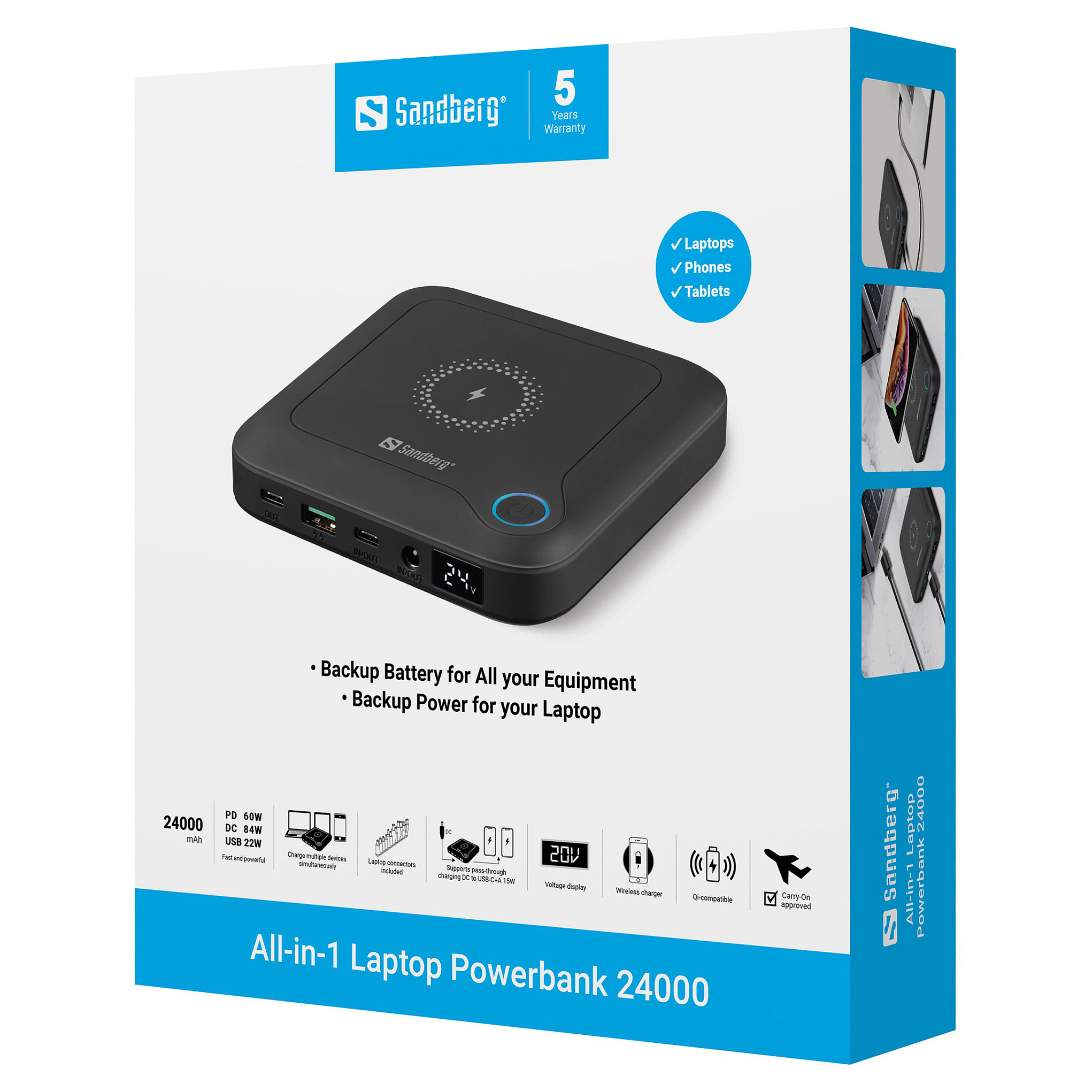 Die Sandberg All-in-1 Laptop Powerbank 24000 ist Ihre universelle Energiequelle für unterwegs. Sie eignet sich für alle Ihre mobilen Geräte, sogar für Ihren Laptop oder Ihr Macbook. Der leistungsstarke Akku mit 24.000 mAh Kapazität bietet ausreichend Leistung für mehrere Ladevorgänge eines Smartphones oder mehrere zusätzliche Arbeitsstunden am Laptop oder Notebook. Das beiliegende Wechselstromnetzteil ermöglicht es, die Powerbank mühelos binnen weniger Stunden aufzuladen. Alternativ kann auch ein beliebiges USB-C-Ladegerät eingesetzt werden. Dank der Gleichstrombuchse und den 12 verschiedenen Adaptern sowie dem Schnelllade-USB-Anschluss und den beiden USB-C-Anschlüssen können viele unterschiedliche Geräte mit maximaler Geschwindigkeit angeschlossen und geladen werden. Als zusätzliche Funktion wurde eine drahtlose Schnellladestation integriert. Die Powerbank lässt sich einfach in Ihrer Tasche transportieren, da sie trotz ihrer hohen Kapazität nur 500 Gramm wiegt.
