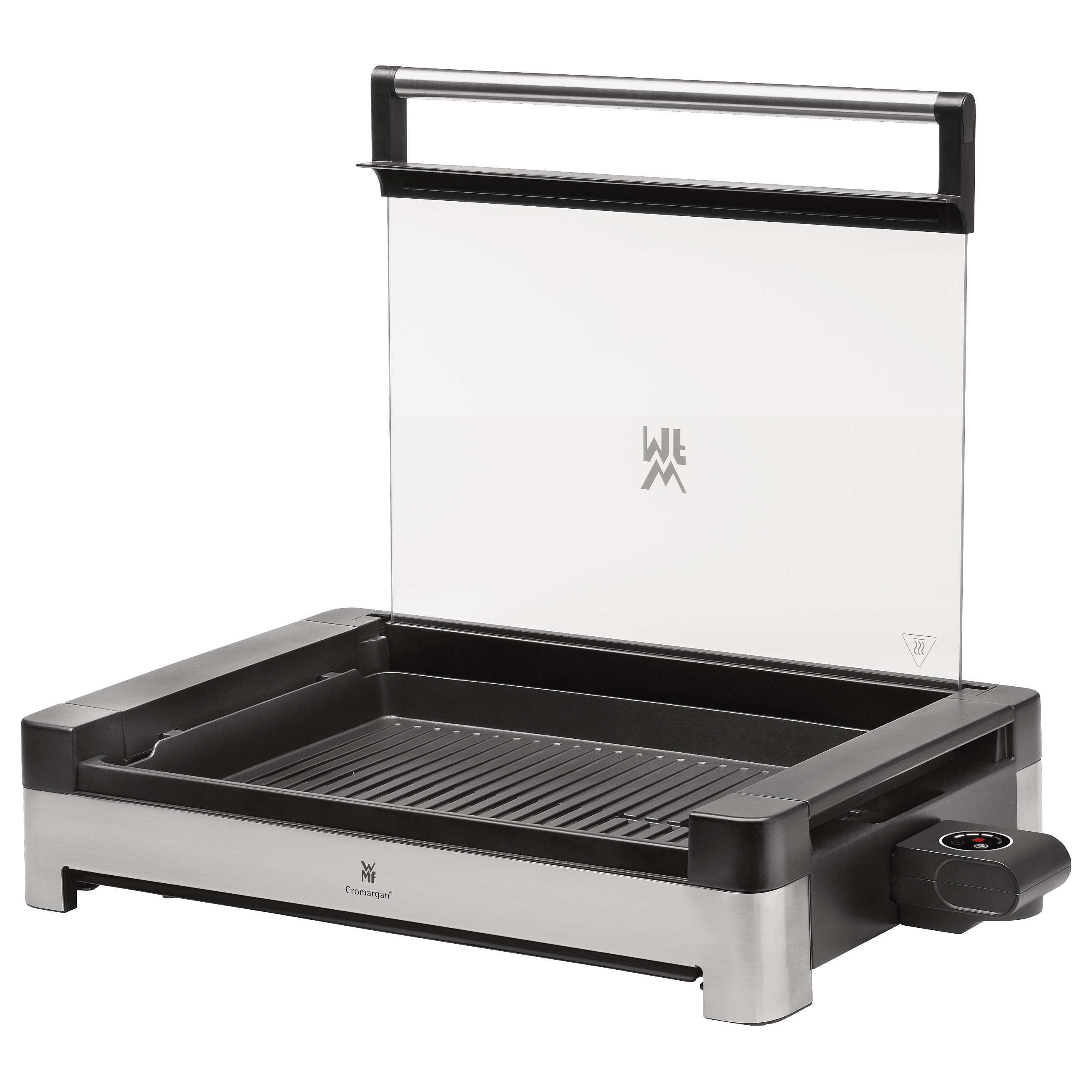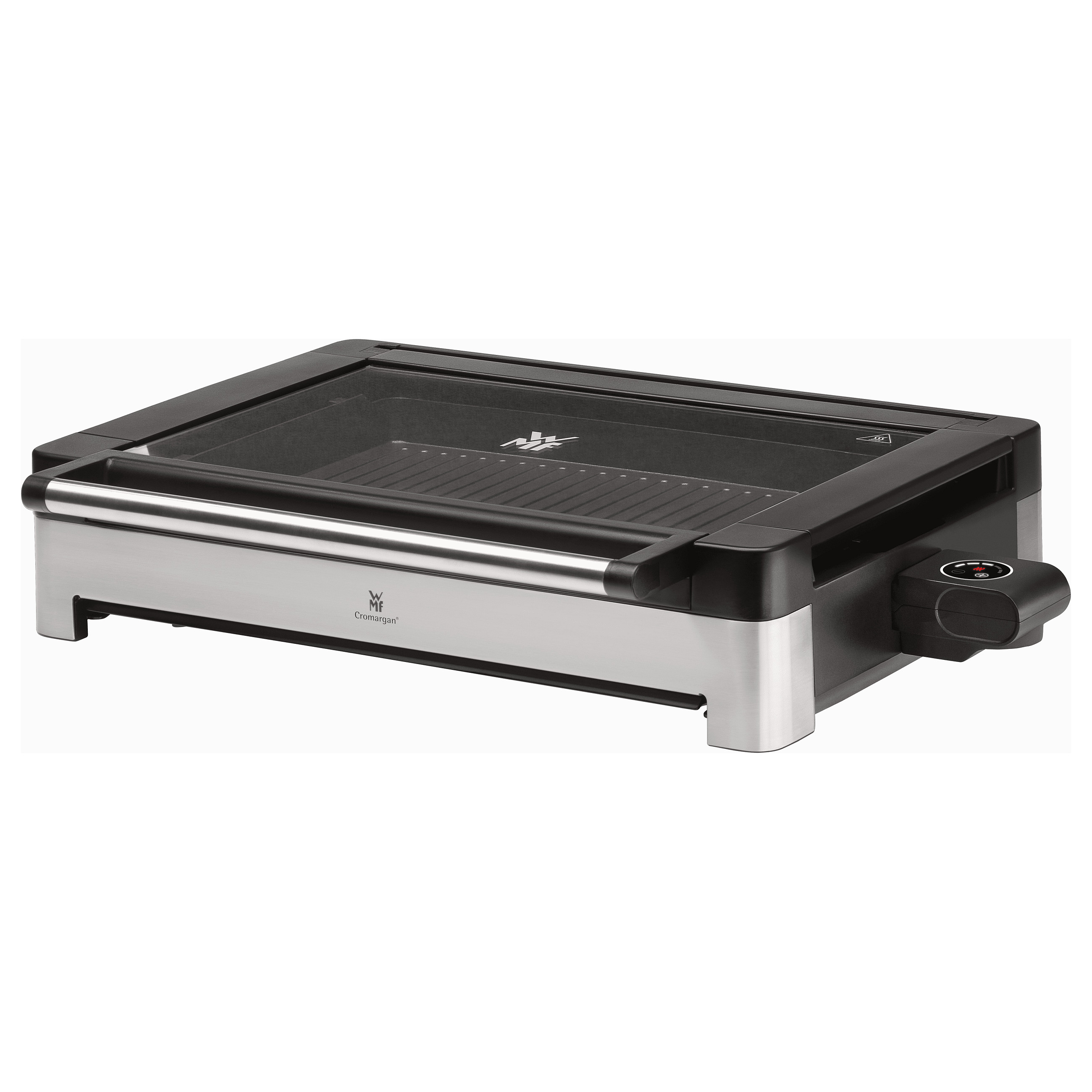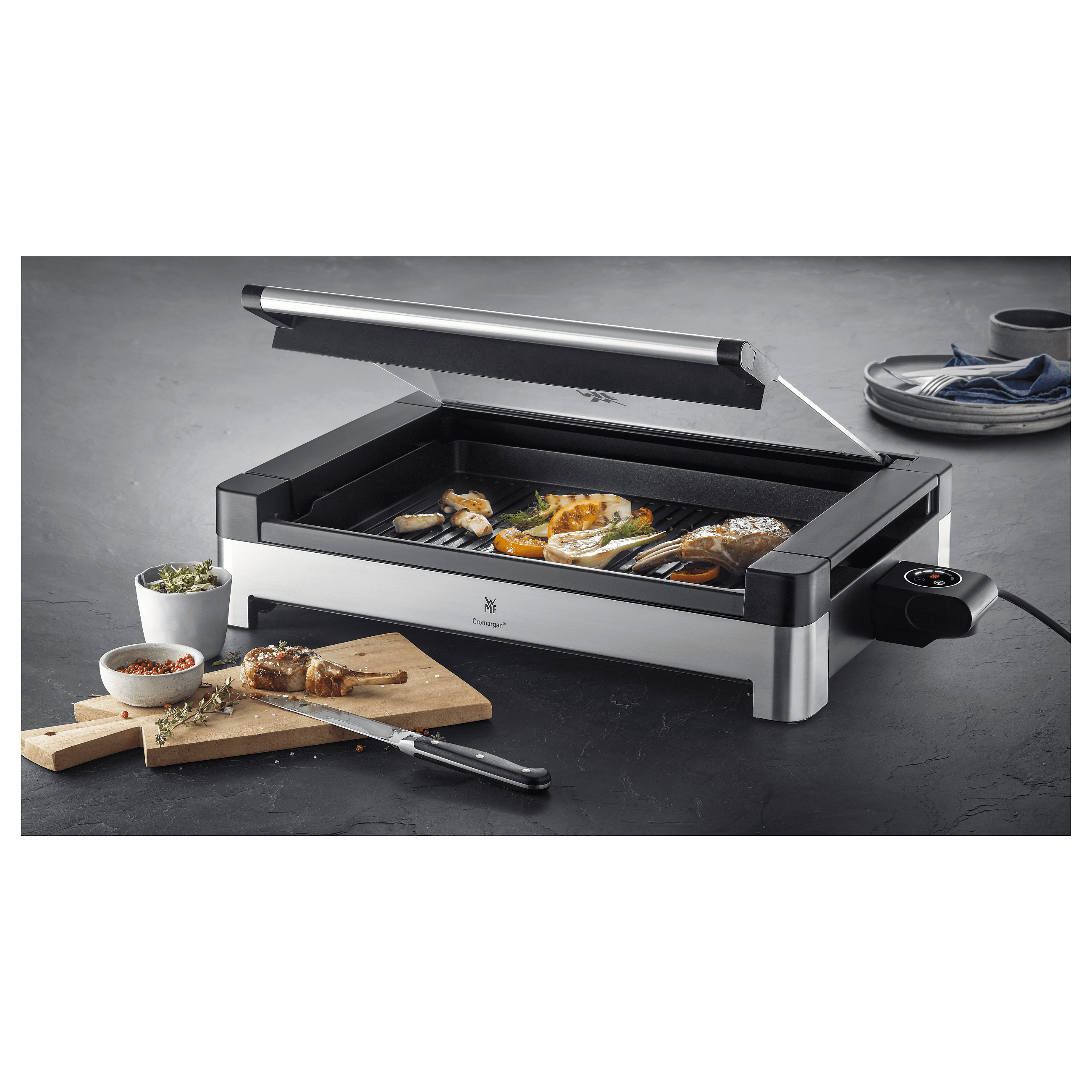 Grillvergnügen Indoor! Mit dem WMF Lono Tischgrill mit wärmeisoliertem Gehäuse aus mattiertem hochwertigem Cromargan® und Glasdeckel lässt sich bedenkenlos in Innenräumen brutzeln, braten und grillen. Dank 2.200 Watt Leistung gelingen Fleisch, Fisch, Gemüse und Co. wie gewohnt geschmackvoll und aromatisch. Ein hitzebeständiger, großer, abnehmbarer und arretierbarer Glasdeckel aus WMF Sicherheitsglas sorgt für saftige und aromatische Grillergebnisse, reduziert gleichzeitig Gerüche und hilft im geschlossenen Zustand Zeit und Energie zu sparen. Für noch mehr Sicherheit sorgt die integrierte, große und leicht zu entnehmende Fettauffangschale mit einem Sicherheitsschalter, der das Grillen nur bei eingesetzter Schale erlaubt. Das mühelose Zerlegen des Grills ermöglicht eine kinderleichte hygienische Reinigung der einzelnen Teile. Und das pflegeleichte Cromargan®-Gehäuse darf sogar in die Spülmaschine.