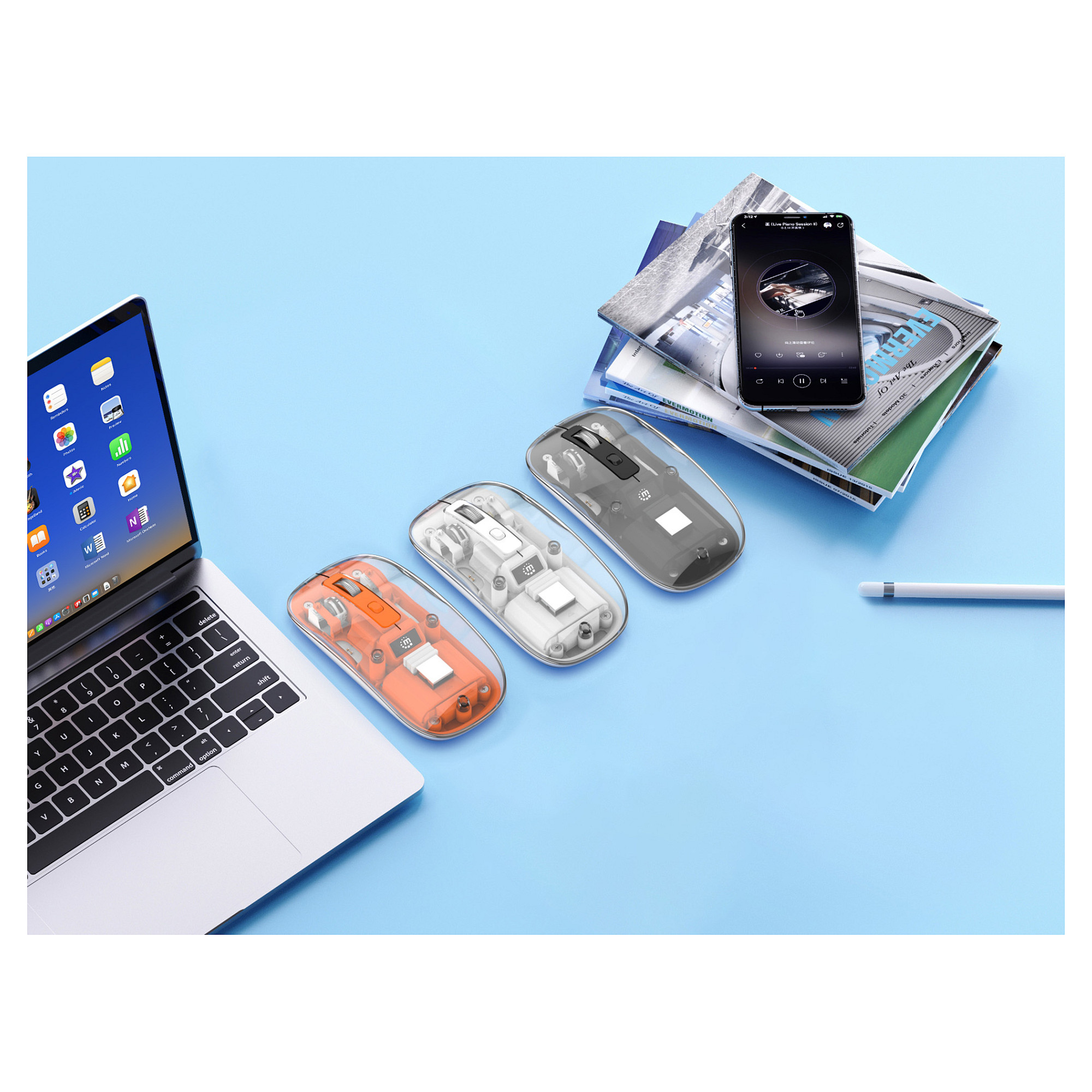Diese transparente Wireless Computer-Maus von Manhattan ist eine attraktive Mischung aus Style und Funktionalität. Ihr transparentes Gehäuse in schlanker Silhouette zeigt ihre Komponenten, während das Logo in dynamischem RGB-Licht seine Farbe wechselt. Der optische Sensor taucht den gesamten Rand der Maus in ein stylisches Rot.