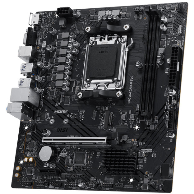 MSI PRO A620AM-B EVO. Prozessorhersteller: AMD, Prozessorsockel: Sockel AM5, Kompatible Prozessoren: AMD Ryzen 7000 Series, AMD Ryzen 8000 Series, AMD Ryzen 9000 Series. Unterstützte Arbeitsspeicher: DDR5-SDRAM, RAM-Speicher maximal: 128 GB, Arbeitsspeicher Typ: DIMM. Unterstützte Speicherlaufwerk-Schnittstellen: M.2, SATA III, RAID Level: 0, 1, 10. Ethernet Schnittstellen Typ: 5 Gigabit Ethernet. Komponente für: PC, Motherboardformfaktor: ATX, Motherboard Chipsatz Familie: AMD