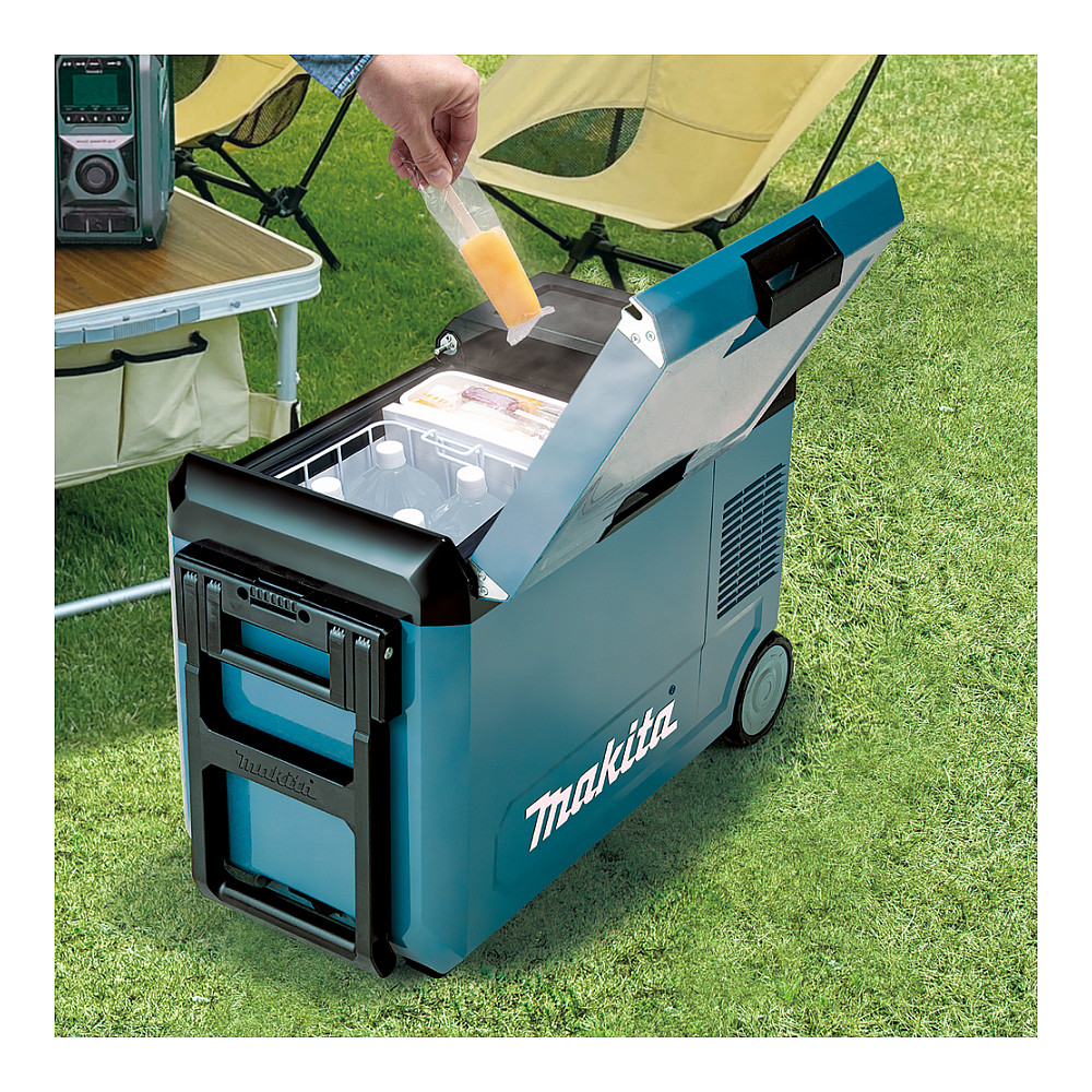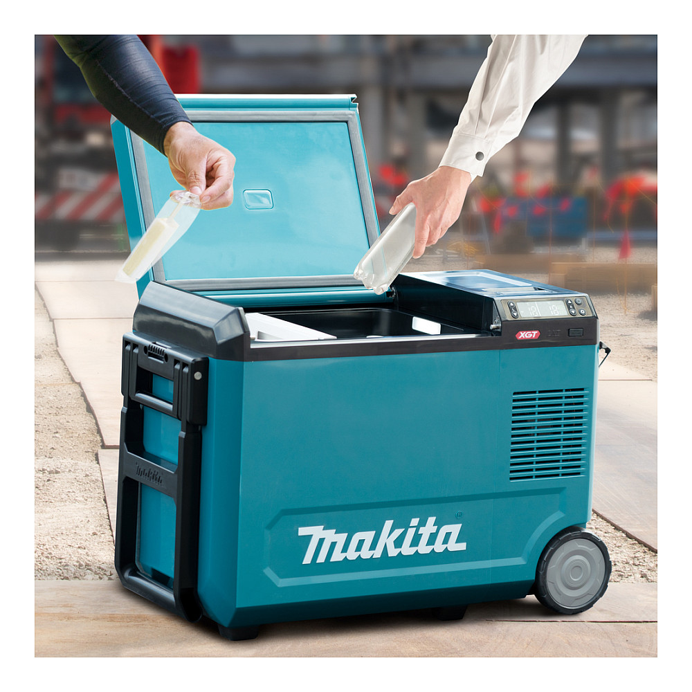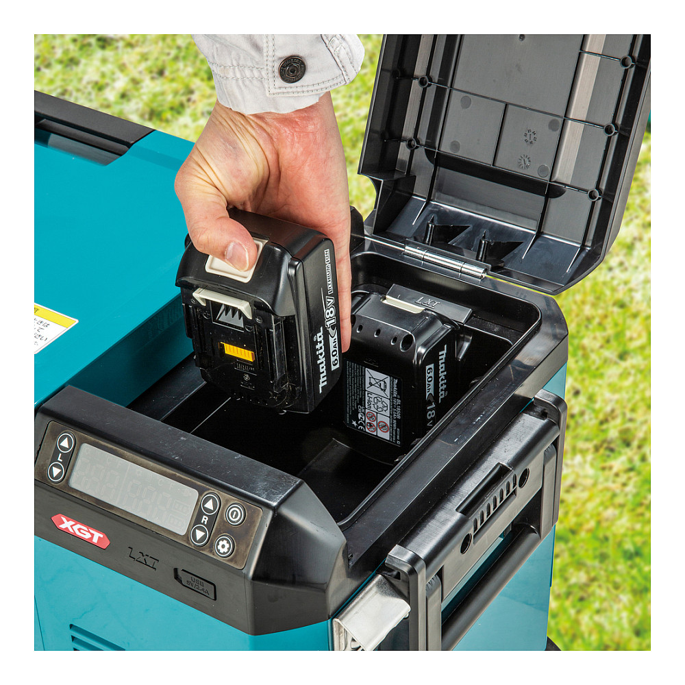 Transportable Akku-Kompressor-Kühl- und Wärmebox mit zwei Temperaturzonen. Die Temperatur ist in 17 Stufen einstellbar, ein großes Display zeigt die Soll- und Ist-Temperatur sowie den Akku-Ladestand. Betrieb am Stromnetz, am KFZ-Bordnetz, mit XGT-Akkus und mit LXT-Akkus möglich. Die beiden Klimazonen können mit einer Differenztemperatur von max. 30°C eingestellt werden.