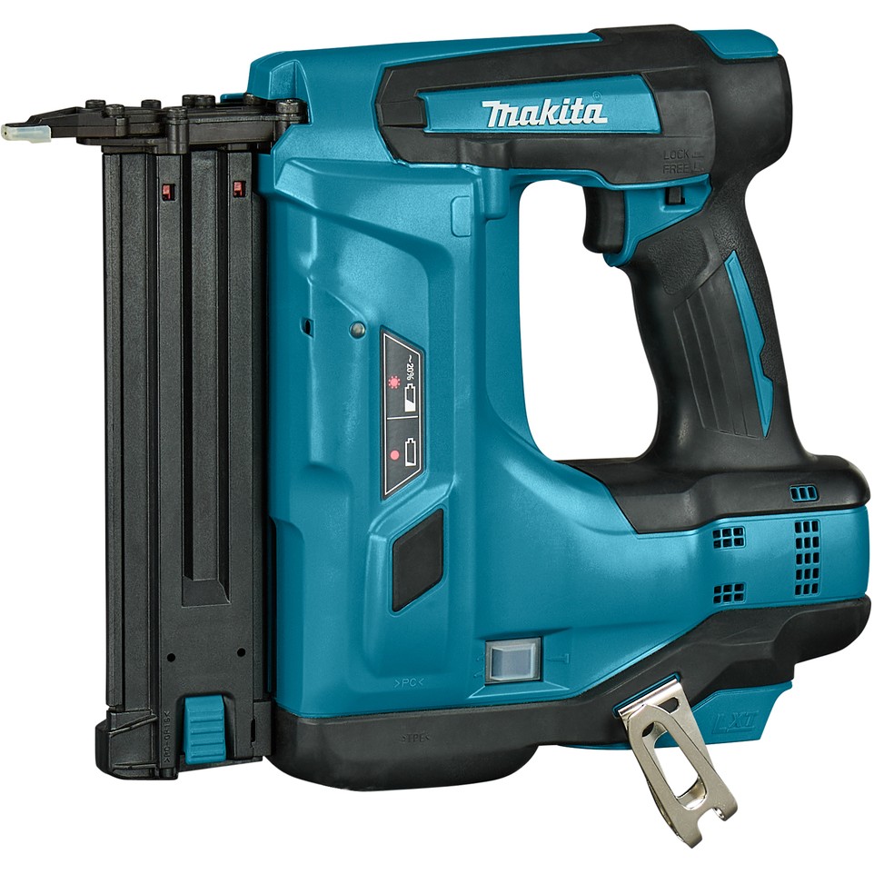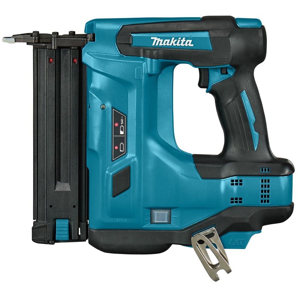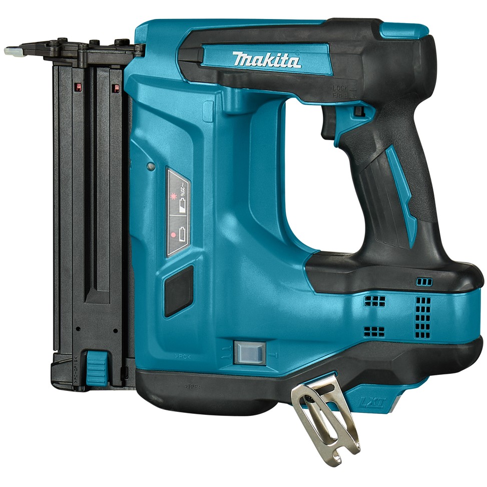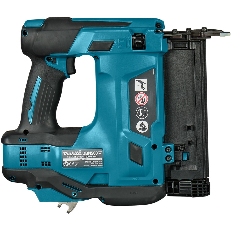 Makita DBN500ZJ. Produkttyp: Nagel-/Klammerpistol, Produktfarbe: Schwarz, Blau. Nagellänge (min.): 1,5 cm, Nagellänge (max.): 5 cm, Schalldruckpegel: 79 dB. Energiequelle: Akku, Batteriekapazität: 3 Ah, Akku-/Batteriespannung: 18 V. Breite: 97 mm, Tiefe: 294 mm, Höhe: 318 mm