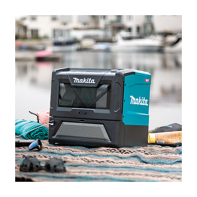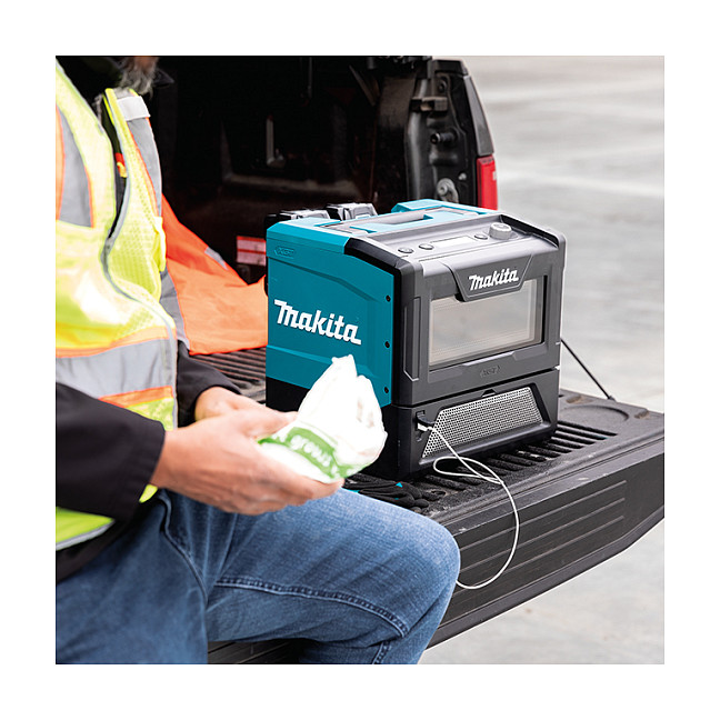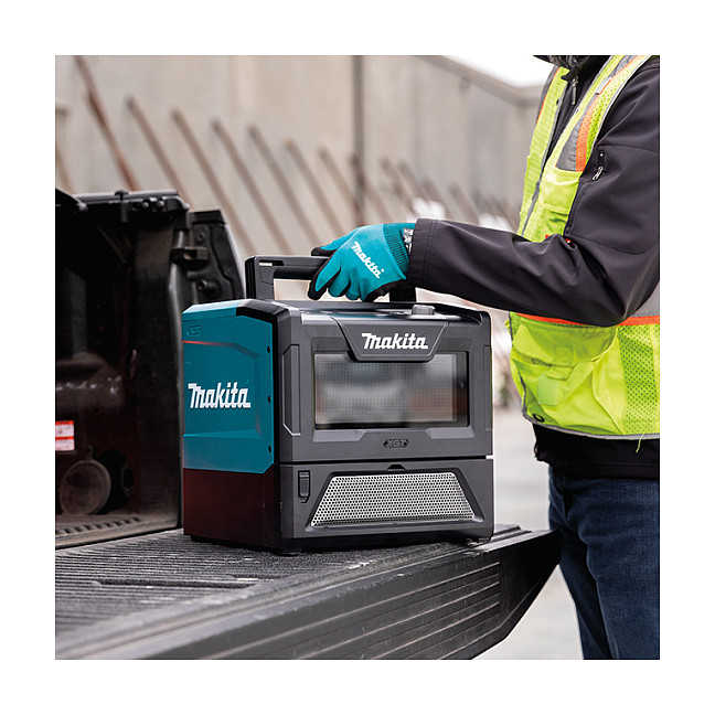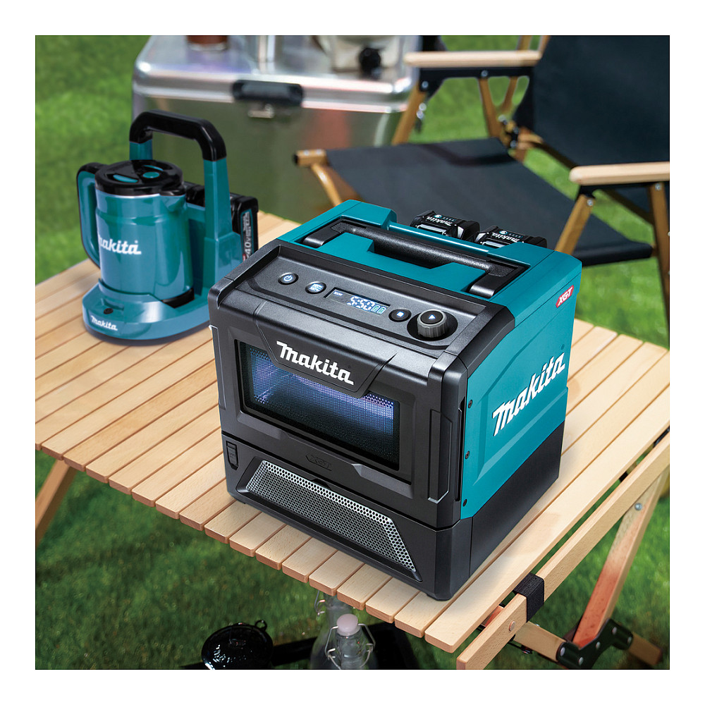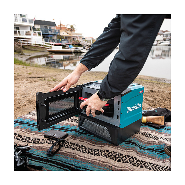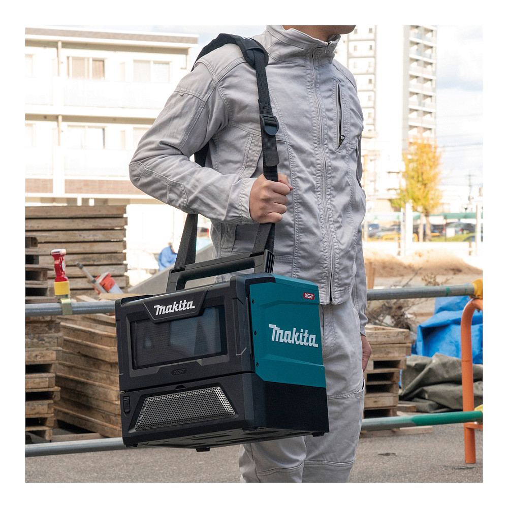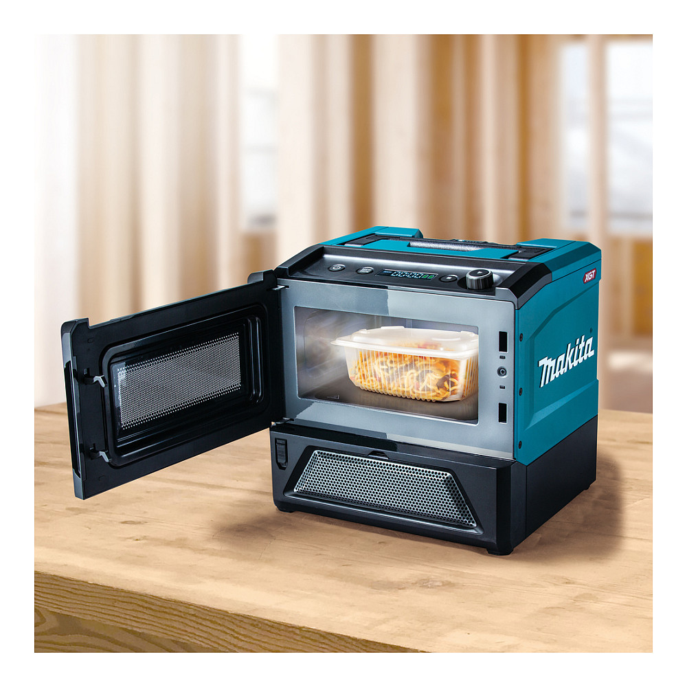 Die Akku-Mikrowelle verfügt über einen breiten, klappbaren Handgriff für einen leichten Transport. Optional kann ein Schultergurt an der Maschine befestigt werden. Die innenliegende Lampe leuchtet während des Betriebs und bei geöffneter Glastüre.