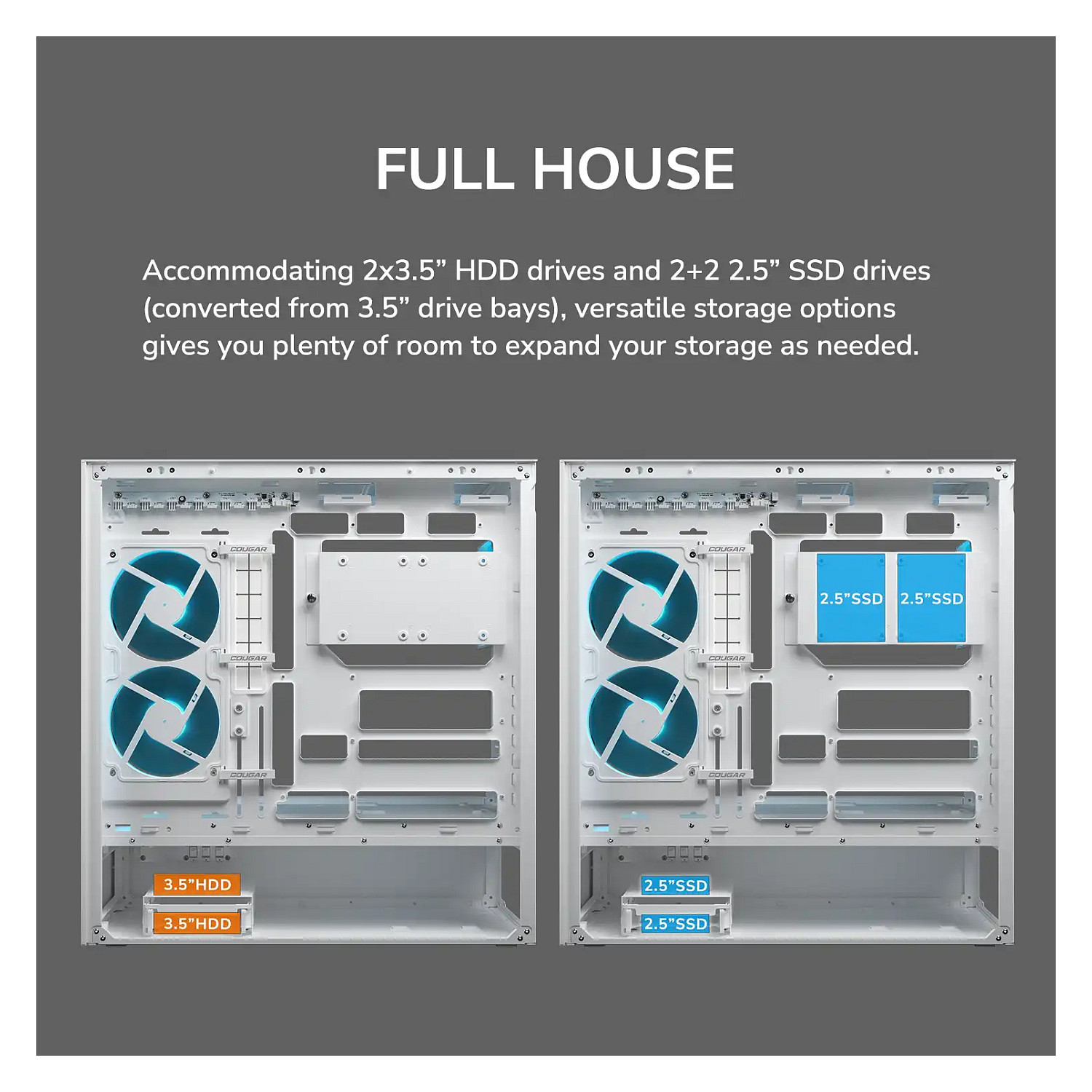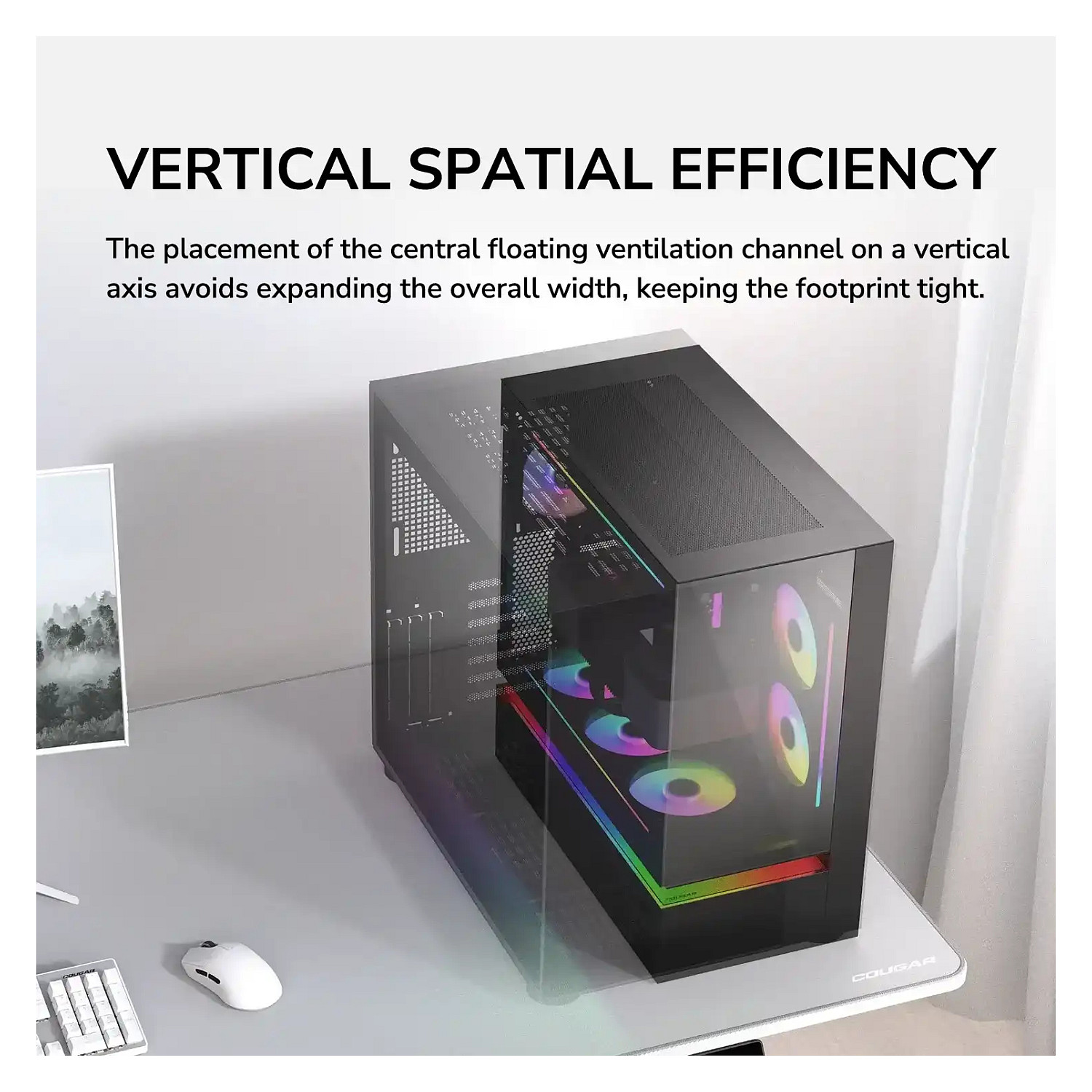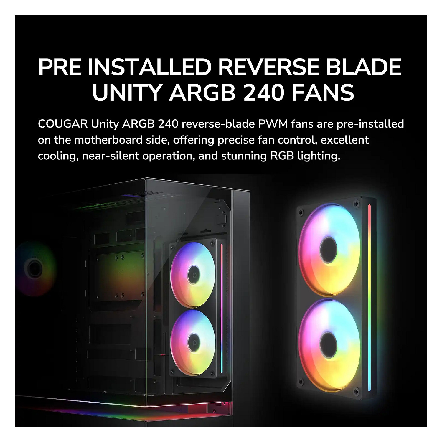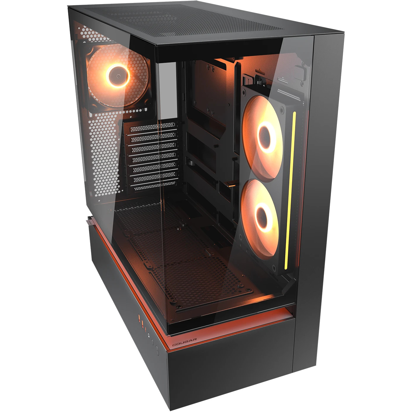 COUGAR Gehäuse Midi-Tower, CFV235, ARGB, Glas, Schwarz. Formfaktor: Midi Tower, Typ: PC, Produktfarbe: Schwarz. Installierte Lüfter seitlich: 2x 120 mm, Durchmesser unterstützte Seitenlüfter: 120 mm, Installierte Lüfter hinten: 1x 120 mm. Unterstützte Hard-Disk Drive Größen: 2.5,3.5". Breite: 235 mm, Tiefe: 493 mm, Höhe: 460 mm. Verpackungsbreite: 542 mm, Verpackungstiefe: 579 mm, Verpackungshöhe: 317 mm