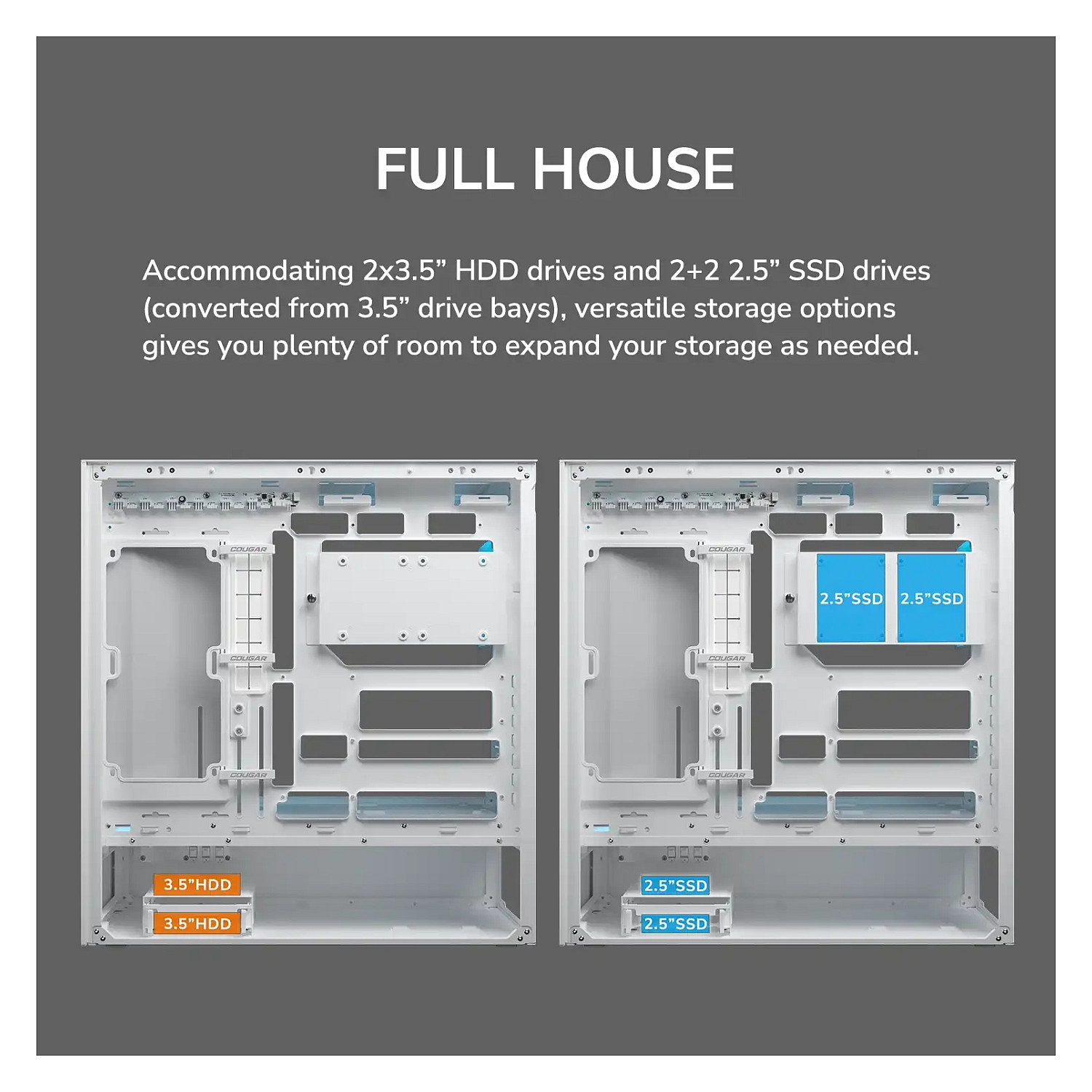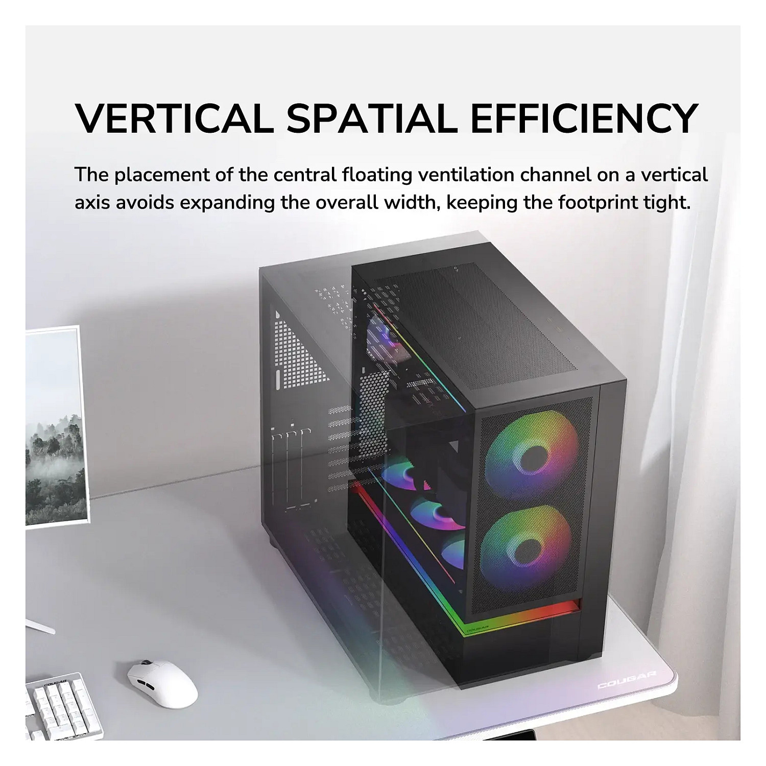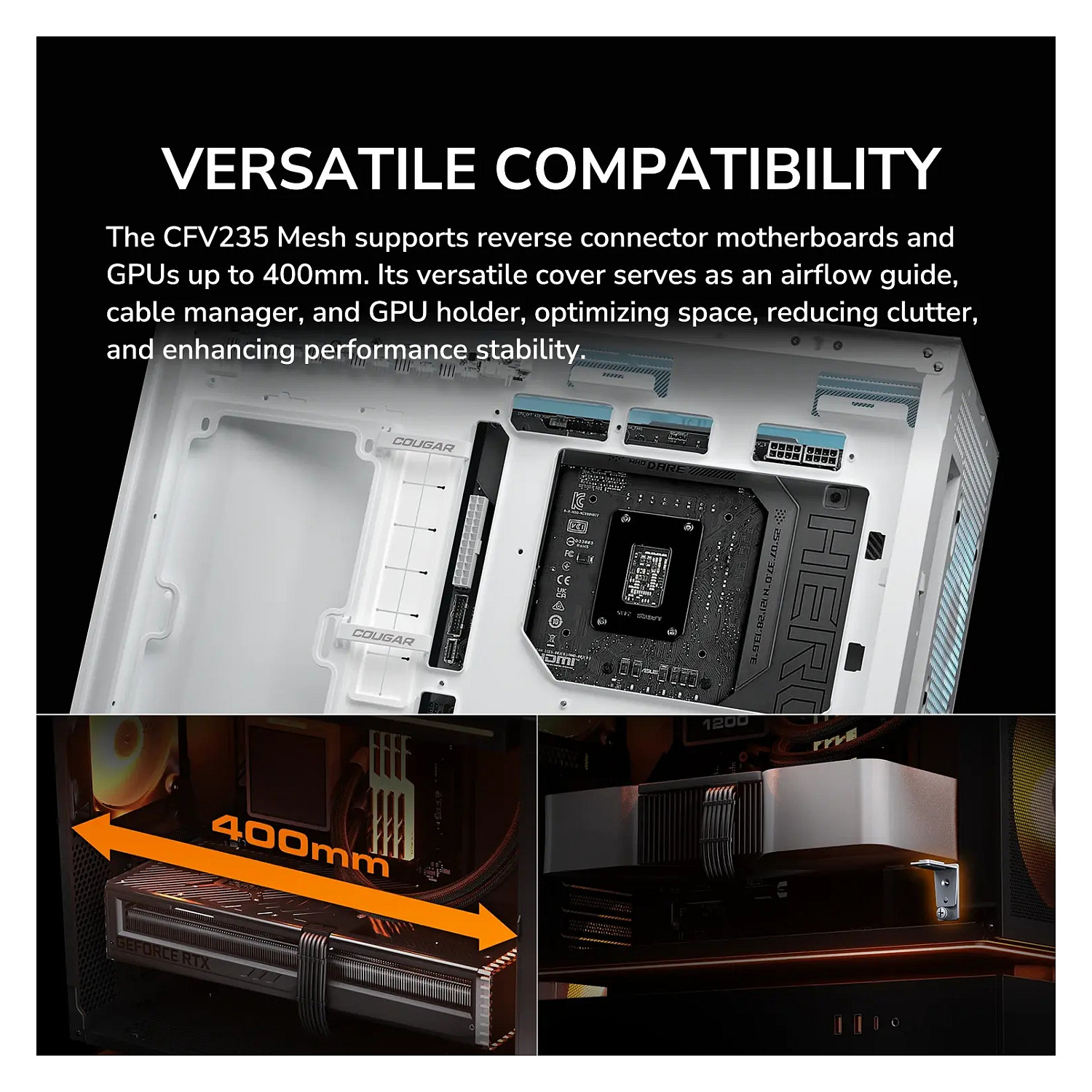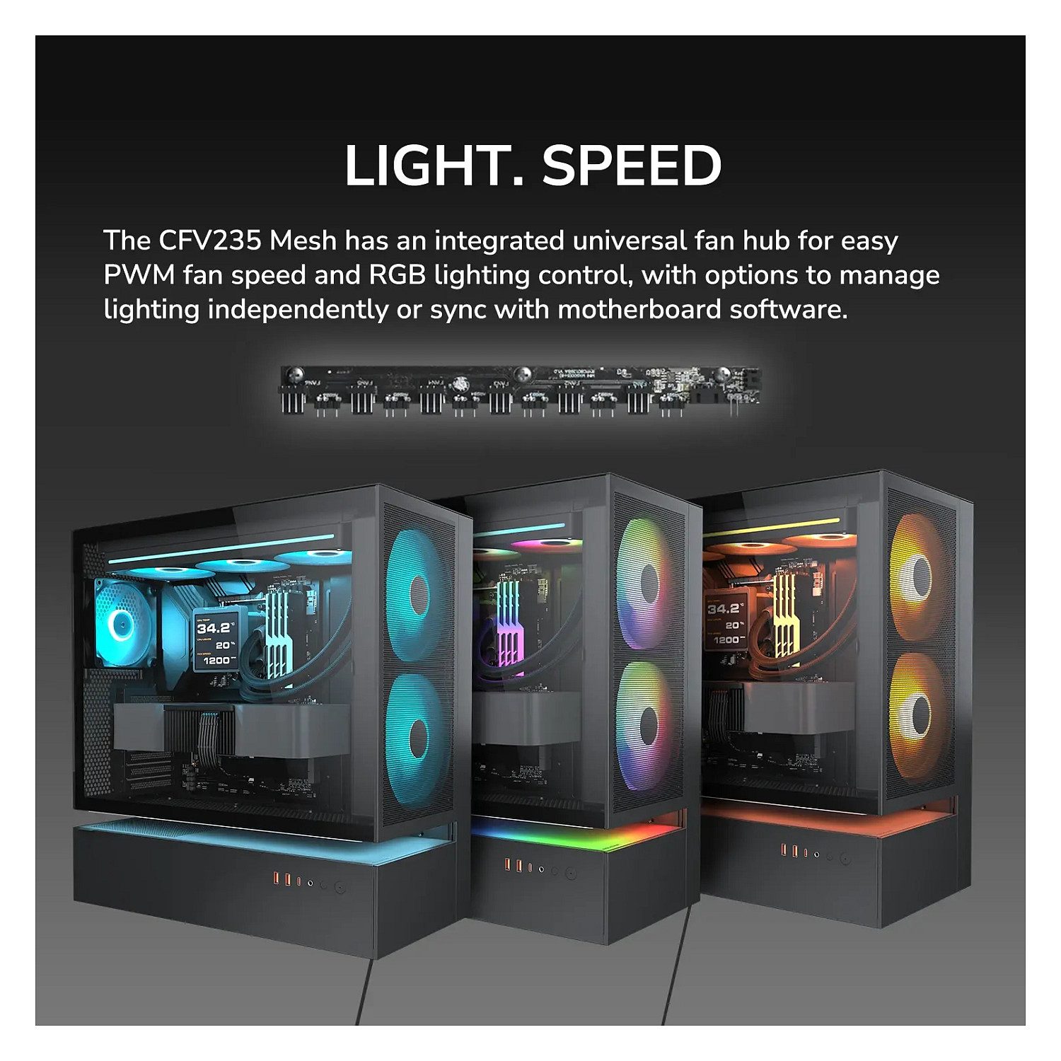 COUGAR Gehäuse Midi-Tower, CFV235, ARGB, Mesh, Schwarz. Formfaktor: Midi Tower, Typ: PC, Produktfarbe: Schwarz. Installierte Lüfter (Vorderseite): 2x 160 mm, Durchmesser unterstützte Vorderseitenlüfter: 160 mm, Installierte Lüfter hinten: 1x 120 mm. Unterstützte Hard-Disk Drive Größen: 2.5,3.5". Breite: 235 mm, Tiefe: 493 mm, Höhe: 460 mm. Verpackungsbreite: 542 mm, Verpackungstiefe: 579 mm, Verpackungshöhe: 317 mm
