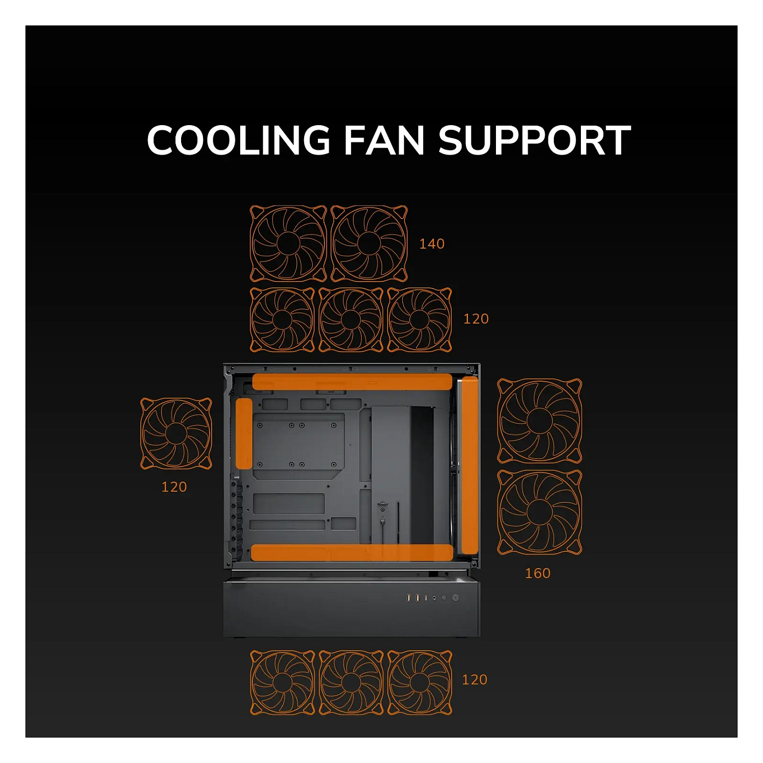 Unterstützte Lüfterdurchmesser (oben): 120,140 mm