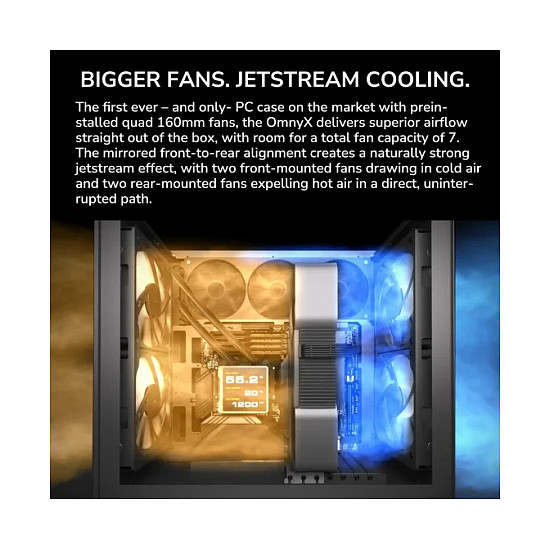Als erstes – und einziges – PC-Gehäuse auf dem Markt mit vorinstallierten Vierfach-160-mm-Lüftern liefert das OmnyX sofort nach dem Auspacken einen überragenden Luftstrom und bietet Platz für eine Gesamtlüfterkapazität von 7. Die spiegelbildliche Ausrichtung von vorne nach hinten erzeugt einen natürlich starken Jetstream-Effekt, bei dem zwei an der Vorderseite montierte Lüfter kalte Luft ansaugen und zwei an der Rückseite montierte Lüfter heiße Luft in einem direkten, ununterbrochenen Pfad ausstoßen. Eine gleichmäßige Verteilung von Lüftern mit rückwärts und vorwärts gerichteten Blättern ermöglicht flexible Ansaugmodi und sorgt für einen gleichmäßigen, richtungsbeständigen Luftstrom, ganz gleich, wie Sie Ihr Gehäuse ausrichten möchten.