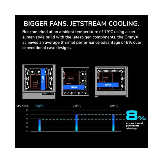 Im Benchmarking bei einer Umgebungstemperatur von 19 °C mit einem Consumer-Gehäuse mit Komponenten der neuesten Generation erreicht das OmnyX einen durchschnittlichen thermischen Leistungsvorteil von 8 % gegenüber herkömmlichen Gehäusedesigns.