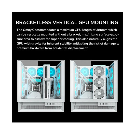 Das OmnyX bietet Platz für eine maximale GPU-Länge von 380 mm, die ohne Halterung vertikal montiert werden kann, wodurch die dem Luftstrom ausgesetzte Fläche für eine hervorragende Kühlung maximiert wird. Außerdem wird die GPU auf natürliche Weise an der Schwerkraft ausgerichtet, was für eine höhere Stabilität sorgt und das Risiko von Schäden an hochwertiger Hardware durch versehentliches Verschieben verringert.