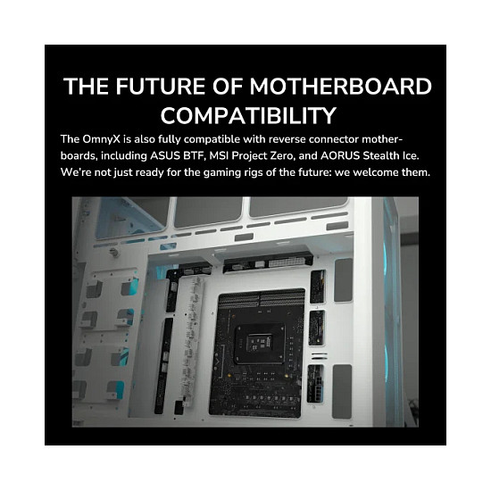 Das OmnyX ist auch vollständig kompatibel mit Motherboards mit Reverse-Anschluss, einschließlich ASUS BTF, MSI Project Zero und AORUS Stealth Ice. Wir sind nicht nur bereit für die Gaming-Rigs der Zukunft: Wir heißen sie willkommen.