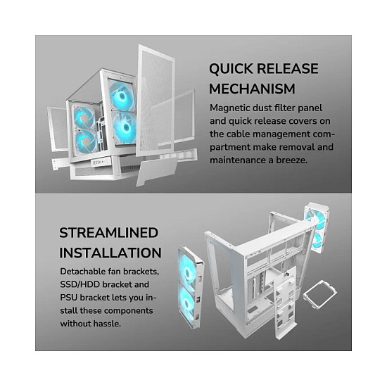 Magnetische Staubfilterabdeckung und Schnellverschlussabdeckungen am Kabelmanagementfach machen das Entfernen und die Wartung zum Kinderspiel.