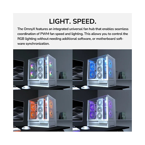 Der OmnyX verfügt über einen integrierten universellen Lüfter-Hub, der die nahtlose Koordination von PWM-Lüftergeschwindigkeit und Beleuchtung ermöglicht. So kannst du die RGB-Beleuchtung steuern, ohne dass Sie zusätzliche Software oder eine Synchronisierung der Motherboard-Software benötigen.