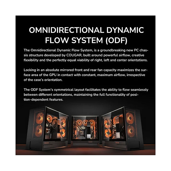 Das Omnidirectional Dynamic Flow System ist eine bahnbrechende neue PC-Gehäusekonstruktion, die von COUGAR entwickelt wurde und auf einem leistungsstarken Luftstrom, kreativer Flexibilität und der perfekten Gleichstellung von rechter, linker und mittlerer Ausrichtung basiert.