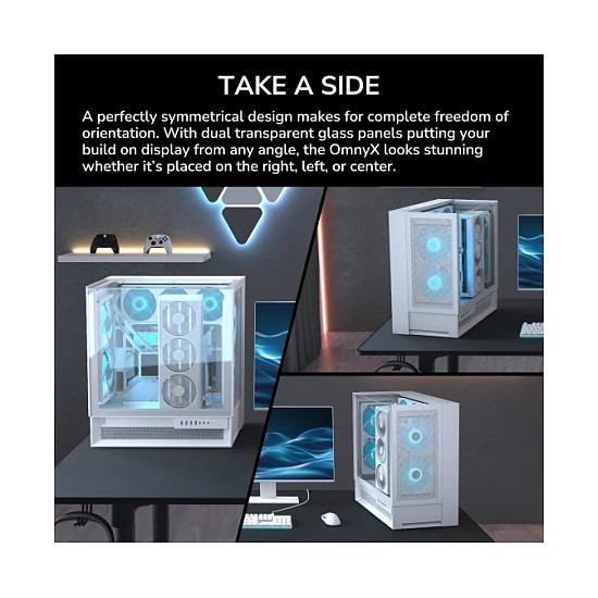 Ein perfekt symmetrisches Design sorgt für völlige Freiheit bei der Ausrichtung. Mit zwei transparenten Glasscheiben, die deinen Aufbau aus jedem Winkel zeigen, sieht das OmnyX atemberaubend aus, egal ob es rechts, links oder in der Mitte aufgestellt ist.