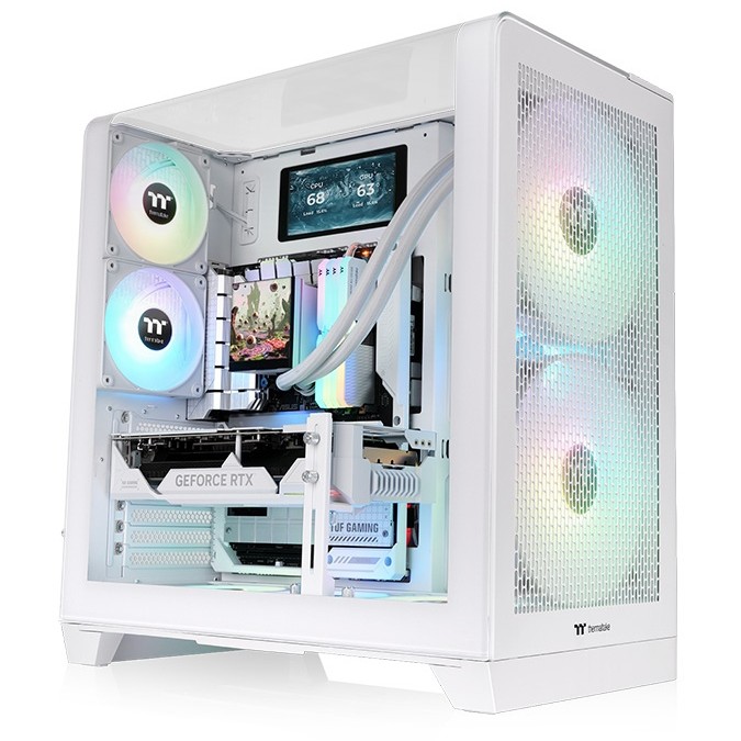 Das View 390 Air Snow Mid-Tower-Gehäuse ist ein ATX-Gehäuse mit einer gebogenen Seitenblende aus gehärtetem Glas, einer perforierten Frontblende, drehbaren PCI-E-Steckplätzen, einer GPU-Halterung und zwei CT120-Lüftern an der Rückseite. Es kann bis zu elf 120-mm-Lüfter aufnehmen und unterstützt einen 360-mm-AIO-Radiator an der Front- oder Motherboard-Seite. Ein optionales 6-Zoll-LCD-Bildschirm-Kit kann für Echtzeit-Systeminformationen und eine verbesserte Optik hinzugefügt werden.