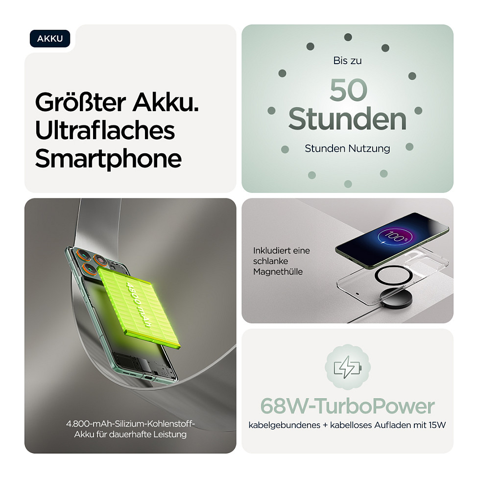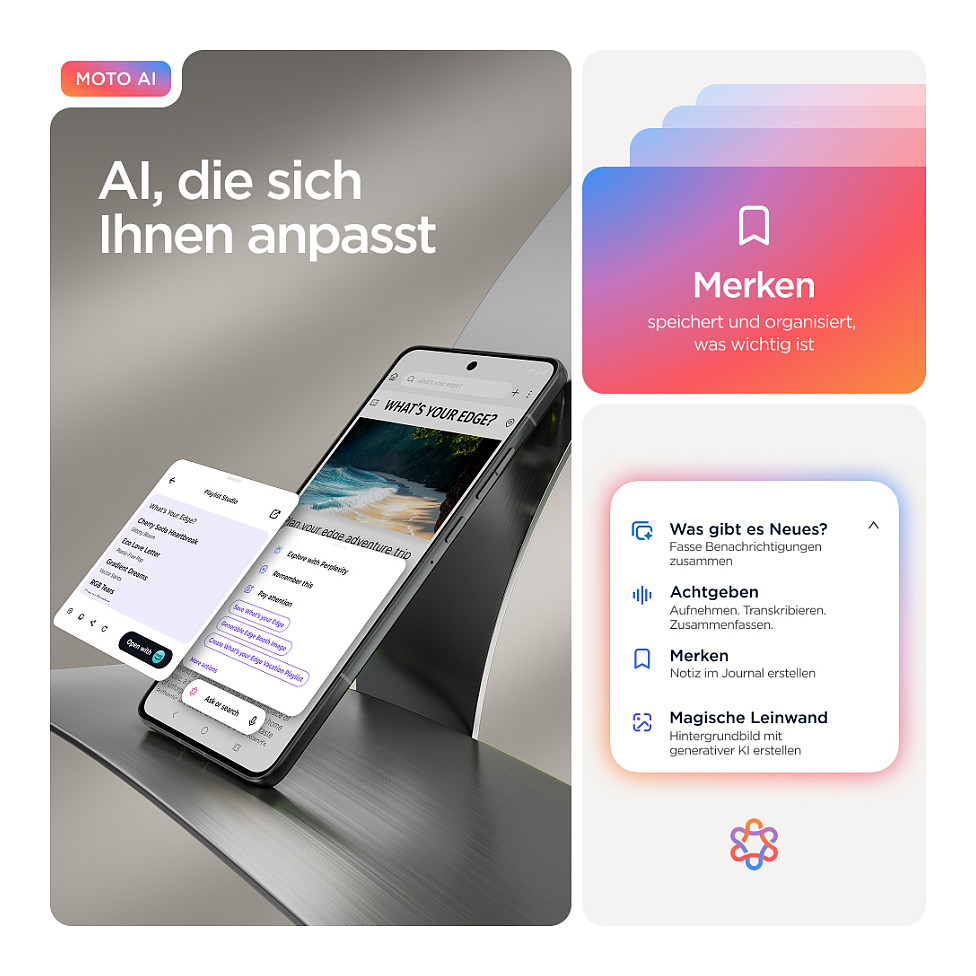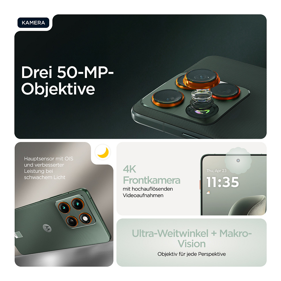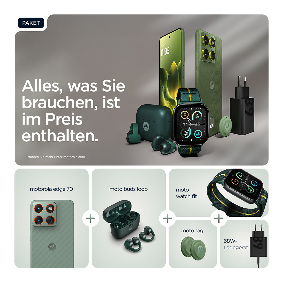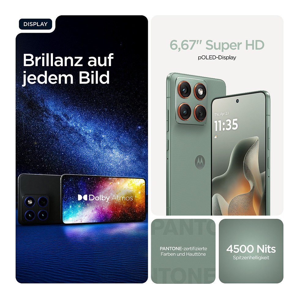 Wir präsentieren das brandneue, unglaublich dünne motorola edge 70. Es besteht aus Flugzeugaluminium mit unverwechselbarem Finish in Pantone®-Farben und definiert neu, was ein ultradünnes Smartphone alles kann. Dank der drei 50-MP-Objektive, der Leistung von moto ai und Pantone™ Validated-Farben und -Hauttöne wird jede Aufnahme zu einem Erfolg.(1) Zusätzlich sorgt ein neuer Silizium-Kohlenstoff-Akku dafür, dass dir auf deinen Abenteuertouren nicht der Strom ausgeht – ohne Kompromisse beim schlanken Design. Es sieht nicht nur schick aus. Es hält auch besonders lange. Auf den Unterwasserschutz und die Widerstandsfähigkeit gemäß Militär-Standard kannst du dich verlassen.(2, 3) Auf dem 6,7-Zoll-Super-HD-Display (1220p / 1,5K) siehst du alles unglaublich detailliert. Darüber hinaus kommt es mit der Leistung der Snapdragon® 7 der 4. Generation und jeder Menge Speicherplatz. Damit übertrifft das motorola edge 70 alle Erwartungen.