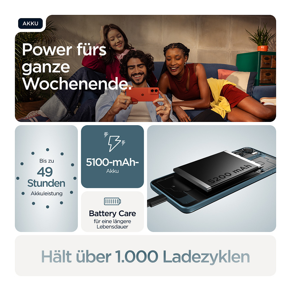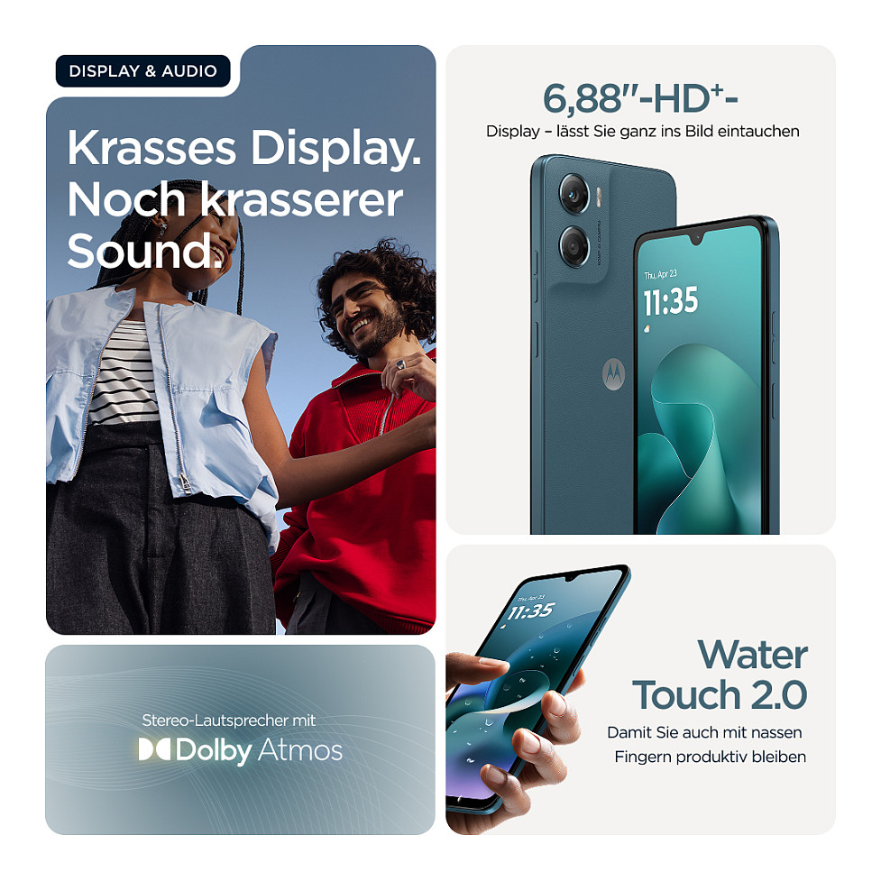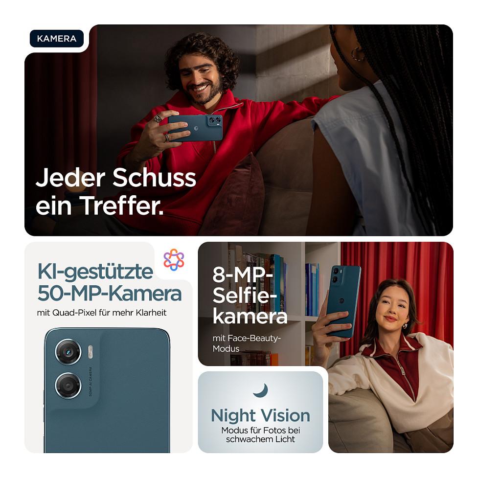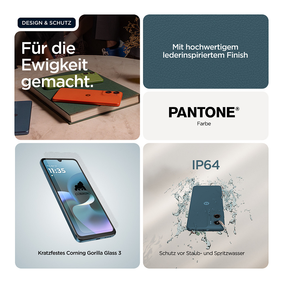 Wir präsentieren das moto g06 – ein Smartphone, das deine Erwartungen weit übertreffen wird. Erwecke deine Lieblingssendungen und -filme zum Leben auf einem riesigen, hellen 6,88” Display, unserem bisher größten auf dem moto g, mit Stereo-Lautsprechern und Dolby Atmos®-Sound. Mit dem AI-basierten 50-MP-Kamerasystem machst du atemberaubende Fotos bei jedem Licht.(1) Supereffizientes Multitasking mit bis zu 12 GB RAM mit RAM-Boost.(2,5,6,10) Alles ganz entspannt dank erweiterter Funktionen für eine längere Lebensdauer und Premiumdesign, darunter IP64-Wasserschutz(3), Corning® Gorilla® Glass 3 und veganem Lederfinish. Mit einmal Laden bist du 2 Tage dabei.(4) Und exklusive Moto-Funktionen machen dein Smartphone sicherer, individueller und unterhaltsamer. Mit Circle-to-Search kannst du sofort alles auf deinem Smartphone suchen. Hol dir mehr mit dem moto g06.