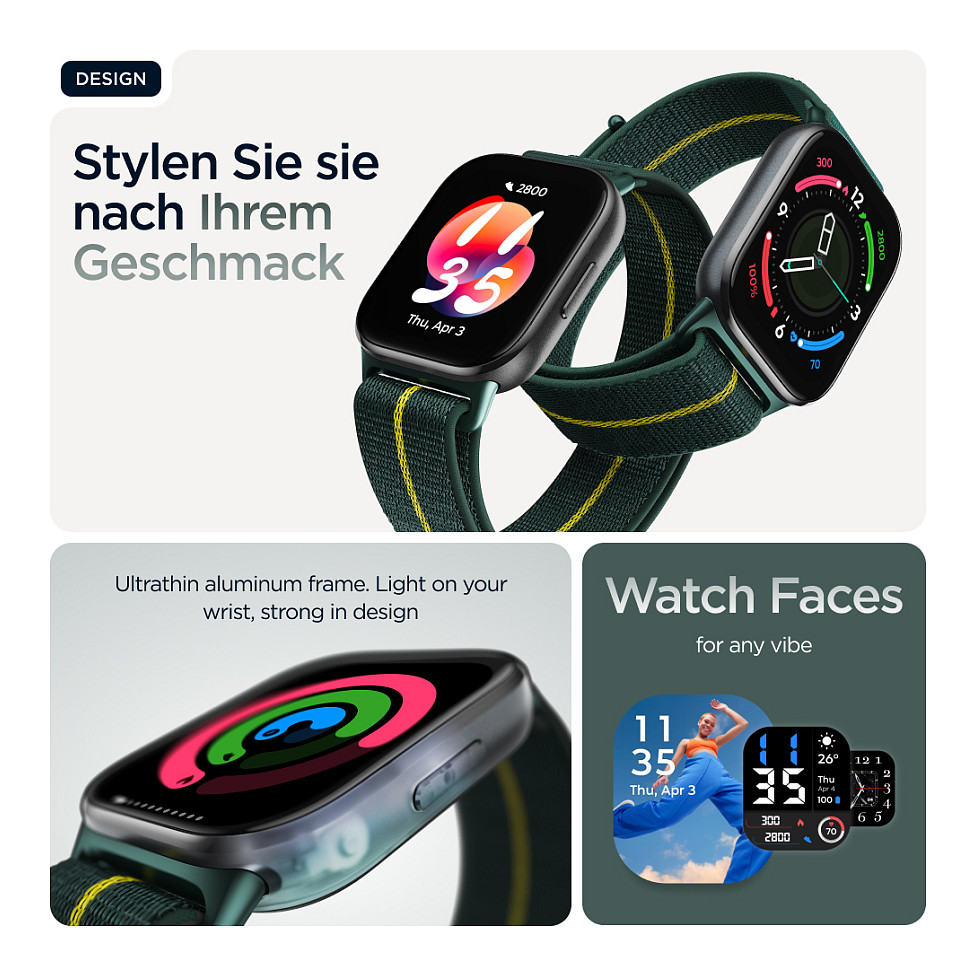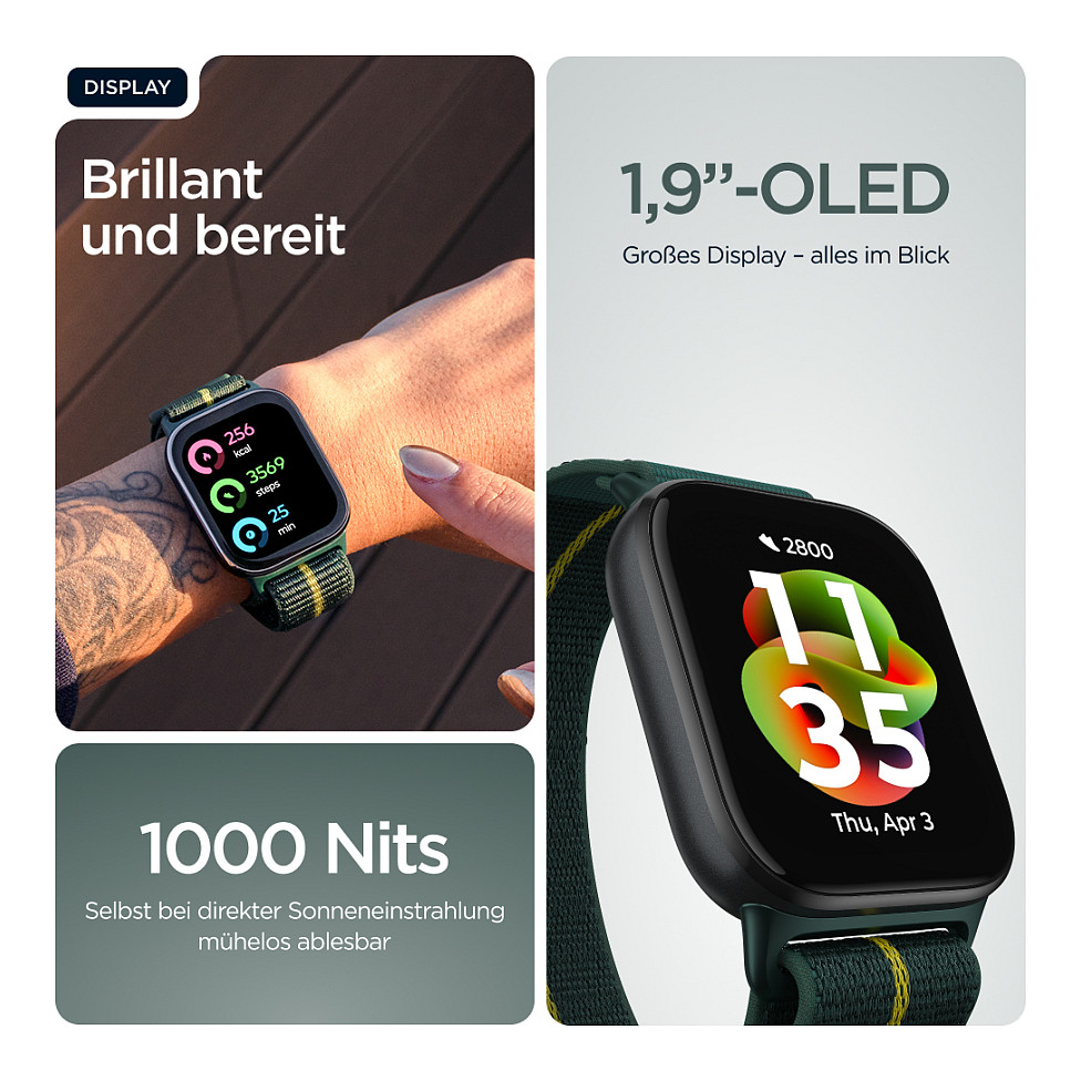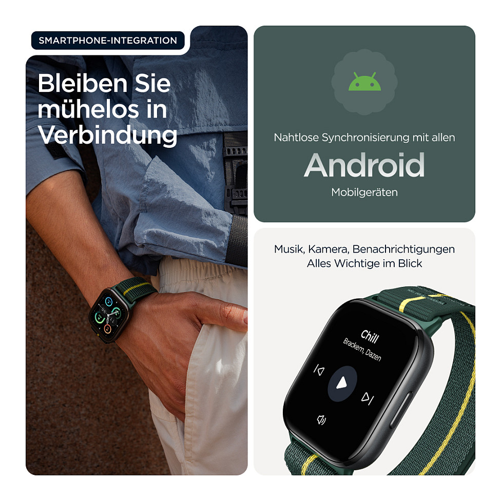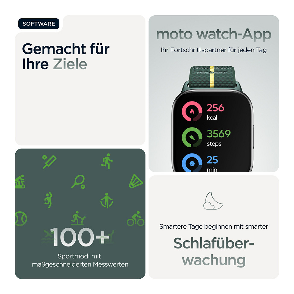 Endlich eine Smartwatch, mit der du stylisch in Form bleibst. Die neue moto watch fit ist da. Auf dem großen, hellen 1,9"-OLED-Display hast du deine Fitnessdaten jederzeit im Blick. Genieße das schlanke, ultraleichte Design und eine Auswahl kompatibler Armbänder(1) und Zifferblätter, darunter das Trekking Green-Armband von Pantone™. Bleib dank nahtloser Android™-Integration(2) immer in Verbindung – etwa um einen Musiktrack zu überspringen oder eine Benachrichtigung anzusehen. Verbessere deine Fitness mit fortschrittlichem Fitness- und Gesundheitstracking. Dank IP68-Wasserschutz(3), einer Druckfestigkeit von 5 ATM und Corning® Gorilla® Glass(3) ist deine Uhr bestens geschützt. Und mit bis zu 16 Tagen Akkulaufzeit(4) hast du genug Power für endlose Workouts. Die moto watch fit – stylisch und smart in jeder Hinsicht.