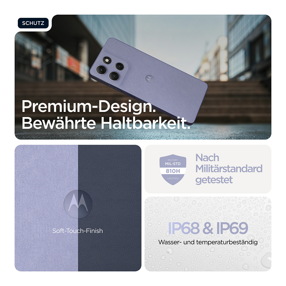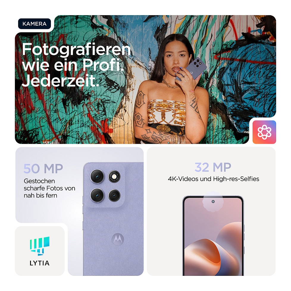 Motorola moto g86 5G . Bildschirmdiagonale: 16,9 cm (6.67"), Display-Auflösung: 2712 x 1220 Pixel. Prozessorfamilie: MediaTek Dimensity, Prozessor: 7300. RAM-Kapazität: 8 GB, Interne Speicherkapazität: 256 GB. Auflösung Rückkamera (numerisch): 50 MP, Rückkamera-Typ: Dual-Kamera. SIM-Kartensteckplätze: Dual-SIM. Installiertes Betriebssystem: Android 15. Akku-/Batteriekapazität: 5200 mAh. Produktfarbe: Lila. Gewicht: 185 g