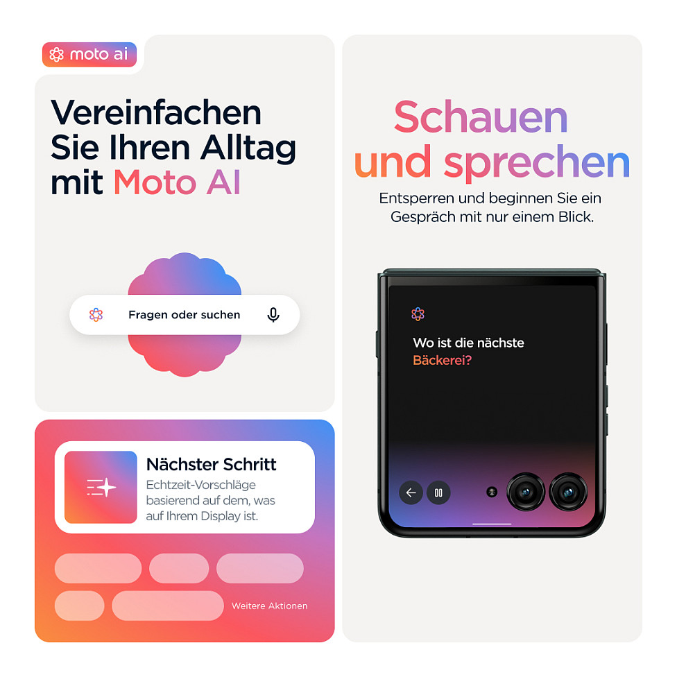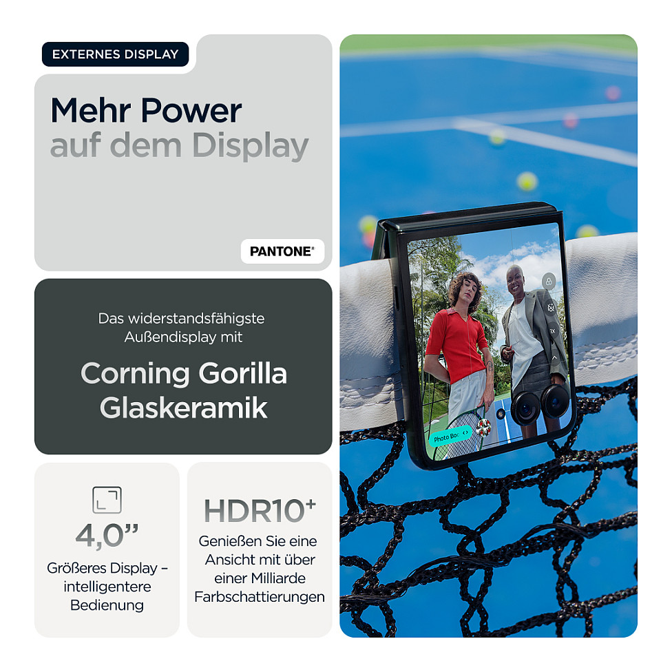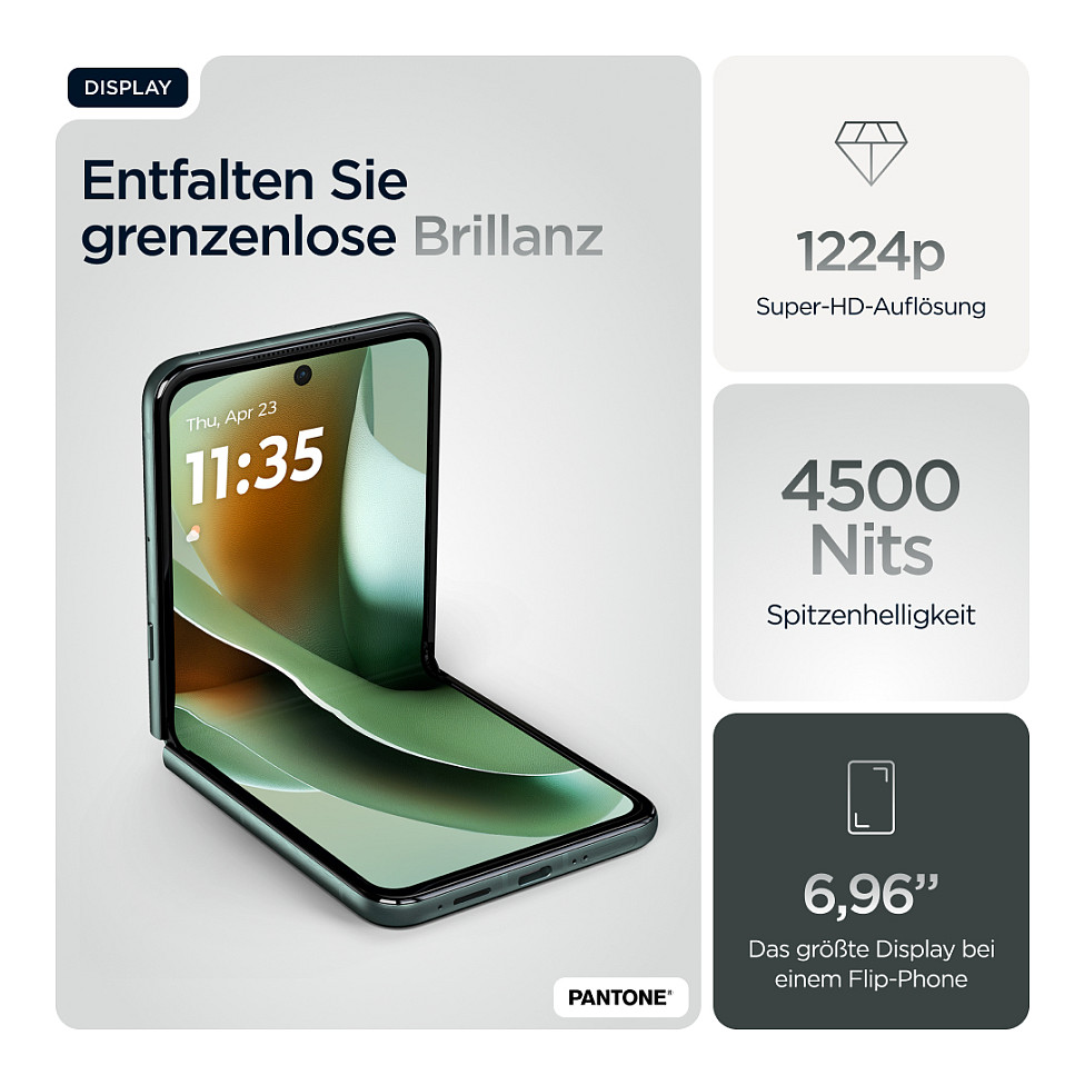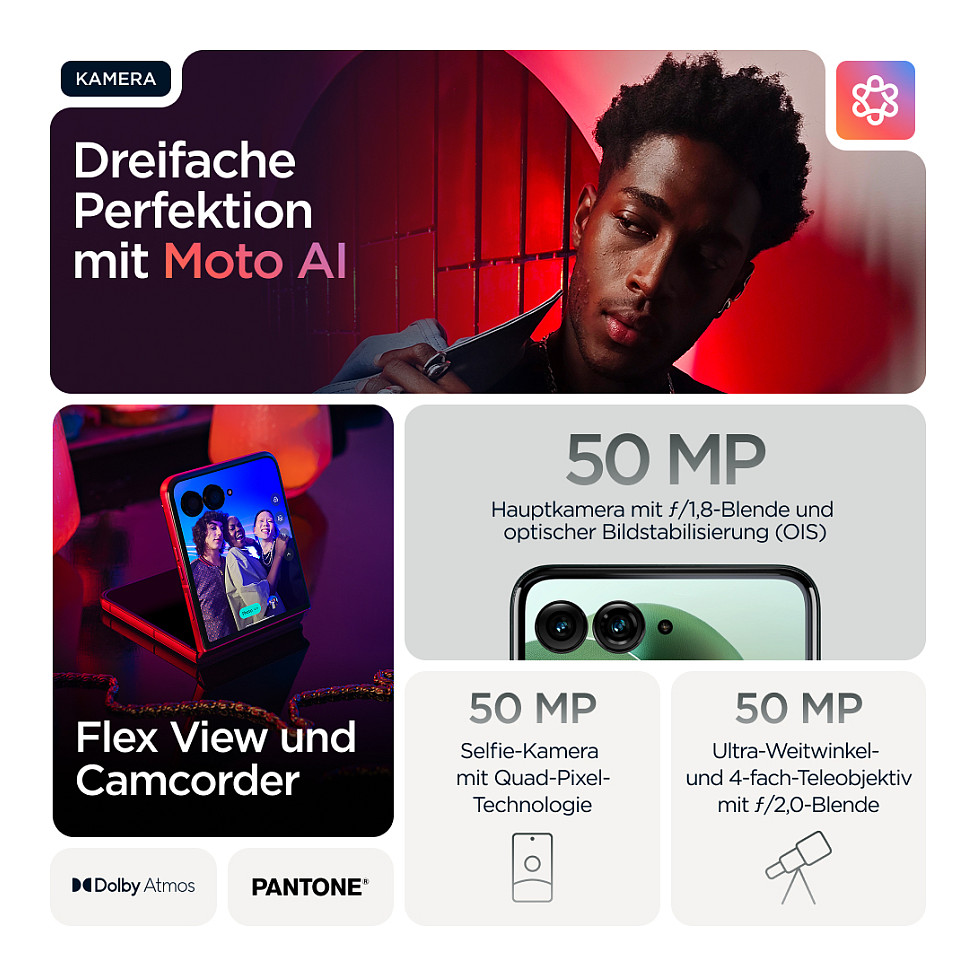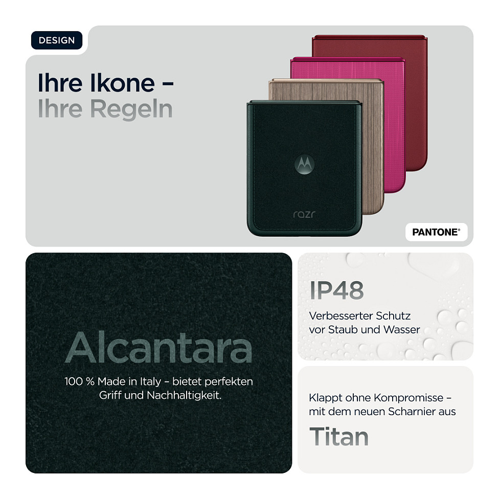 Smarter. Schneller. Ikonischer. Hier kommt das neue motorola razr 60 ultra. Ultrakompakt und meisterhaft verarbeitet, besticht es durch markante Finishes wie Alcantara®(43) und echtes Holz sowie sorgfältig ausgewählten Pantone™-Farben. Auf dem intelligentesten und interaktivsten Außendisplay hast du einfachen Zugriff auf deine Lieblings-Apps, ohne das Smartphone aufklappen zu müssen. Nimm Fotos und Videos wie ein Profi auf und profitiere dank der nahtlosen Integration von Moto AI(1) von deinem persönlichen Assistenten. Beschleunige alles mit der branchenführenden Snapdragon® AI-Performance. Und genieße dank 68W-TurboPowerTM das schnellste Aufladen aller Flip-Phones.(2) Das neue motorola razr 60 ultra. Wie für dich gemacht.