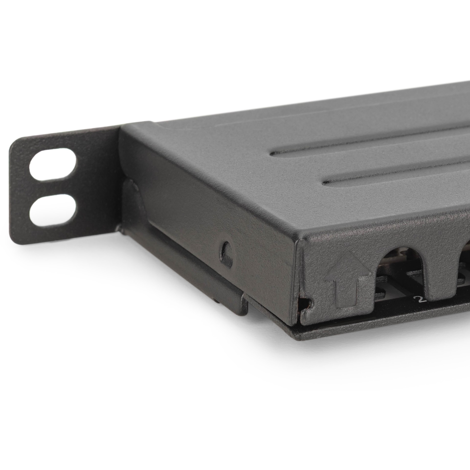 Das DIGITUS® 24-Port 0,5HE Patch Panel bietet Ihnen eine hohe Packdichte. Da das Panel nur 0,5HE hoch ist, können auf 1HE 48 Ports (2 Panels mit jeweils 24 Port) installiert werden.CAT 6 Patch Panel, geschirmt, 24-Port RJ45 mit Klappen, 8P8C, LSA, 0,5HE, 19" Rack Mount, sw