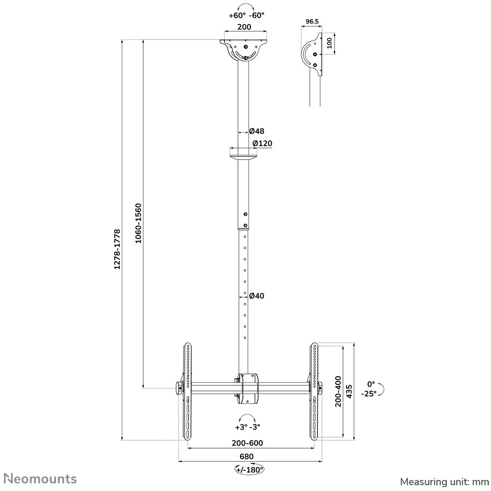 Die Neomounts CL35-440BL16L ist eine vollbewegliche Deckenhalterung für Flachbildschirme bis zu 70". Durch die einzigartige Neigungs- (25°) und Schwenkfunktion (360°) lässt sich die Halterung auf den optimalen Blickwinkel einstellen. Für die perfekte Installation ist eine Höhenverstellung möglich.