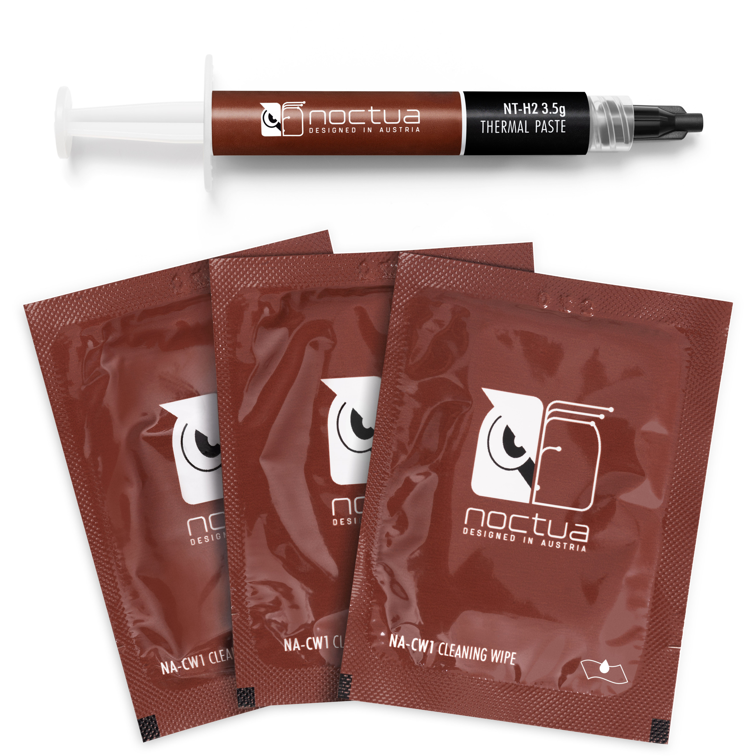 Die 3,5g-Packung wird mit drei großen, mit einer speziellen Wirkstofflösung befeuchteten NA-CW1 Reinigungstüchern ausgeliefert, mit denen die Entfernung von NT-H2 zu einem Kinderspiel wird: Wischen Sie die Paste einfach mit einem der Tücher von der CPU sowie von der Kontaktfläche des Kühlers ab und schon sind Sie fertig!