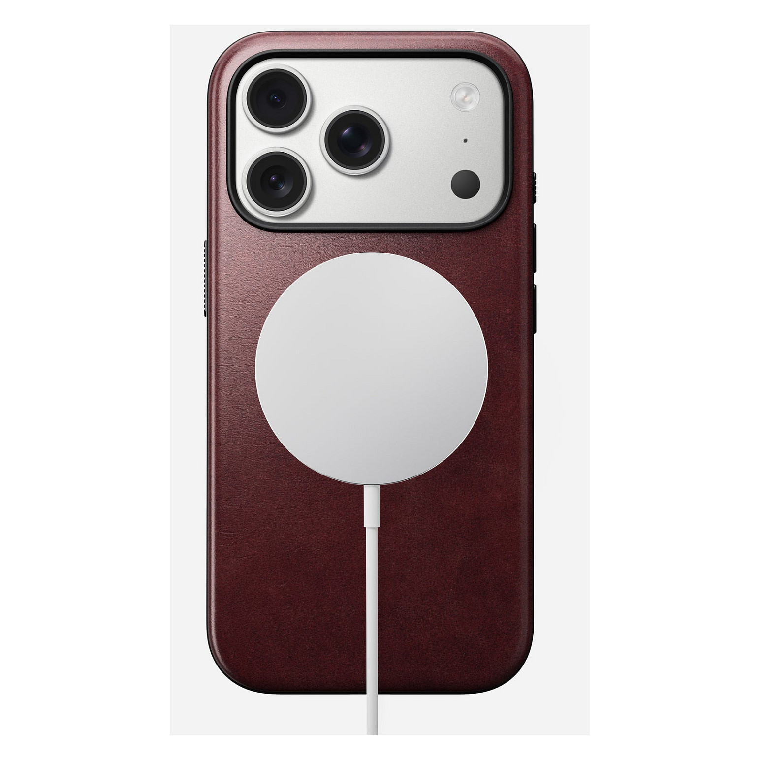 Nomad Modern Leather Case. Etui-Typ: Cover, Markenkompatibilität: Apple, Kompatibilität: iPhone 17 Pro, Maximale Bildschirmgröße: 16 cm (6.3"), Oberflächenfärbung: Einfarbig, Produktfarbe: Bordeaux