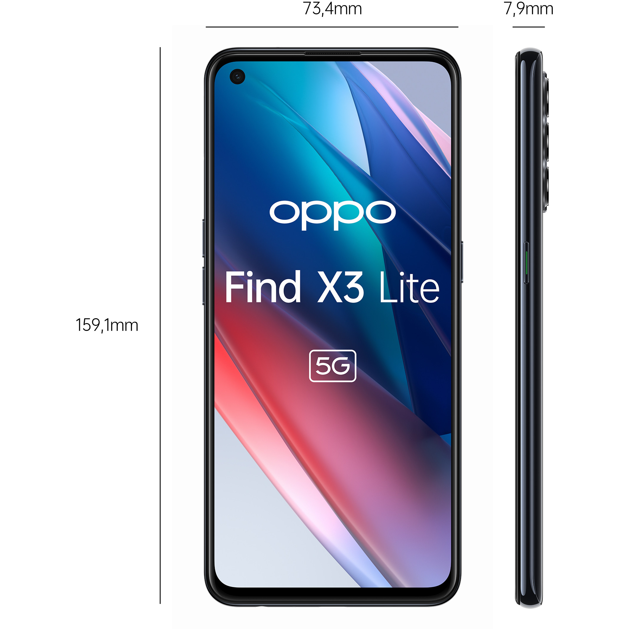 OPPO Find X3 Lite . Bildschirmdiagonale: 16,3 cm (6.43"), Display-Auflösung: 2400 x 1080 Pixel. Prozessorfamilie: Qualcomm Snapdragon, Prozessor: 765G. RAM-Kapazität: 8 GB, RAM-Typ: LPDDR4X, Interne Speicherkapazität: 128 GB. Auflösung Rückkamera (numerisch): 64 MP, Rückkamera-Typ: Quad-Kamera. SIM-Kartensteckplätze: Dual-SIM. Installiertes Betriebssystem: ColorOS 11.1. Akku-/Batteriekapazität: 4300 mAh. Produktfarbe: Schwarz. Gewicht: 172 g